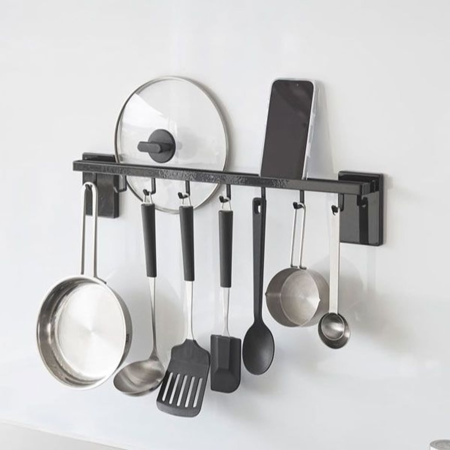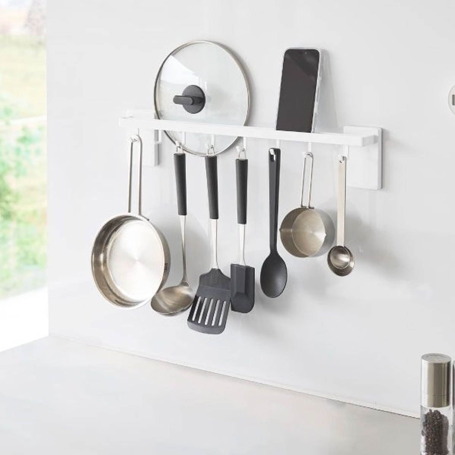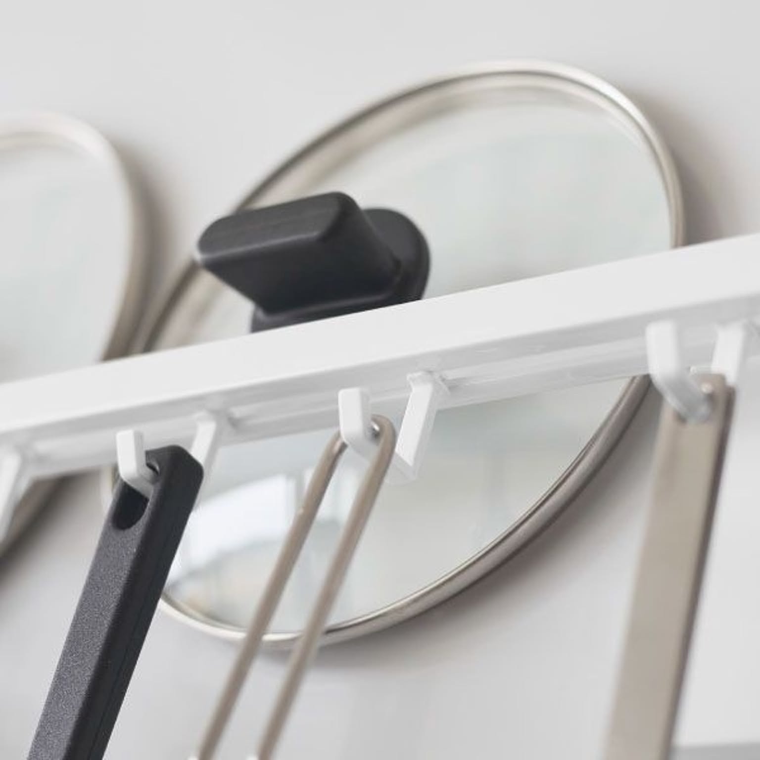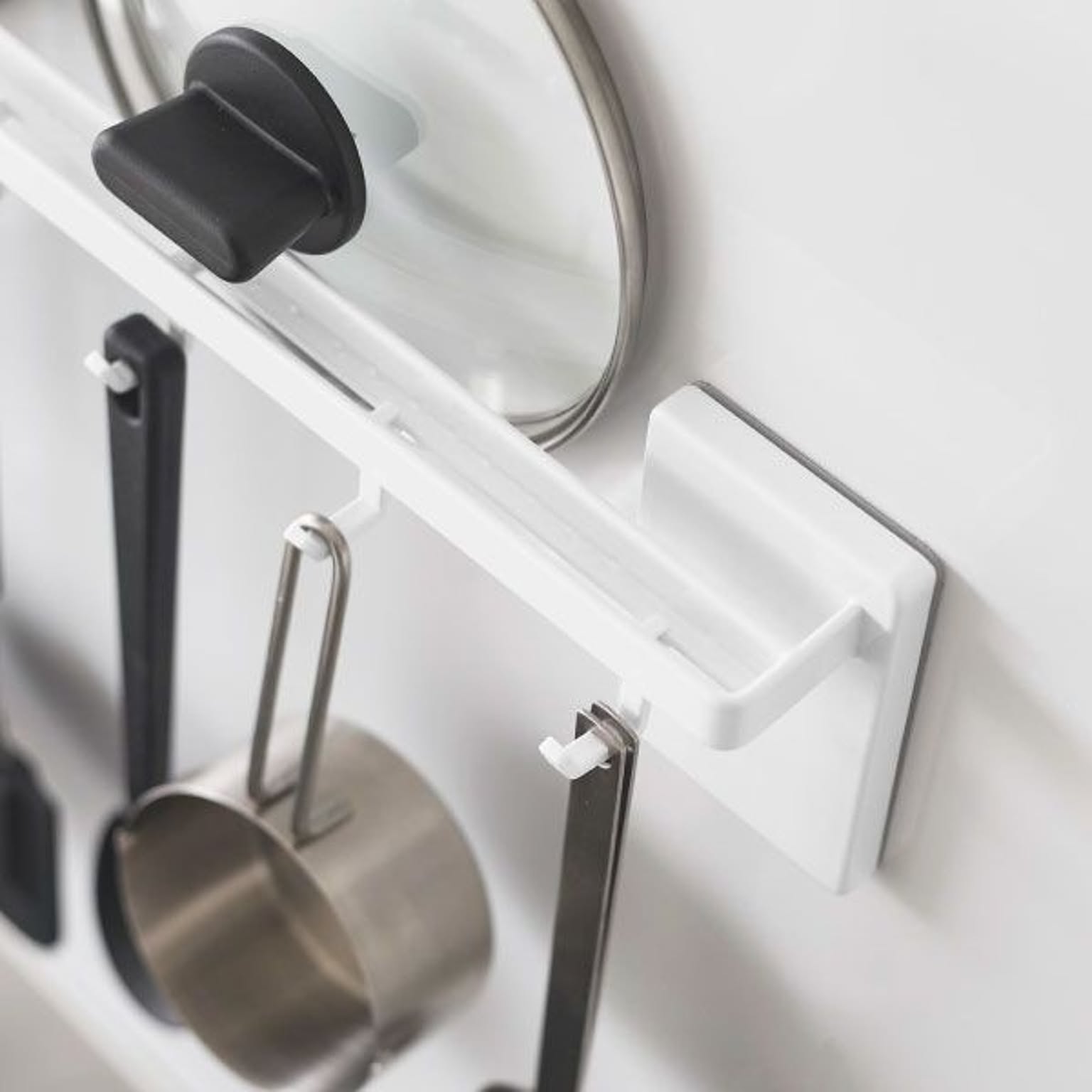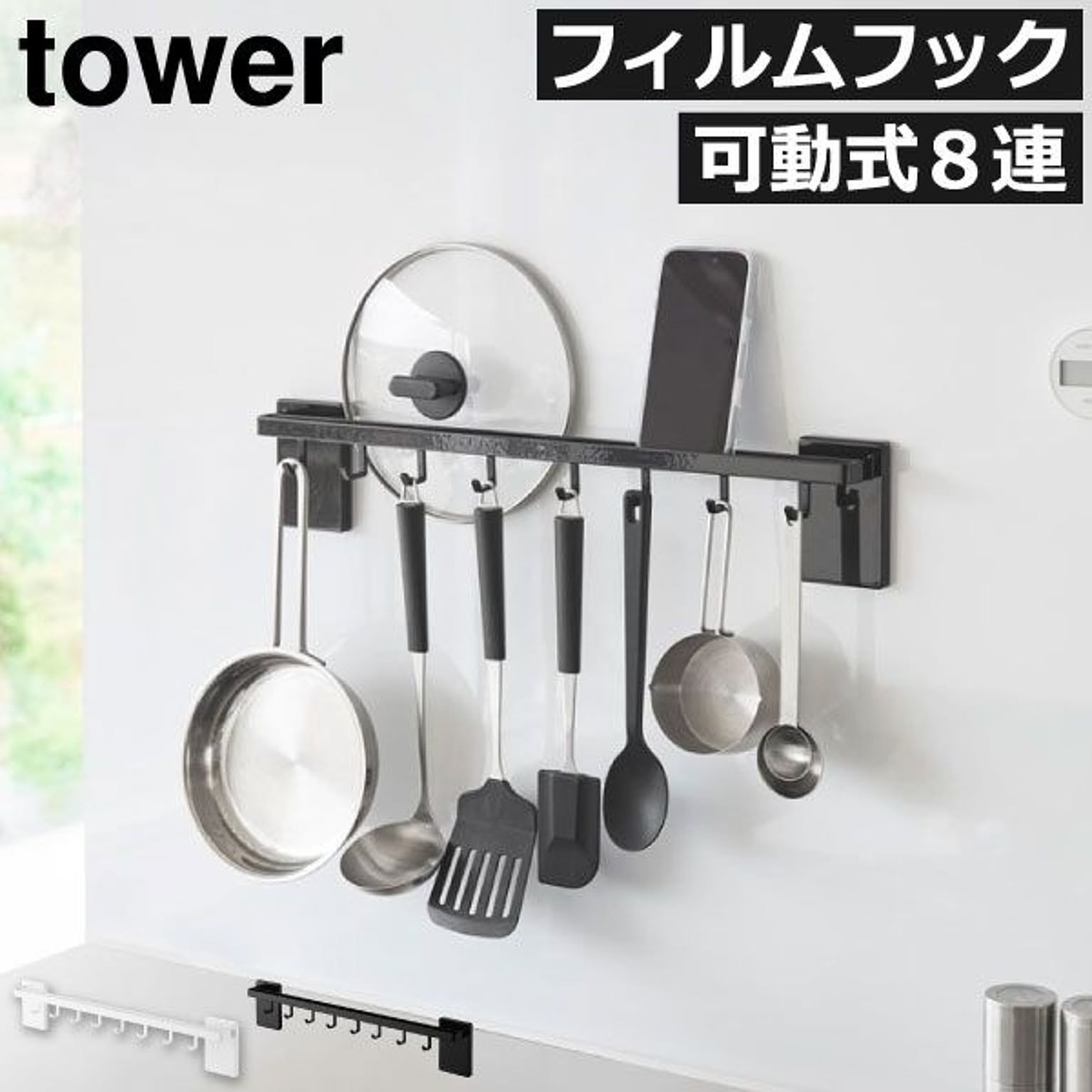 よく使うキッチンツールを吊り下げて収納できる、便利でおしゃれな鍋ふた収納です。 シンプルおしゃれな鍋ふたスタンドだから、様々なキッチンに馴染んでくれます。 光沢のある壁面にぴたっと貼って使える、フィルムフックタイプの鍋ふたスタンド。 8連タイプの鍋ふた収納フックなので、お玉やフライ返し、調理スプーンやゴムベラなど、 よく使う調理器具を一か所にまとめて収納できて便利です。 キッチンツールフックは1つ1つ動かせる可動式で、収納したい物のサイズに合わせて、 気軽にフックの位置を変更することができます。 鍋ふたスタンドと設置面とのスペースを活かして、置き場に困る鍋蓋をすっきり収納。 鍋ふた収納にはミゾがあり、スマホスタンドとしても使うことが可能。 料理中にスマホでレシピを見たり、料理動画を見たりする際に便利な鍋ふた収納です。 鍋ふたスタンドはとてもスリムな奥行きなので、圧迫感を与えずコンパクトに収納できます。 鍋ふたスタンド本体は、丈夫なスチール製で長くお使いいただけます。 表面にはユニクロメッキ+粉体塗装が施されていて、水や汚れに強いのも特徴です。 鍋ふたスタンドの色は、ホワイトとブラックの2色からお選びいただけます。 towerシリーズのおしゃれな鍋ふた収納を使って、より快適なキッチンに。