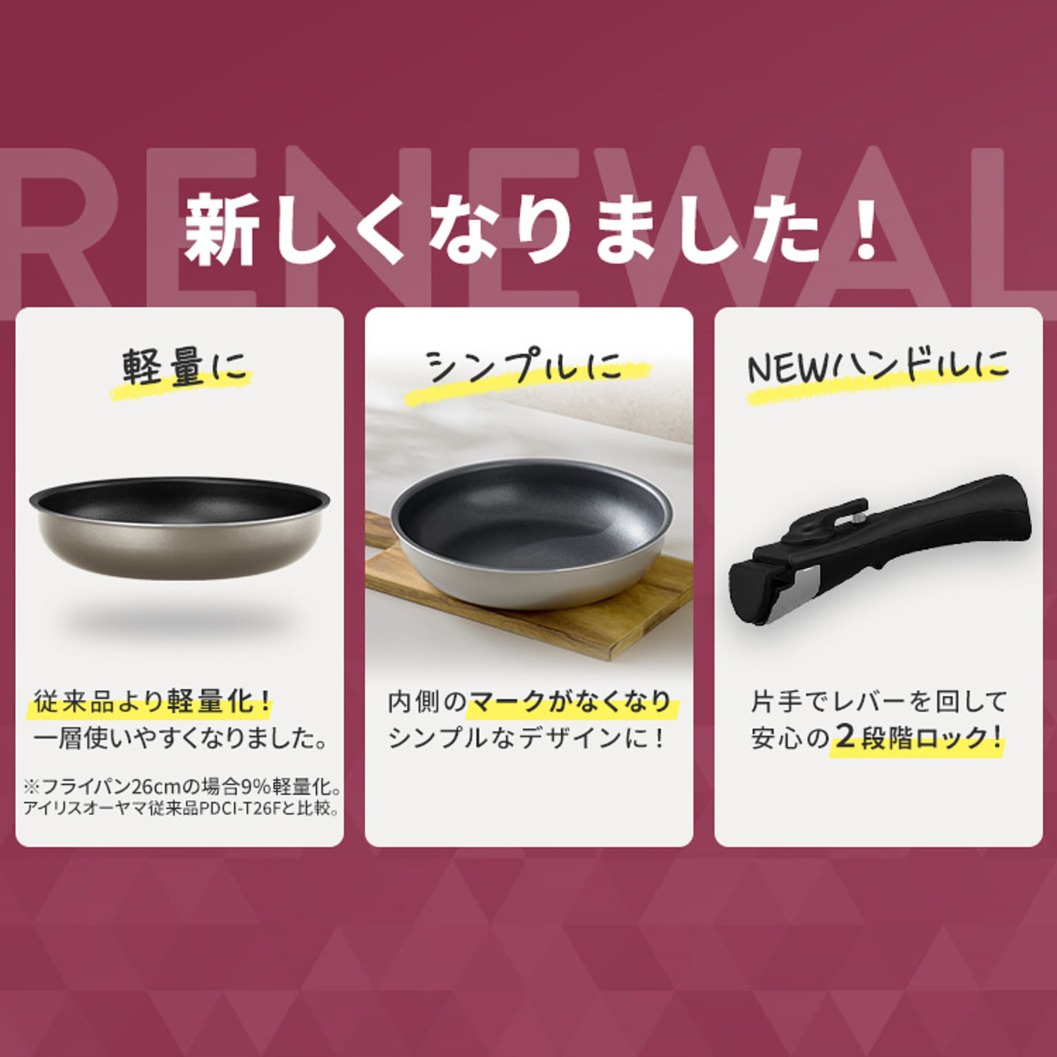 | フライパン | [表面加工(内側/外側)]ふっ素樹脂塗膜加工/(底面を除く)焼付け塗装[材料の種類]本体:アルミニウム合金、はり底:ステンレス鋼(クロム16%)、底の厚さ:2.6mm(はり底含む)[商品サイズ(cm)]20cm:直径約21.8×高さ約4.5、26cm:直径約28.1×高さ約6[商品質量]20cm:約300g、26cm:約600g[満水容量]20cm:1.1L、26cm:2.7L |