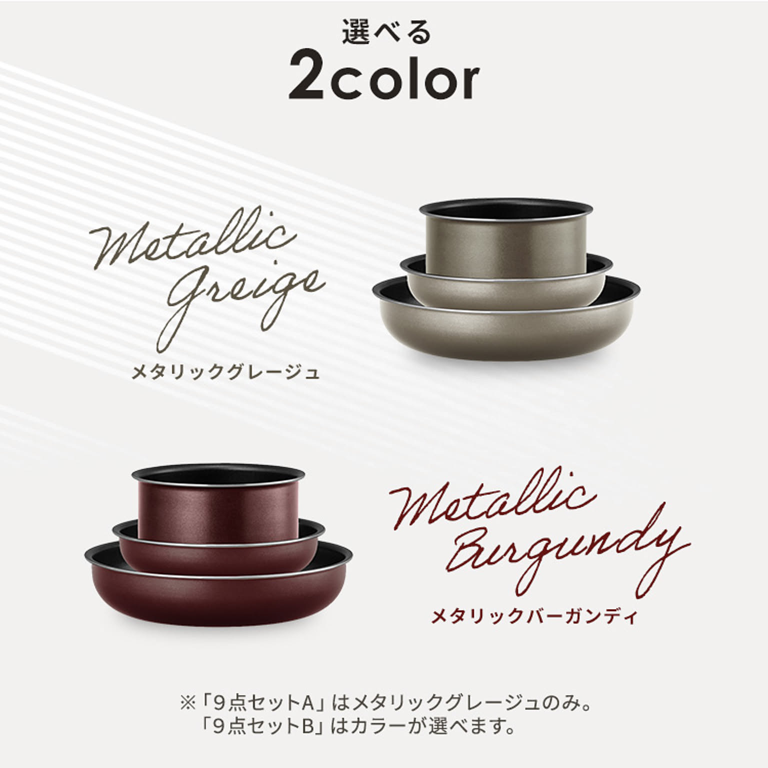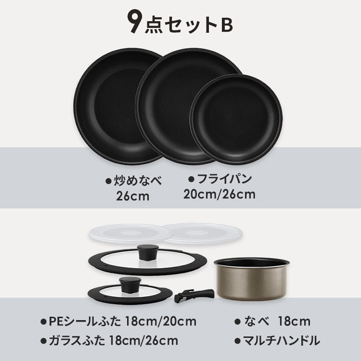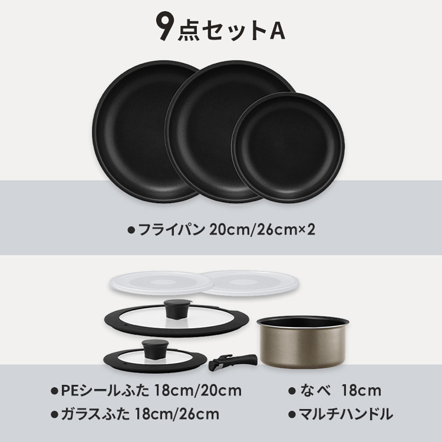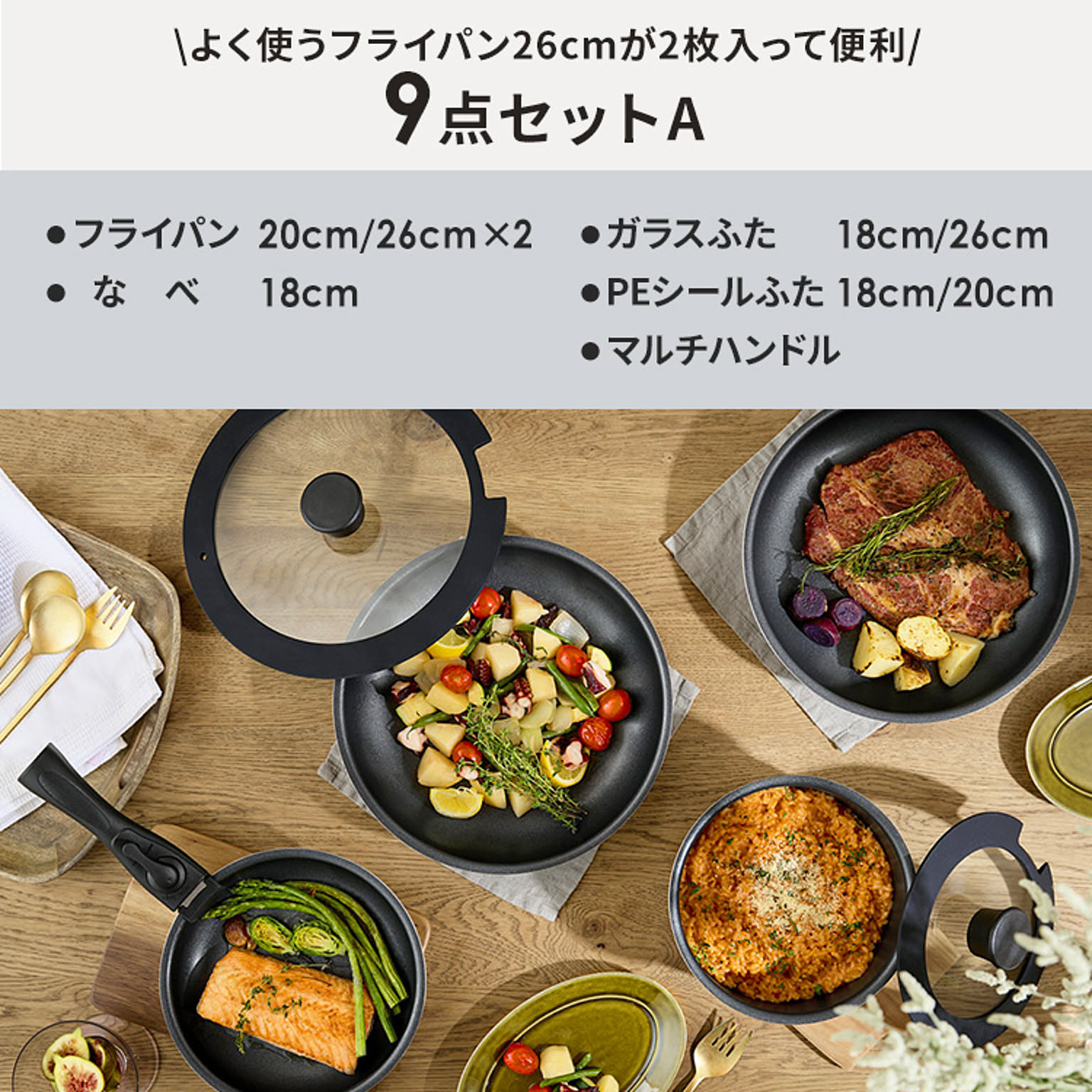 | セット内容 | [A:フライパン20cm/26cm×2、鍋18cm、ガラスふた18cm/26cm、シールふた18cm/20cm、ハンドル][B:・フライパン20cm/26cm、炒め鍋26cm、鍋18cm、ガラスふた18cm/26cm、シールふた18cm/20cm、ハンドル] |