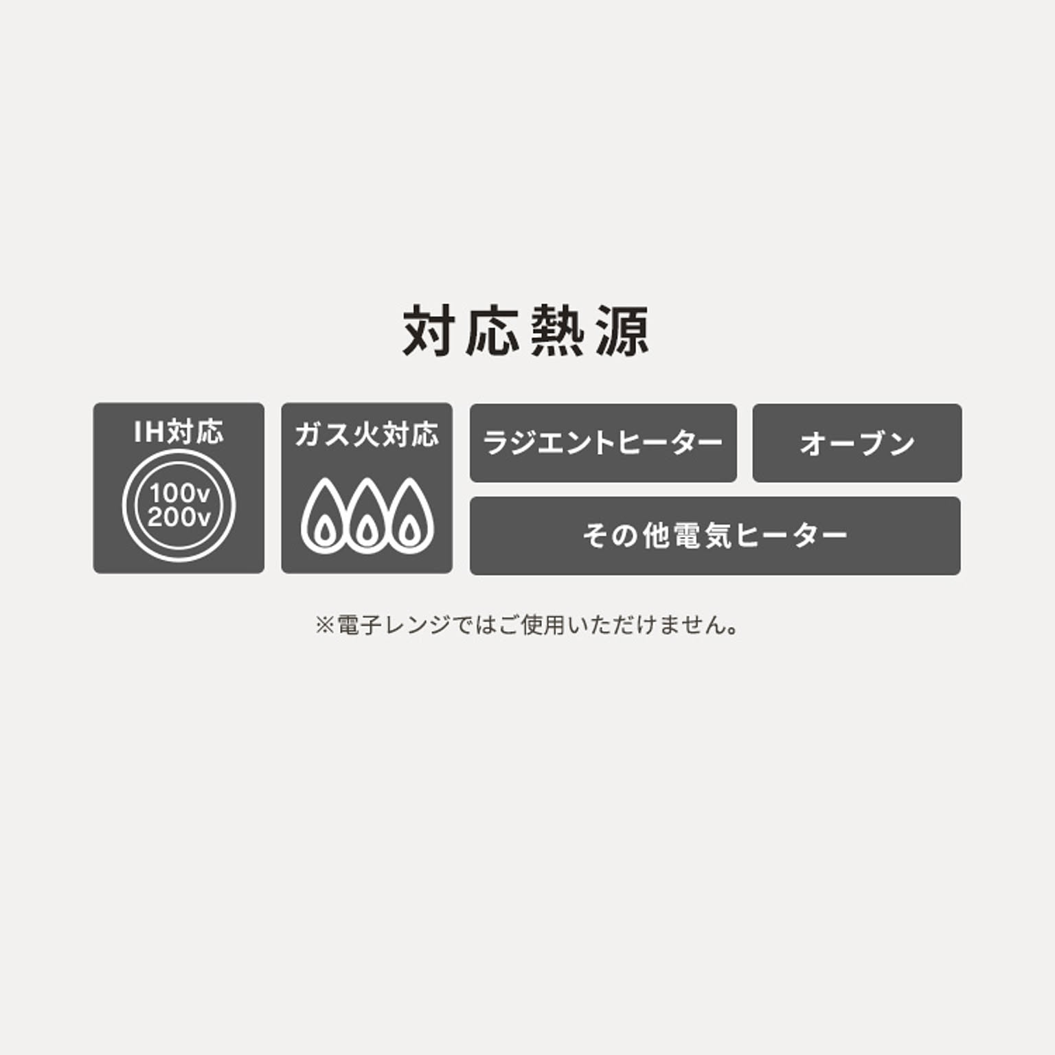 | 対応熱源 | IH対応(IH200V、IH100V)、ガス火、ラジエントヒーター、オーブン、その他の電気ヒーター |