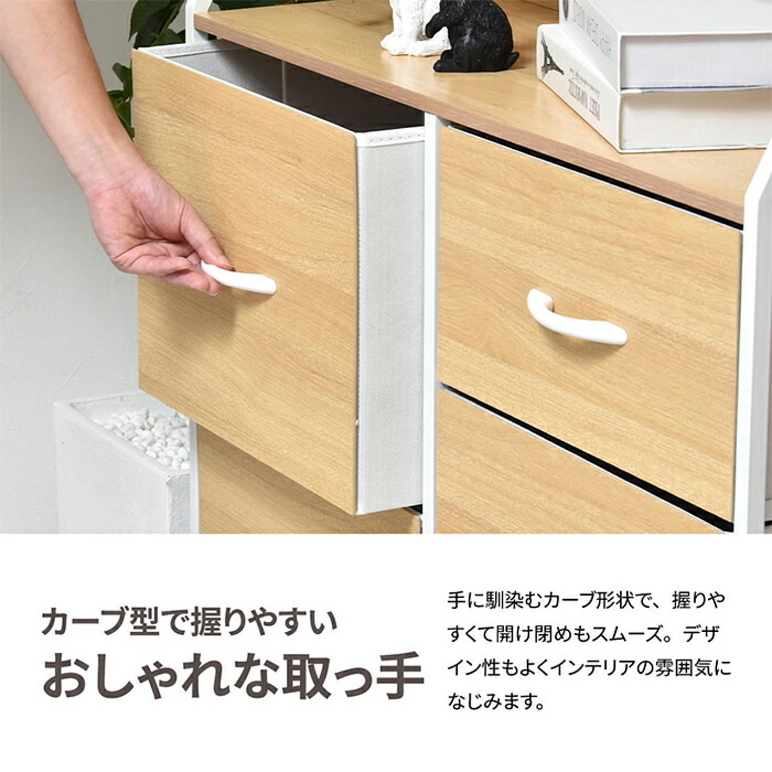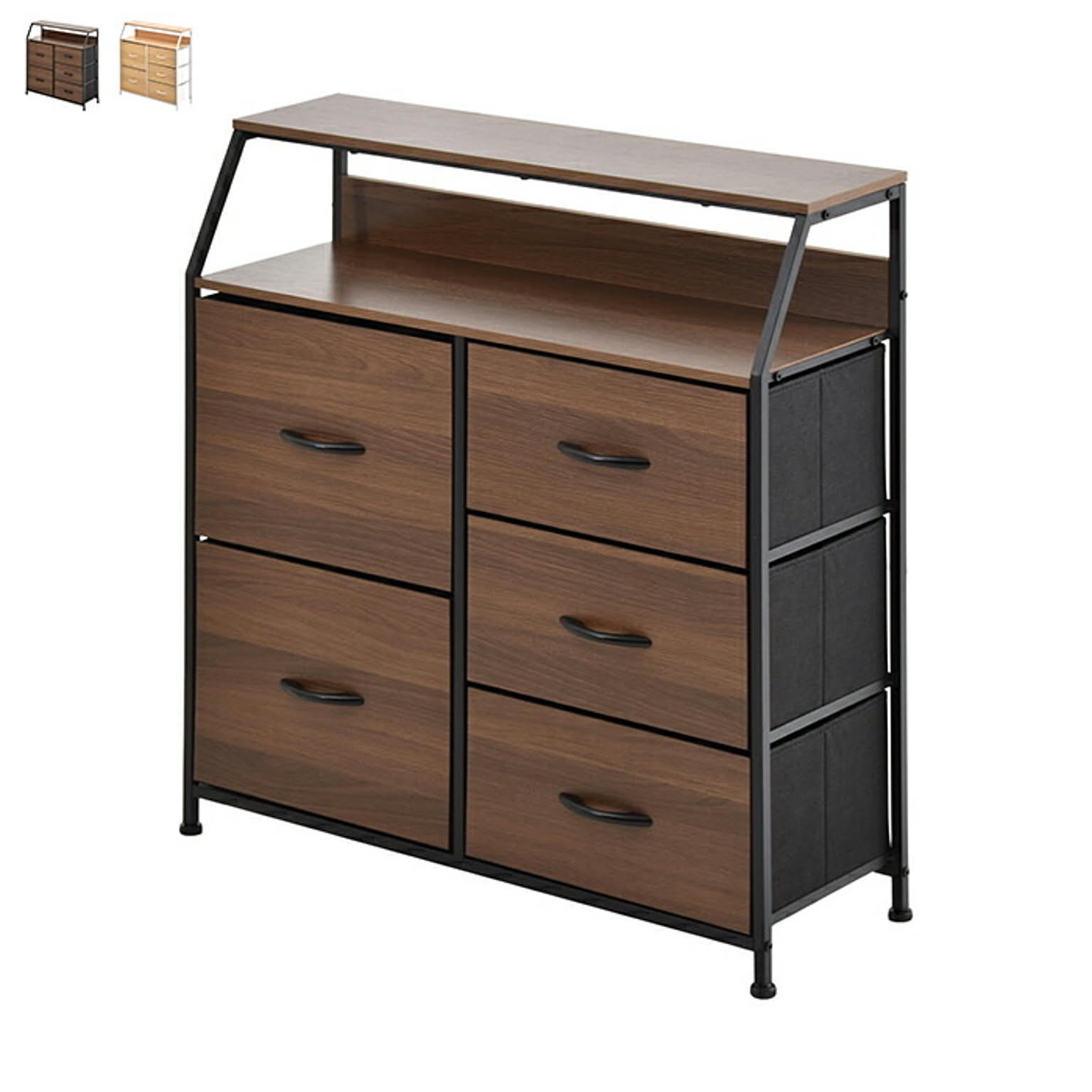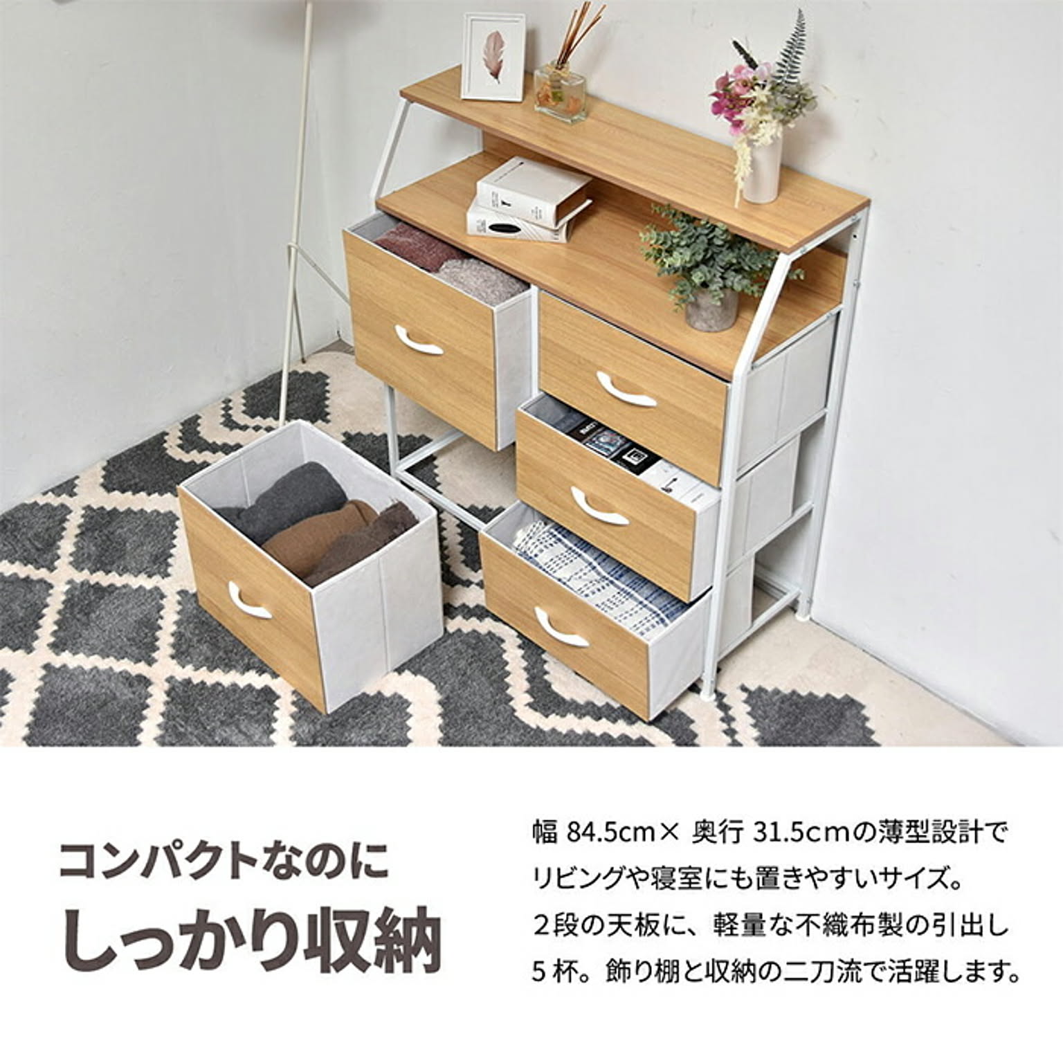 木目の美しいメラミン天板と不織布の引き出しがマッチした、棚付きの収納チェスト。