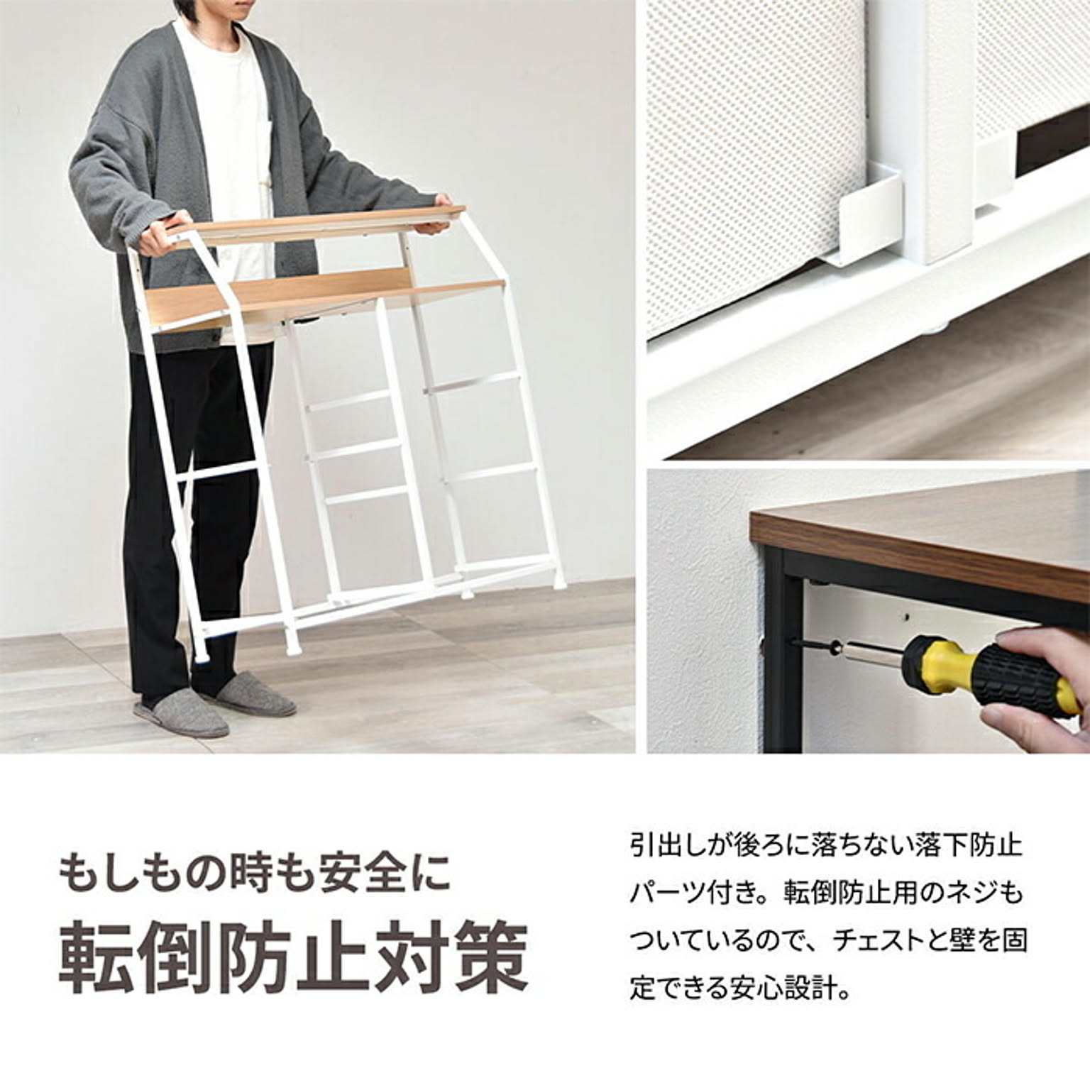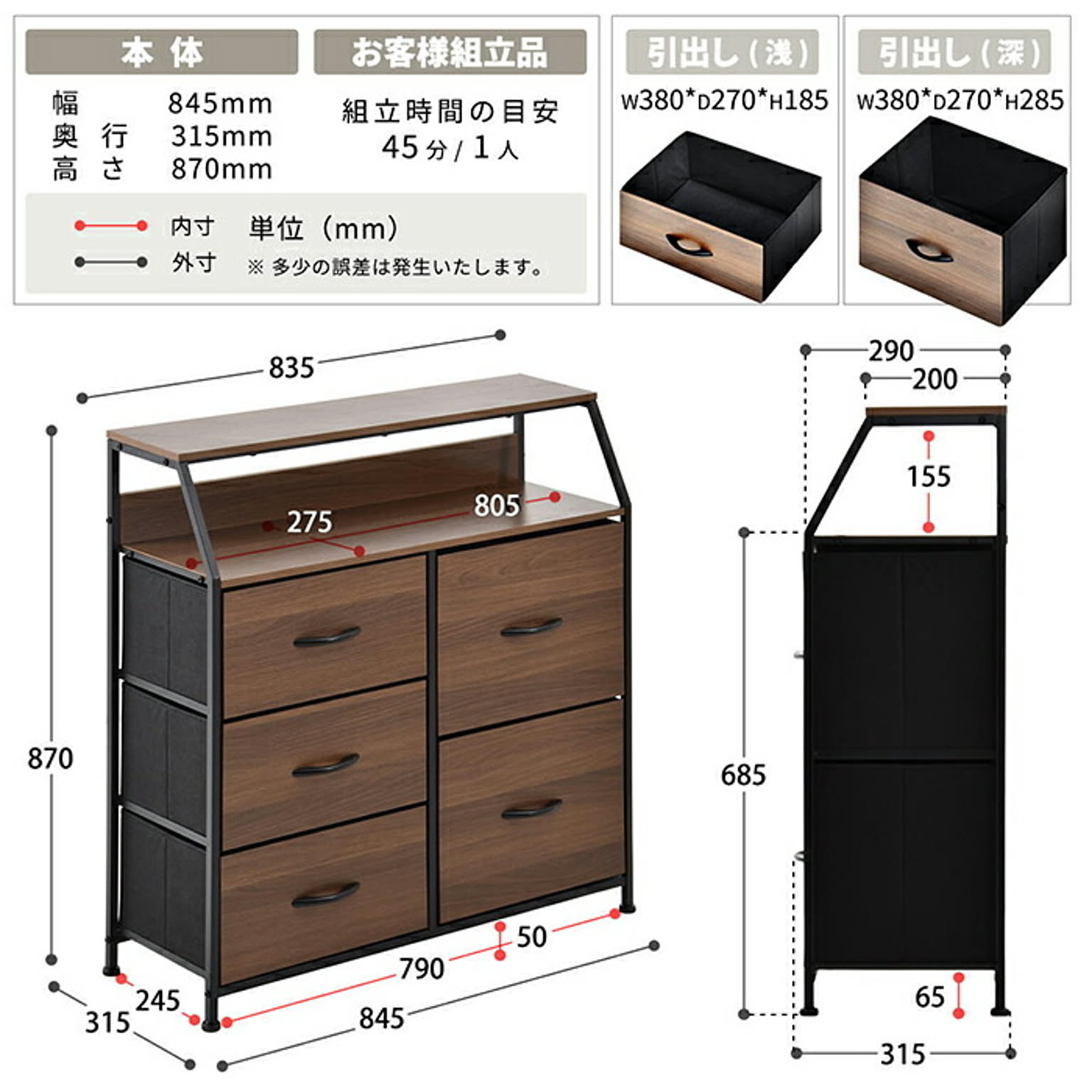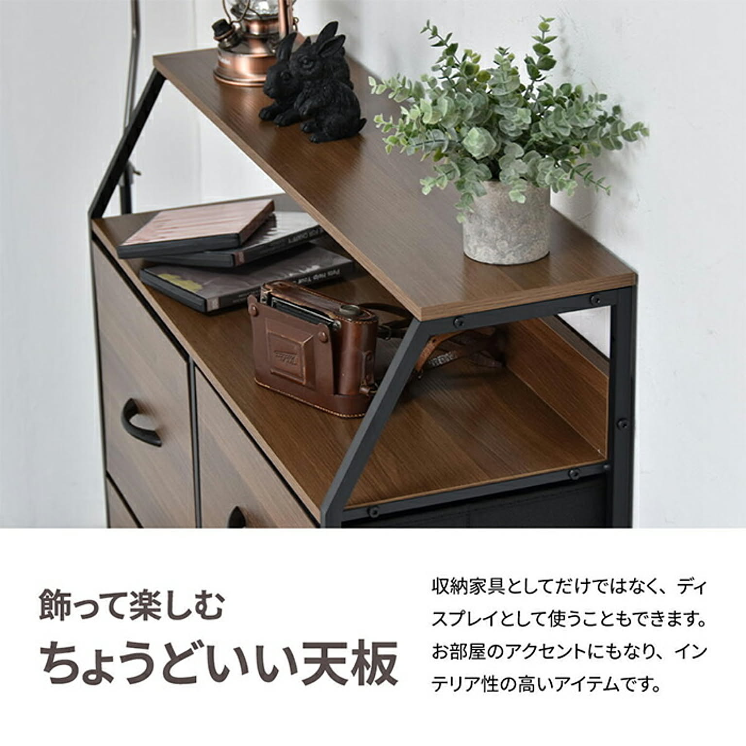 木目の美しいメラミン天板と不織布の引き出しがマッチした、棚付きの収納チェスト。