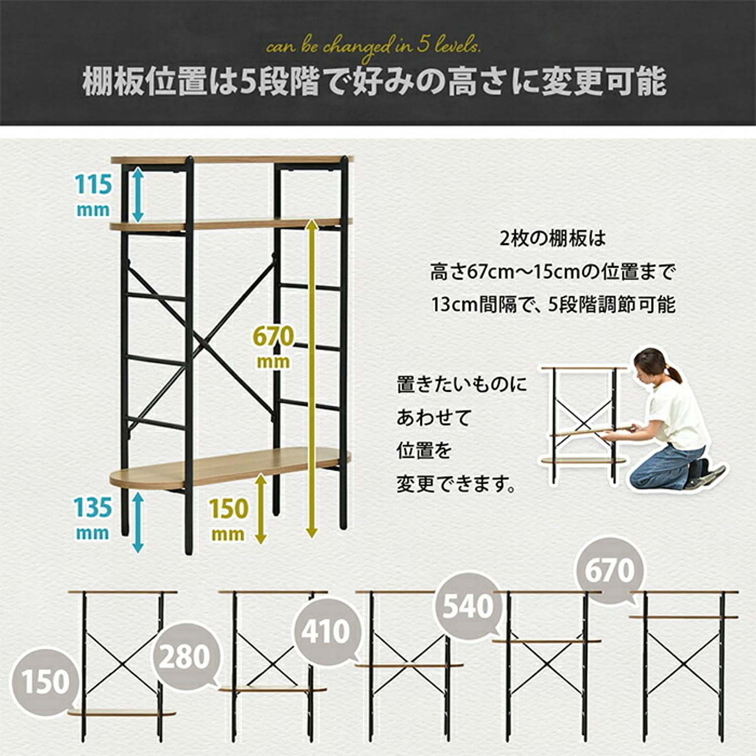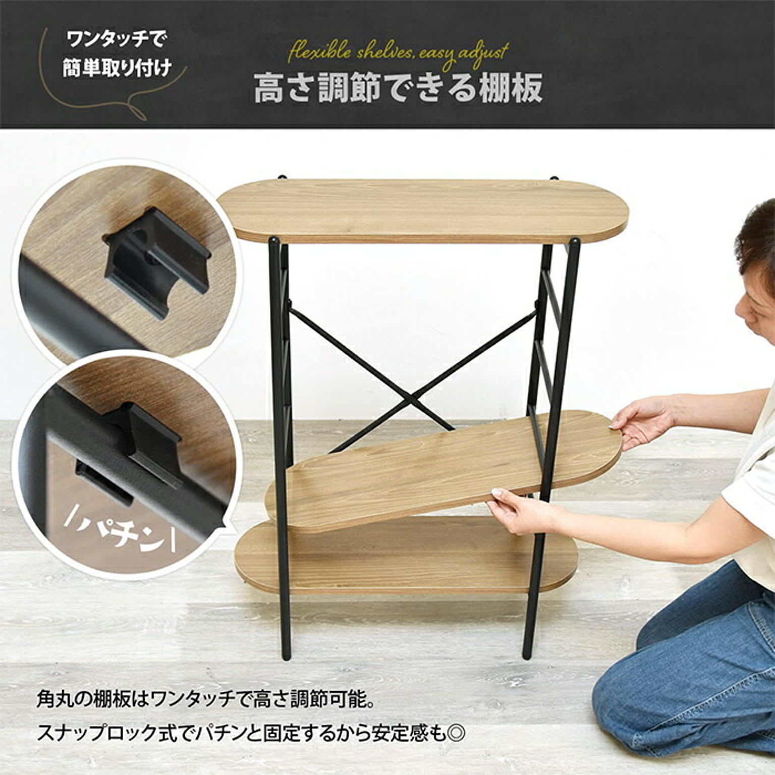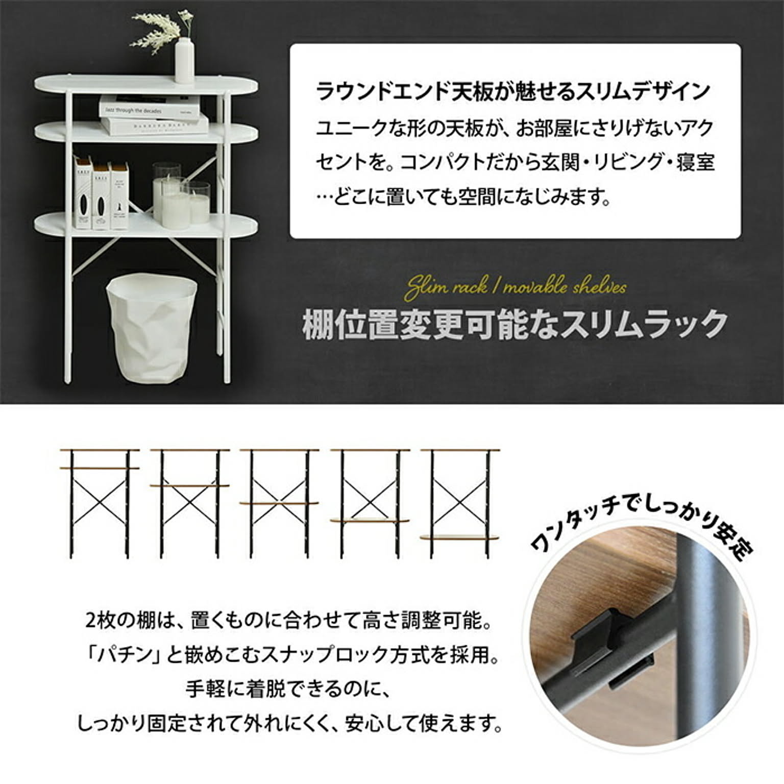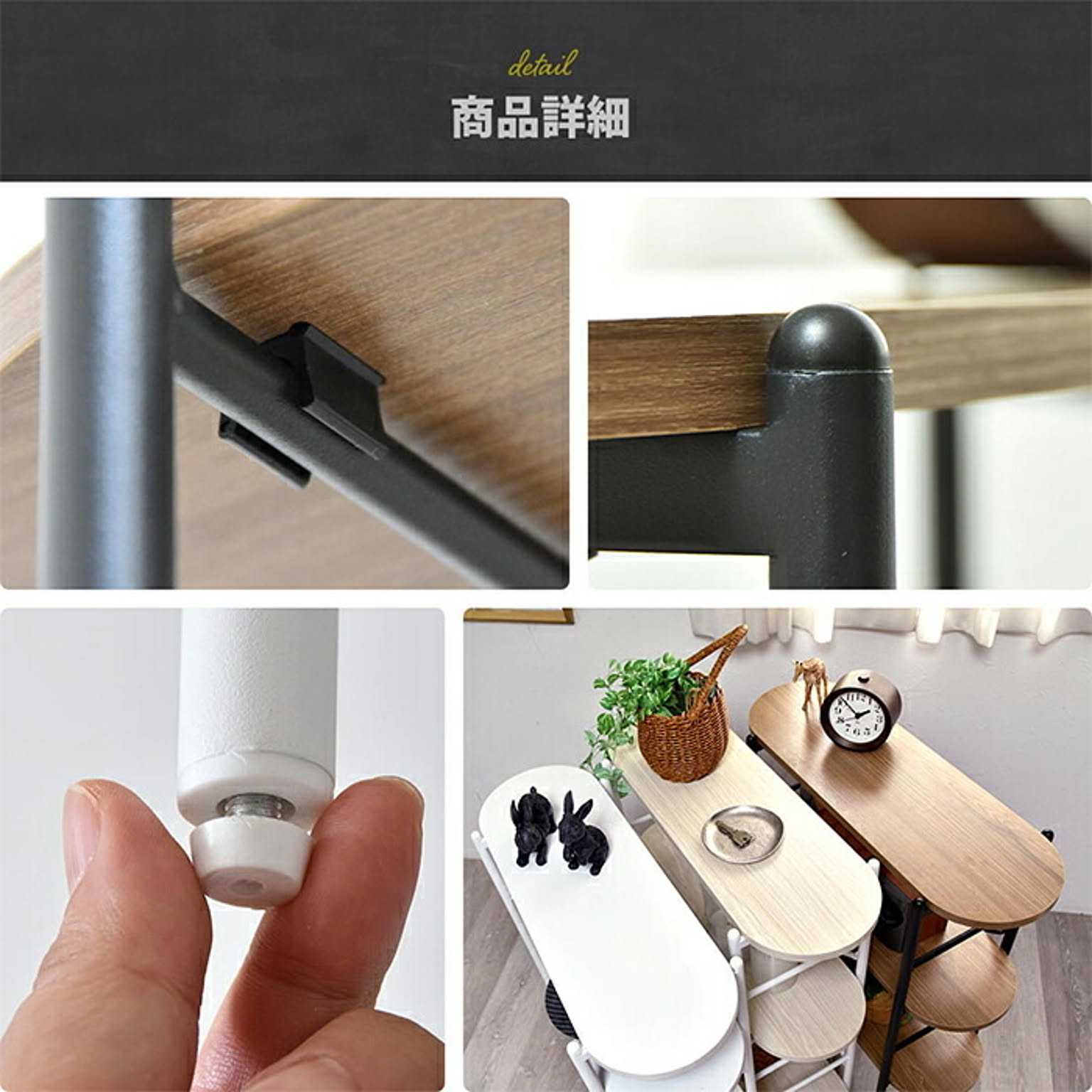 丸みのある天板と棚板が優しい印象を与えるコンソールテーブル。奥行23cmで、玄関や廊下にもすっきり置けます。棚板は工具不要でパチンと簡単に着脱でき、高さを自由に調節可能。飾り棚やちょっとした収納にも最適です。