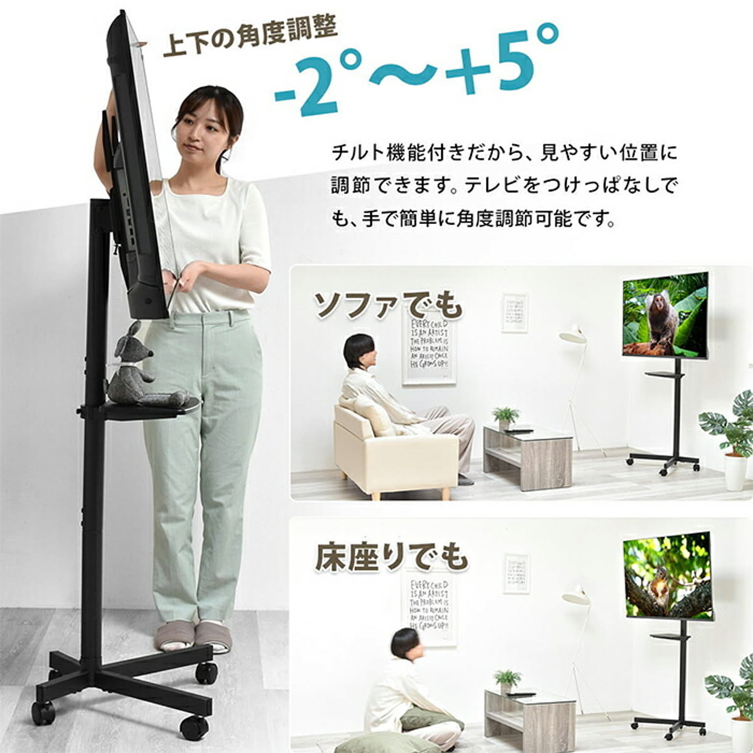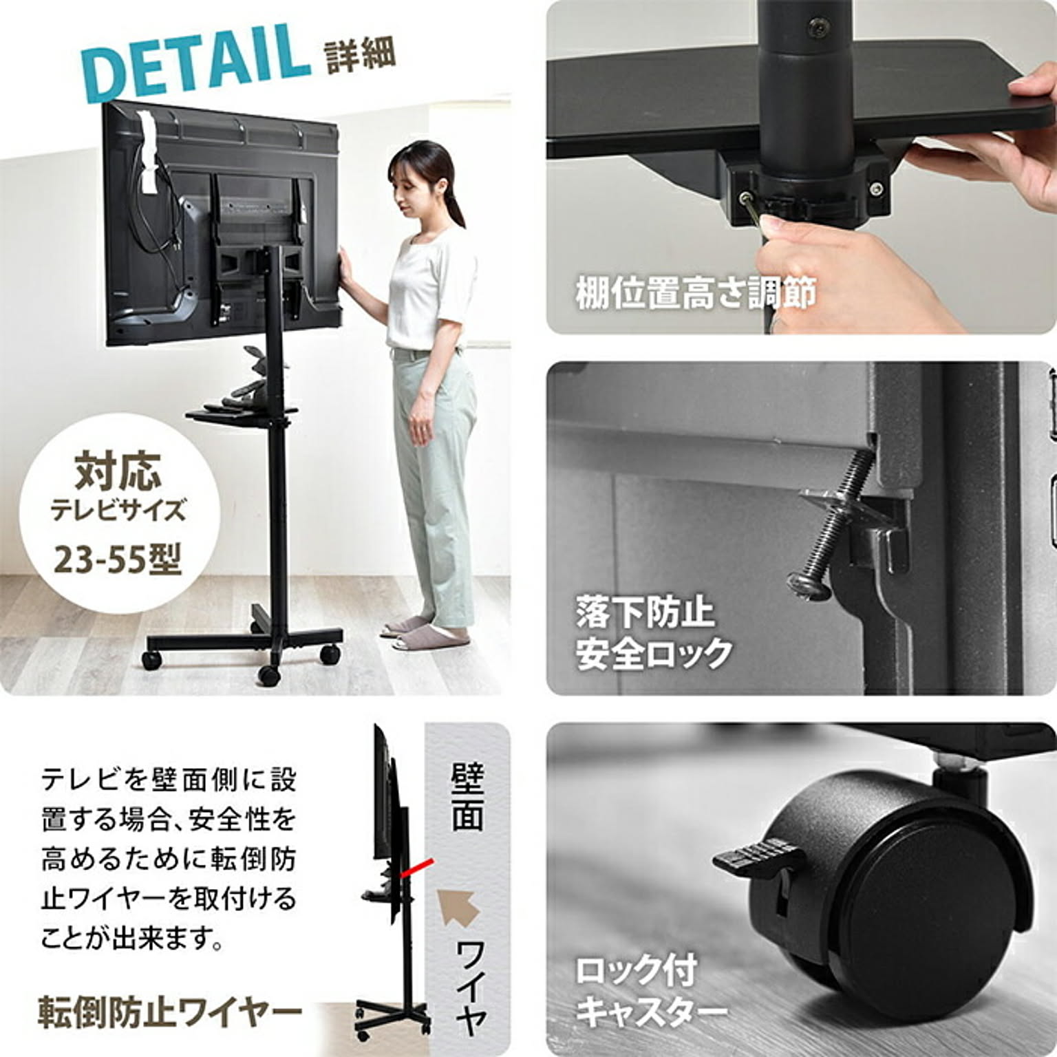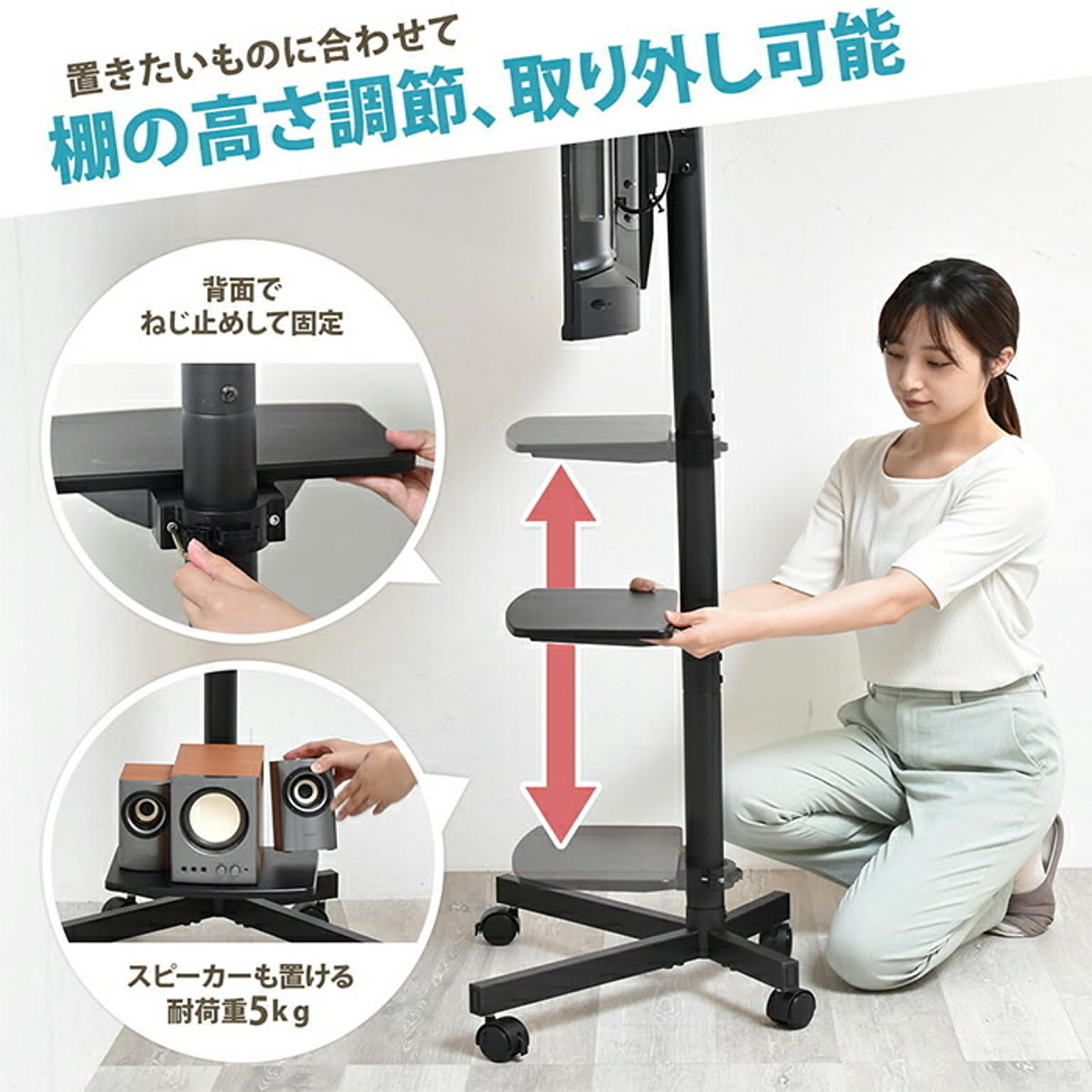 高さが3段階に調節でき、キャスターもついて簡単に移動可能。キャスターがあれば簡単に移動ができ、オフィスや学校、寝室などでサッとテレビスタンドを移動させられるのはもちろん、テレビスタンド近辺を掃除したいときにも役立ちます。