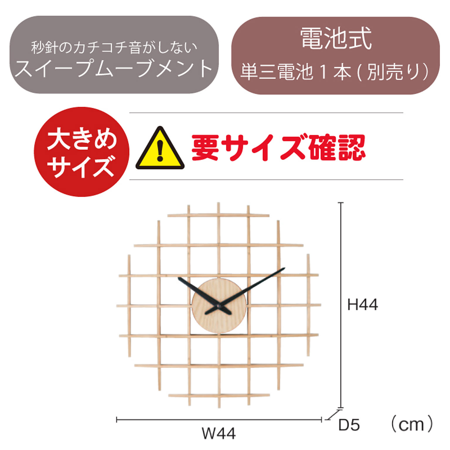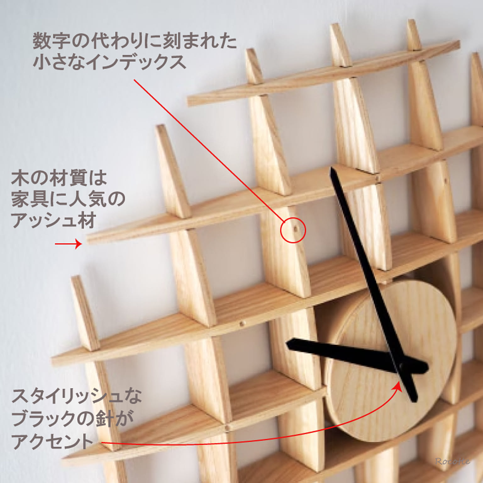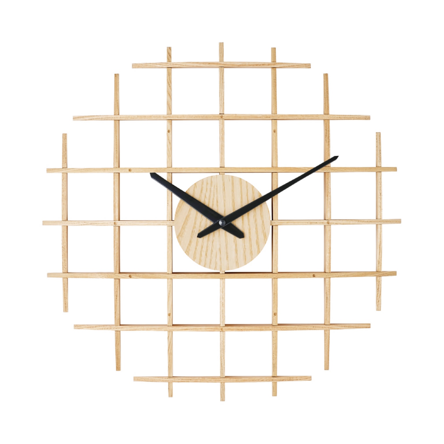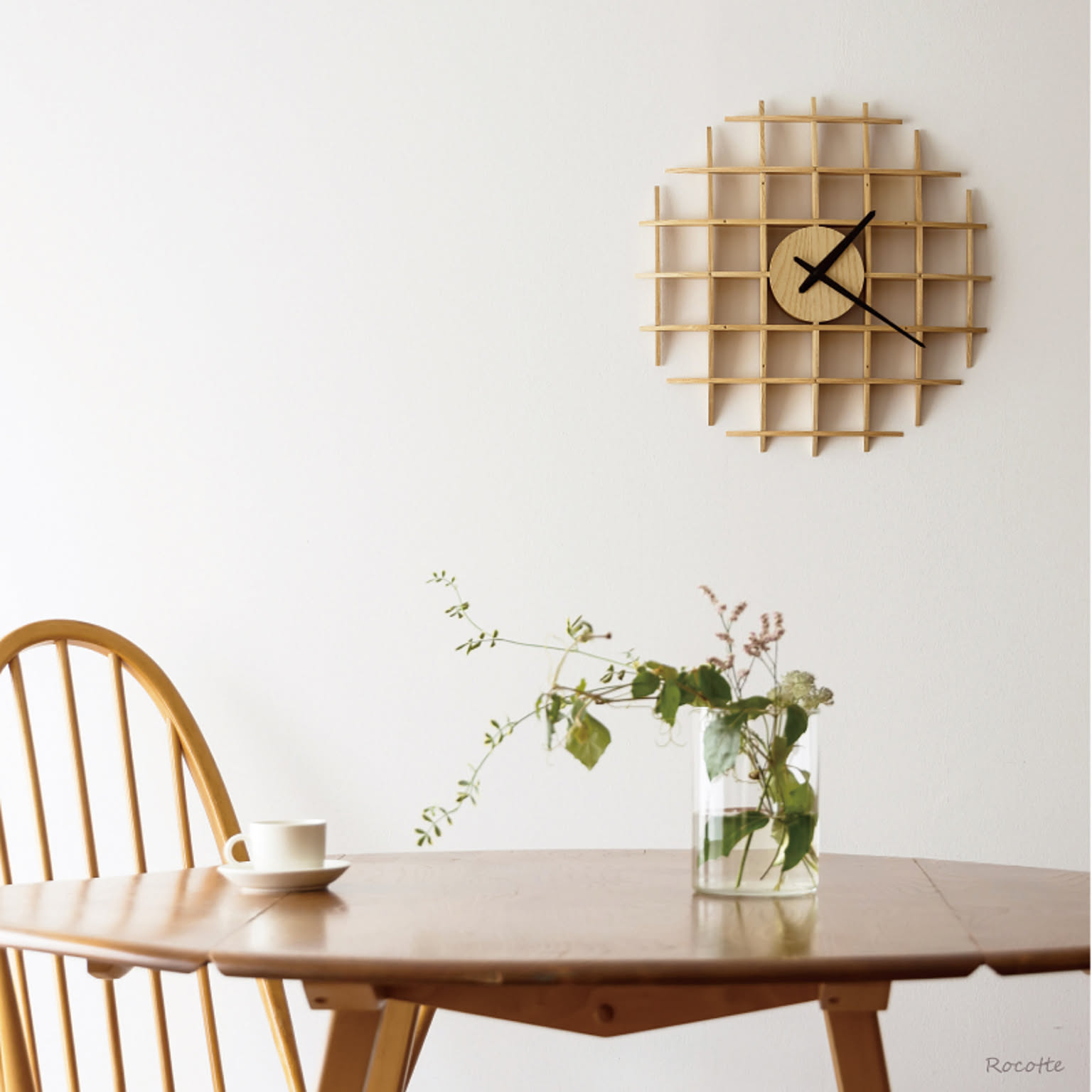 木材を格子状に丁寧に組み上げた木組み建築のような掛け時計。