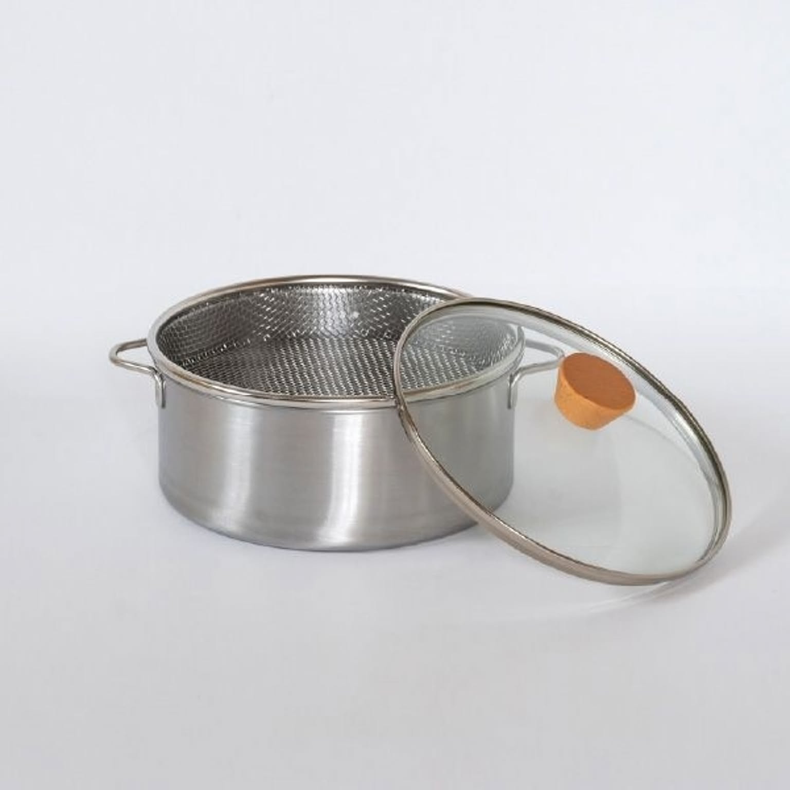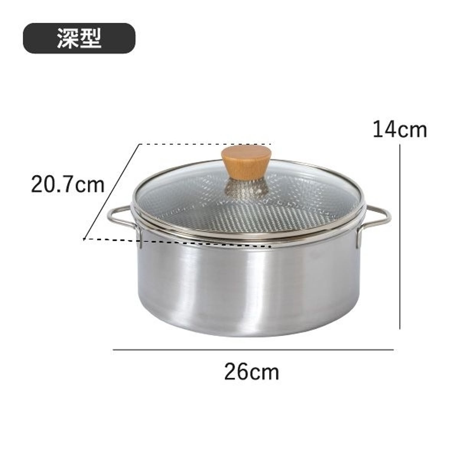 せいろ料理をもっと身近に楽しめるせいろ蒸し器鍋セット。竹製せいろのような下準備やお手入れの手間を軽減し、初心者の方でも気軽に使えるせいろ鍋セットです。本体には汚れやサビに強いステンレス素材を採用。使用後は洗剤を使って丸洗いでき、ガラス蓋を除いて食洗機にも対応しています。カビやにおい移りの心配が少なく、毎日使いやすいせいろ蒸し器鍋セットとして、清潔さを重視する方にもおすすめです。せいろ本体は、野菜・肉・魚などをたっぷり入れやすく、底面の穴から余分な油や水分が落ちることで、素材本来の味を活かしたヘルシー調理が可能。火にかけて待つだけで調理が進むため、忙しい日でも「ほったらかし調理」が叶うせいろ鍋セットです。深型は高さがあるため、野菜やシュウマイ、茶碗蒸しなどもしっかり蒸せて、ボリュームのある調理に最適です。ガラス蓋は中の様子がひと目で確認でき、火加減の調整もスムーズ。使い終わった後は重ねて収納でき、キッチン棚やシンク下、コンロ下の引き出しにもすっきり収まります。毎日使うものだからこそ、清潔・丈夫・省スペースを叶えたせいろ鍋セットとして、蒸し料理をもっと身近に楽しめます。