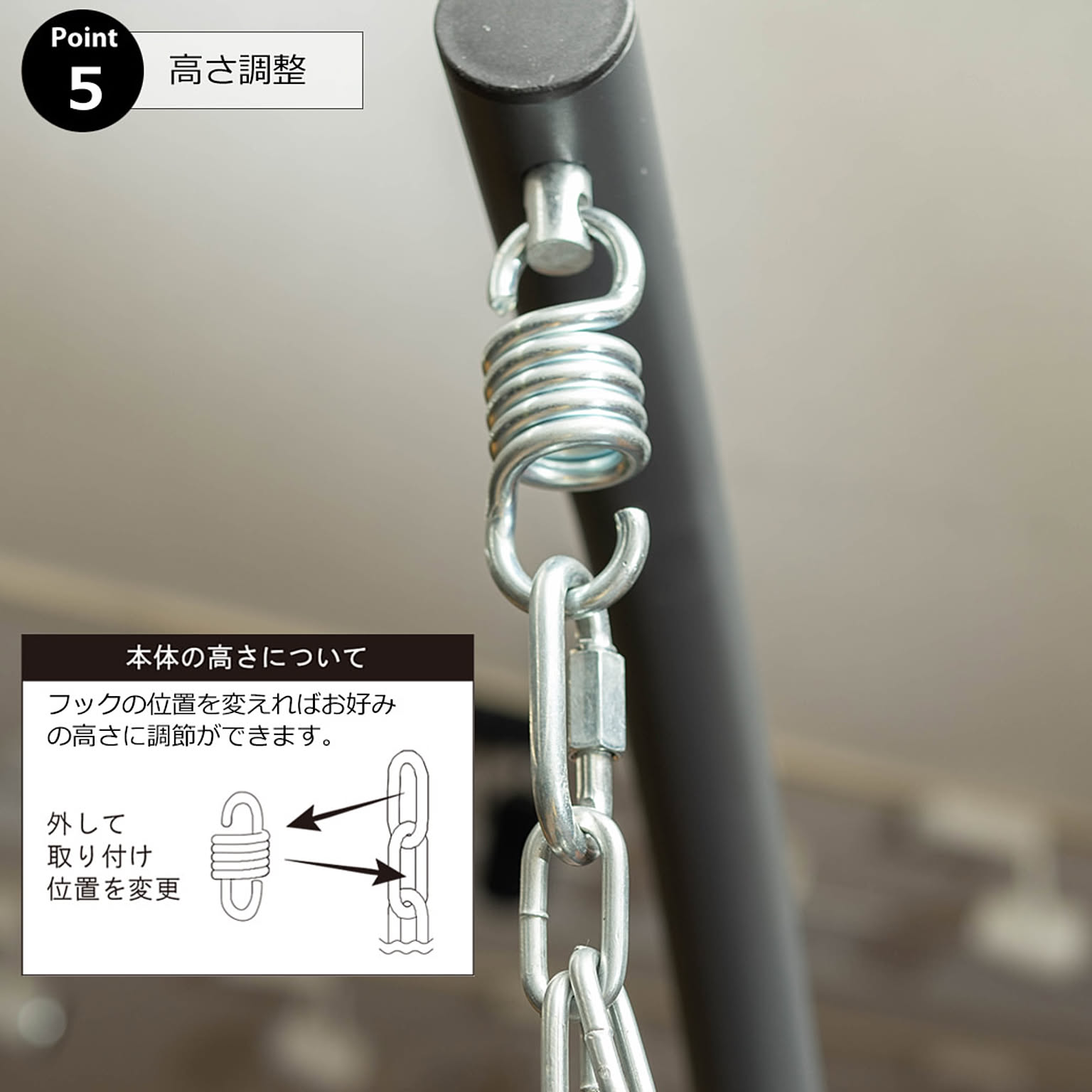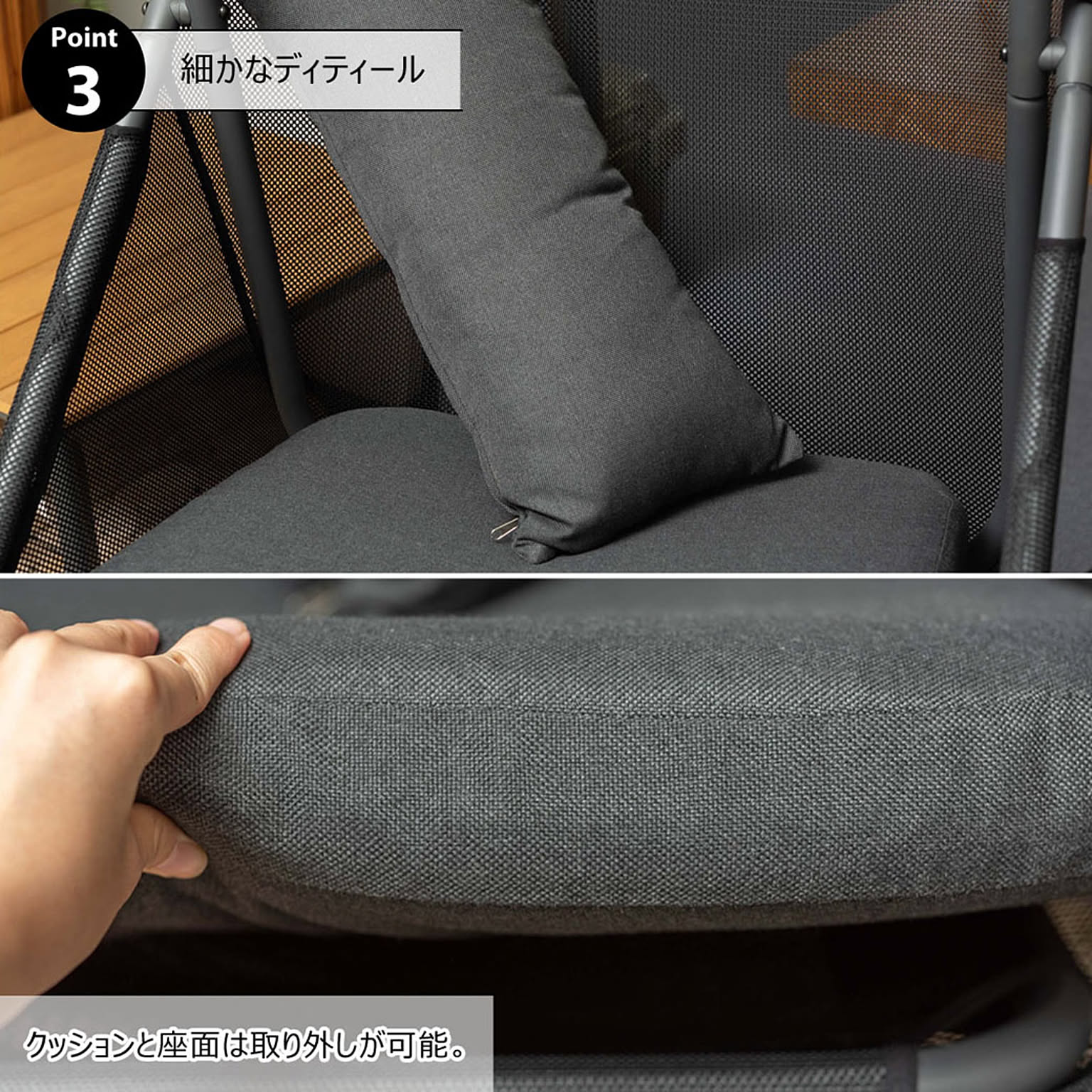 フック部分の位置を変えれば、お好みの高さにも調整可能です。クッションと座面は取り外しが可能です。