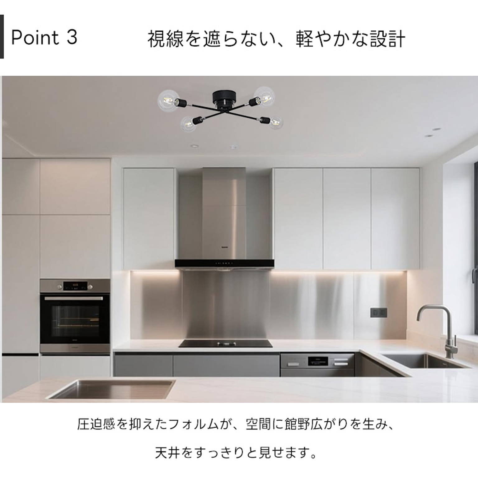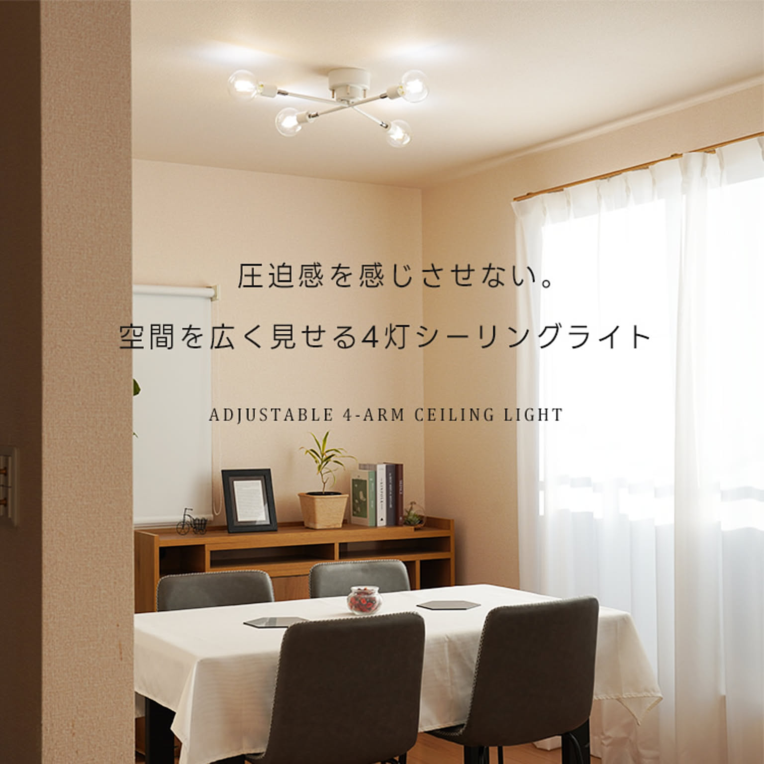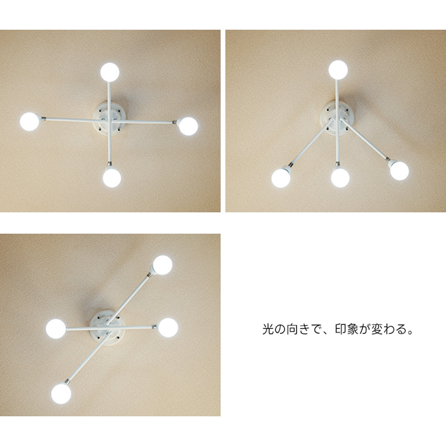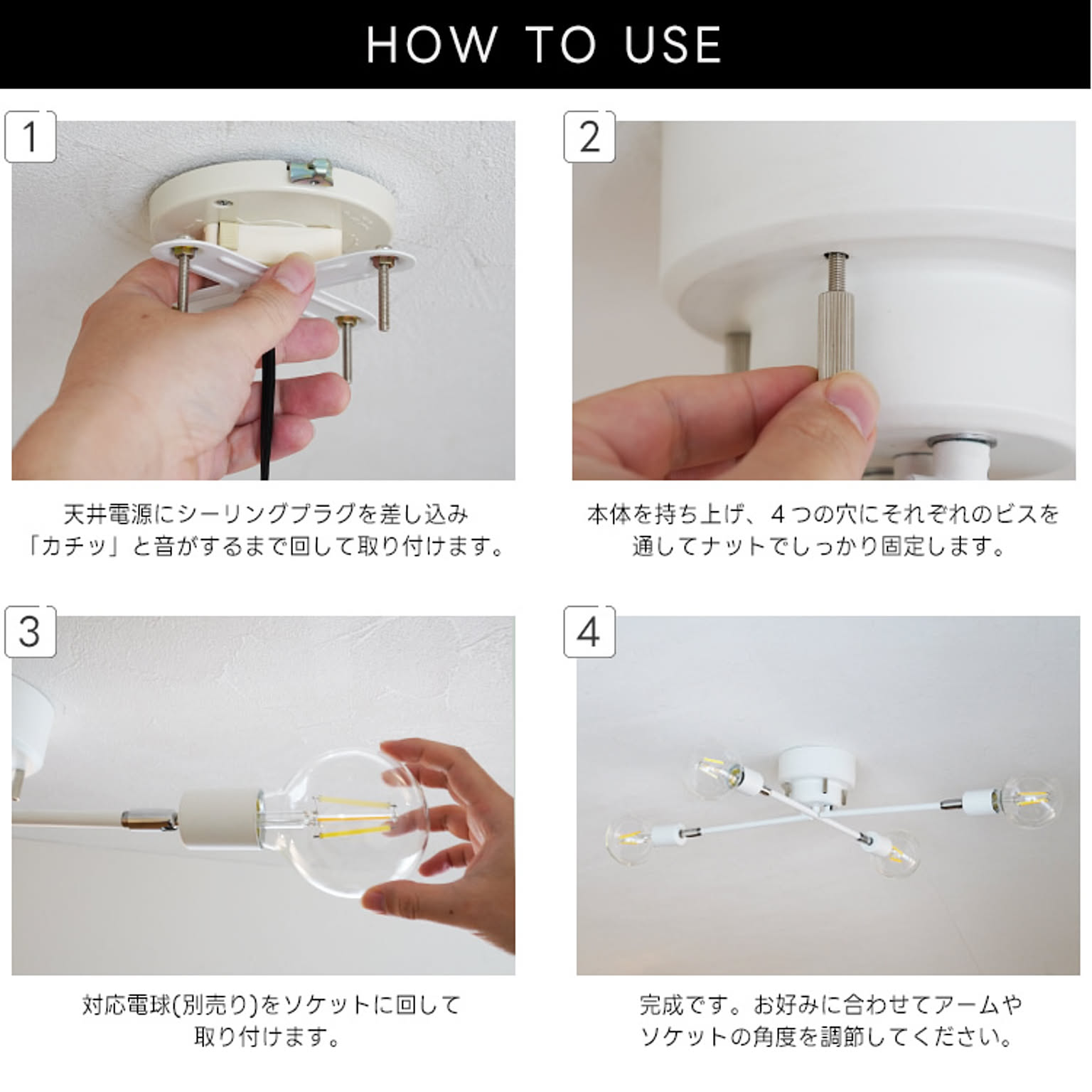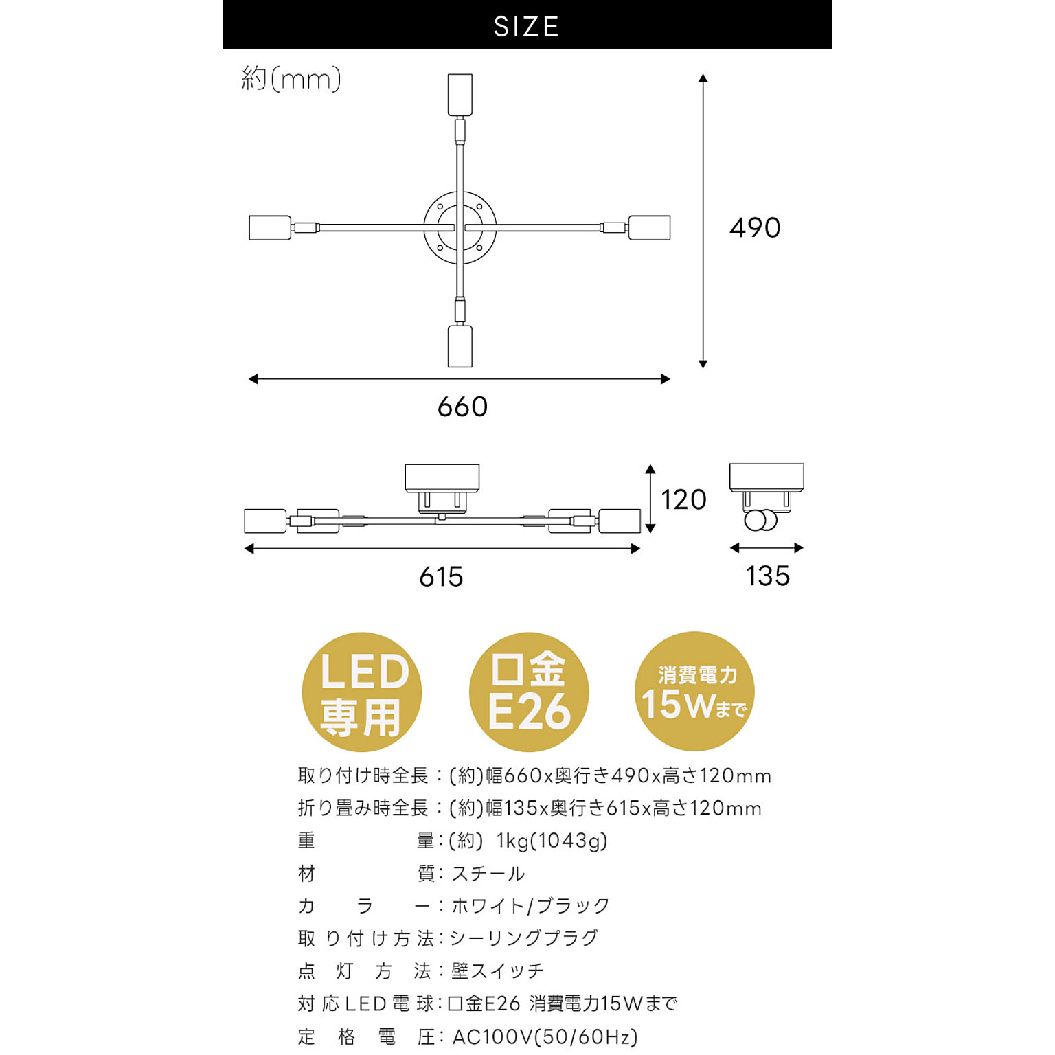 取付方法:シーリングプラグ 定格電圧(周波数):AC100V (50/60Hz) 対応電球:口金/E26 15W×4まで(LED電球別売り) ソケット可動域:上下約180度、約350度回転 点灯方法:壁スイッチ