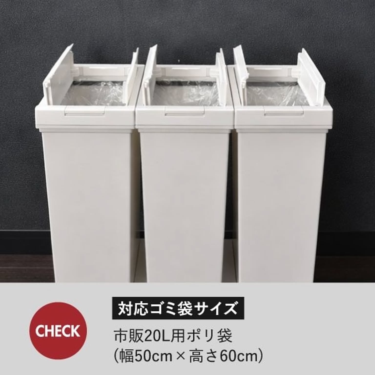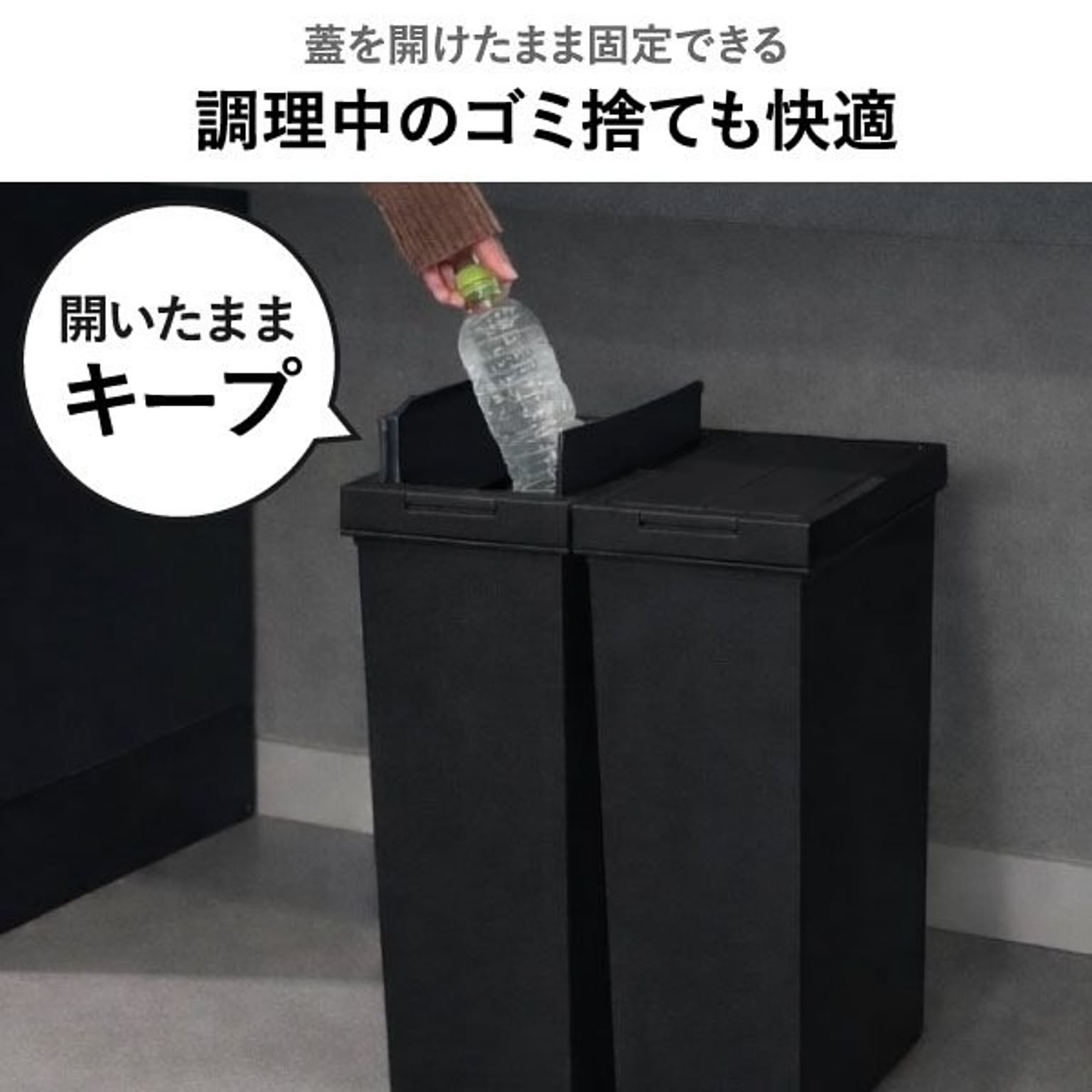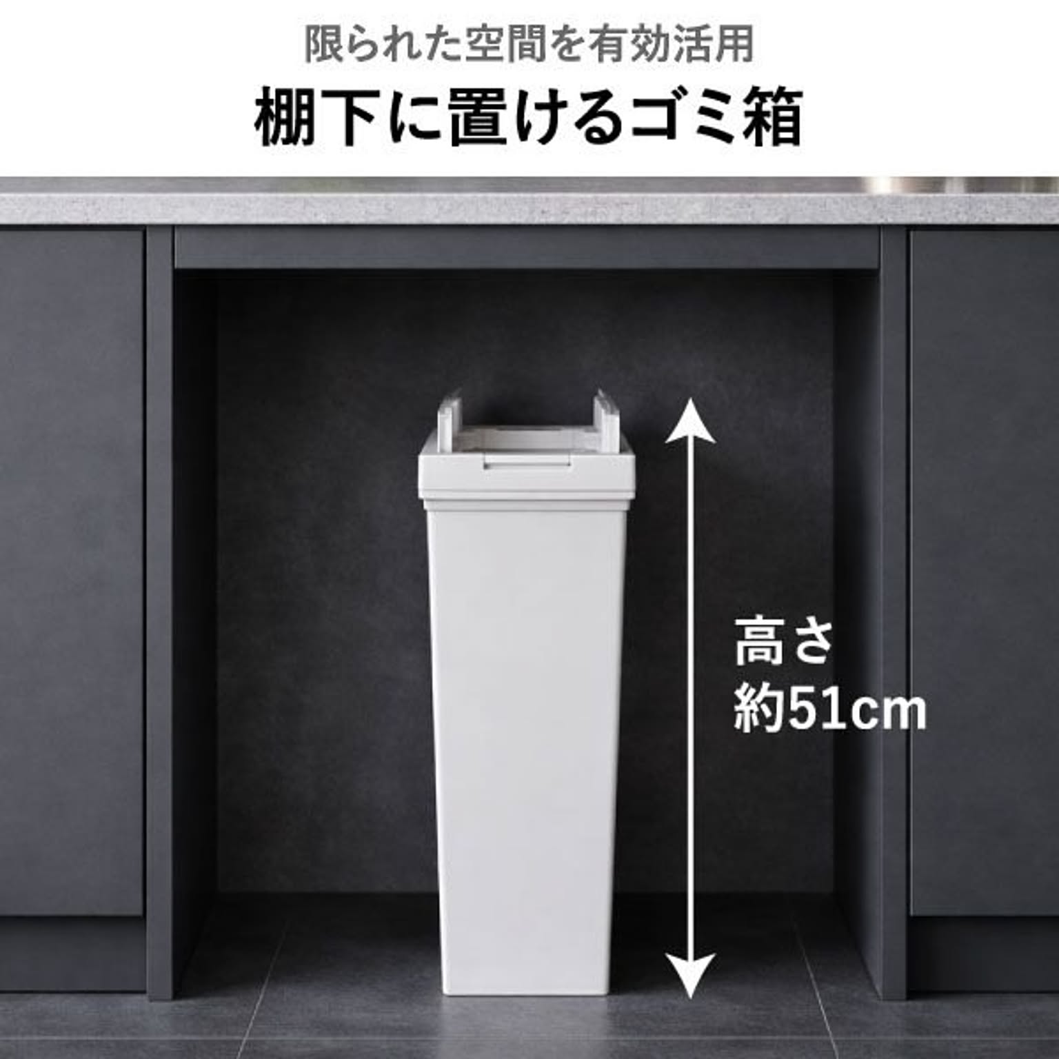 棚下やキッチンカウンター下など、高さ制限のある場所にもすっきり収まるおしゃれなふた付きゴミ箱。省スペース設計のゴミ箱なので、限られた空間でも圧迫感なく使えます。両開き仕様のふた付きゴミ箱は、開閉時に高さが出にくく、置いたまま快適に使えます。片手で開閉できるプッシュ式のふた付きゴミ箱は、左右どちらかを押すだけで閉められるため、手がふさがっていてもスムーズにゴミ捨てが可能。蓋は開けた状態で固定できるので、調理中でもゴミ捨てがラクにでき、作業効率もアップ。機能性とおしゃれさを兼ね備えたゴミ箱です。おしゃれなふた付きゴミ箱は、袋止め付きで袋がずれにくく、交換も簡単。外から袋が見えにくいため生活感を抑えられ、見た目もおしゃれで空間にすっきりと馴染みます。無駄のないシンプルなデザインのふた付きゴミ箱は、キッチンやリビングなど設置場所を選ばず使える、暮らしに寄り添うおしゃれなゴミ箱です。