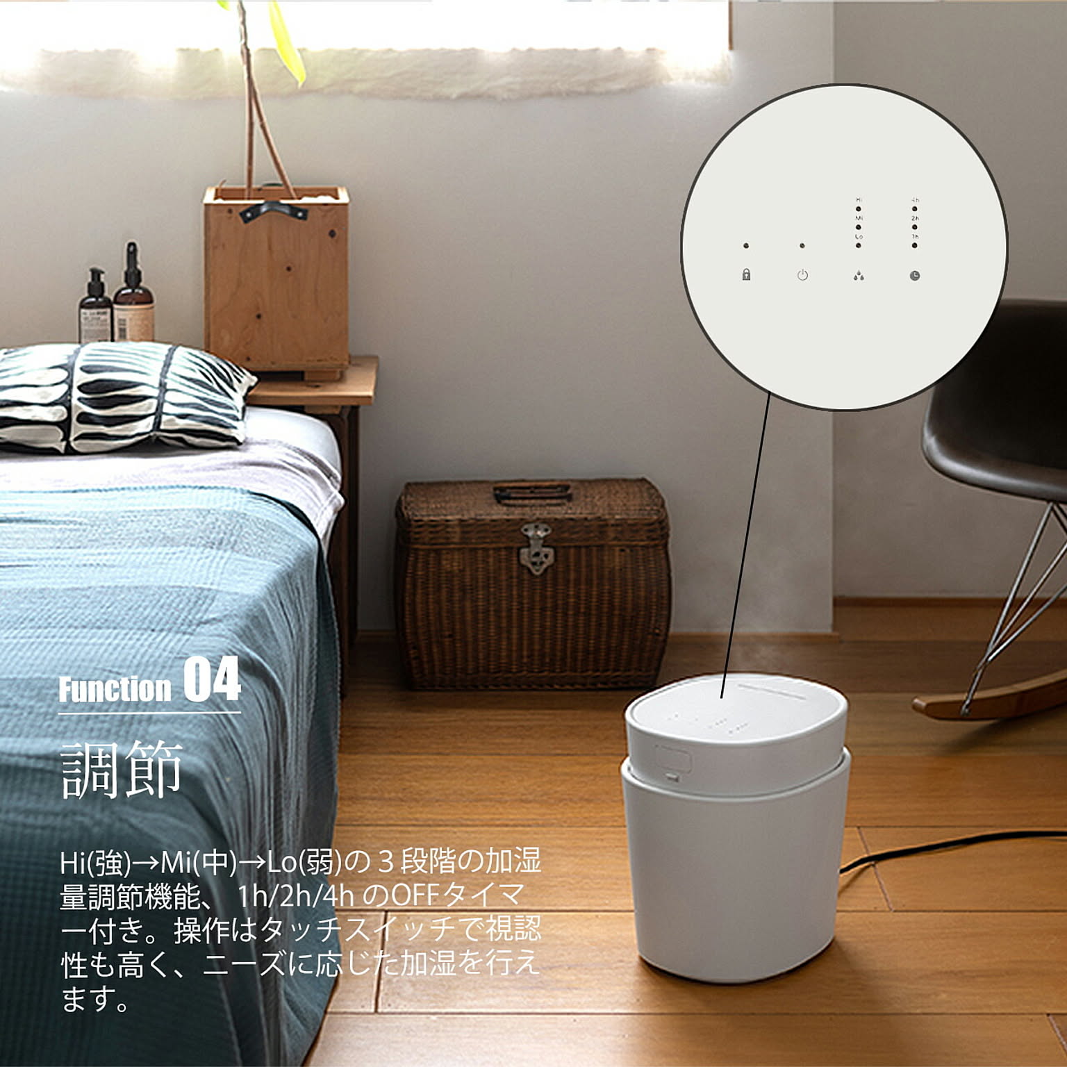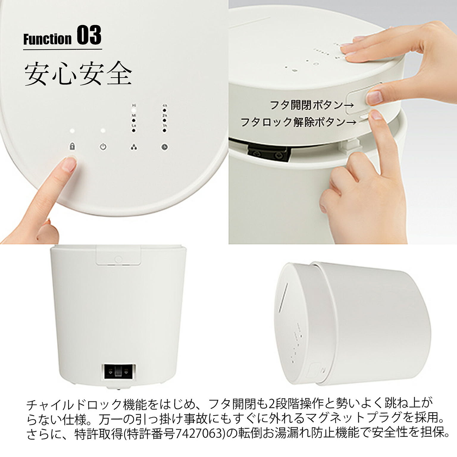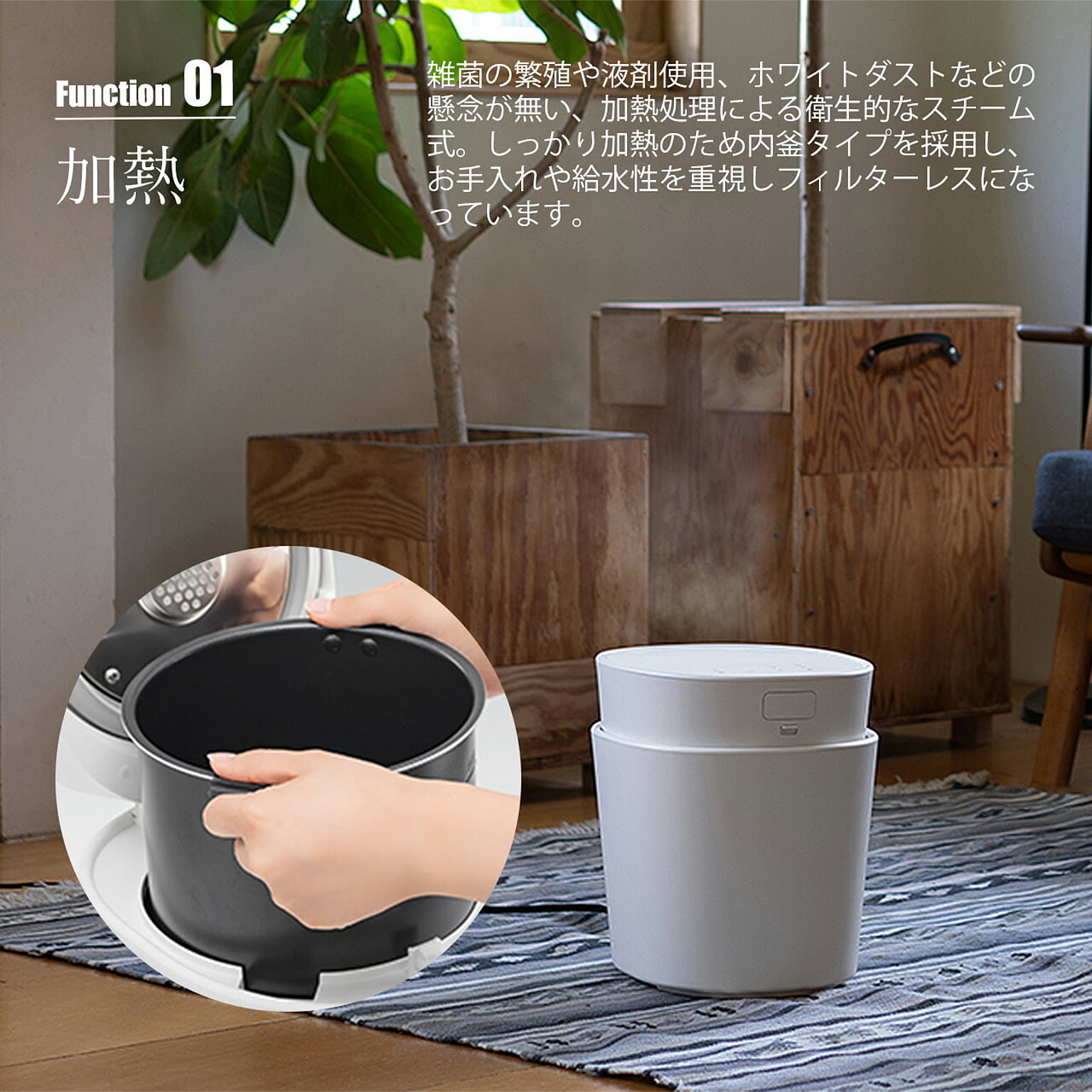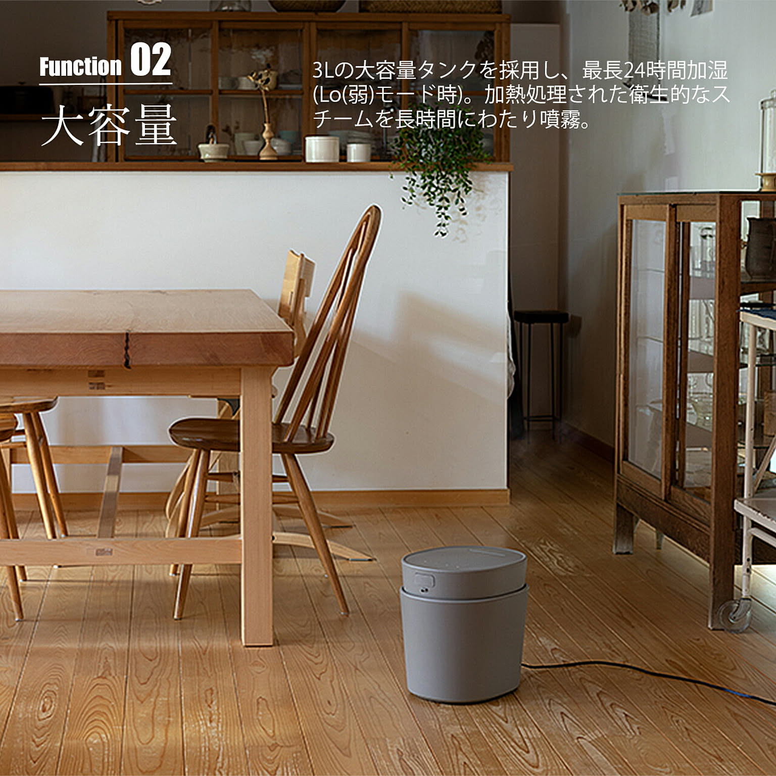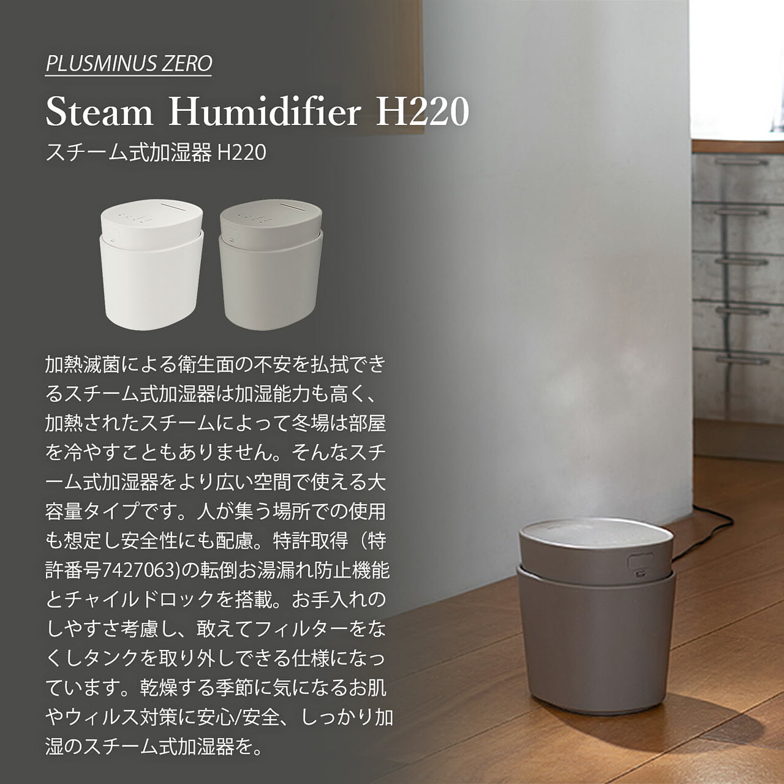 加熱滅菌による衛生面の不安を払拭できるスチーム式加湿器は加湿能力も高く、加熱されたスチームによって冬場は部屋を冷やすこともありません。そんなスチーム式加湿器をより広い空間で使える大容量タイプです。人が集う場所での使用も想定し安全性にも配慮。特許取得(特許番号7427063)の転倒お湯漏れ防止機能とチャイルドロックを搭載。お手入れのしやすさ考慮し、敢えてフィルターをなくしタンクを取り外しできる仕様になっています。乾燥する季節に気になるお肌やウィルス対策に安心/安全、しっかり加湿のスチーム式加湿器を。