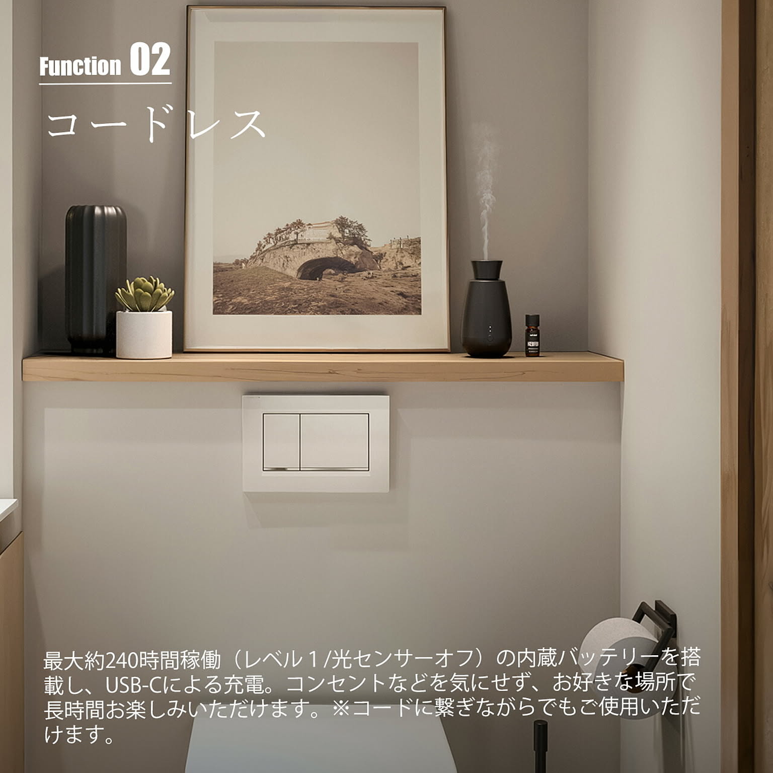 水を使わずエッセンシャルオイルをそのまま超微粒子にして噴霧するネブライザー方式のディフューザー。超微粒子なので素早く広がり空間に長時間漂います。水で薄まることもなく、本来のピュアで濃厚なアロマの香りをお楽しみいただけます。 しかも水を使わないので、お手入れも簡単!カビや雑菌など気にせず使えます。インターバル機能搭載でレベルを3段階で調整可能。 内蔵バッテリー搭載、充電式なので場所を選ばずご利用いただけます。光センサー機能を使って必要な時だけ稼働させるなどの使い方も可能。