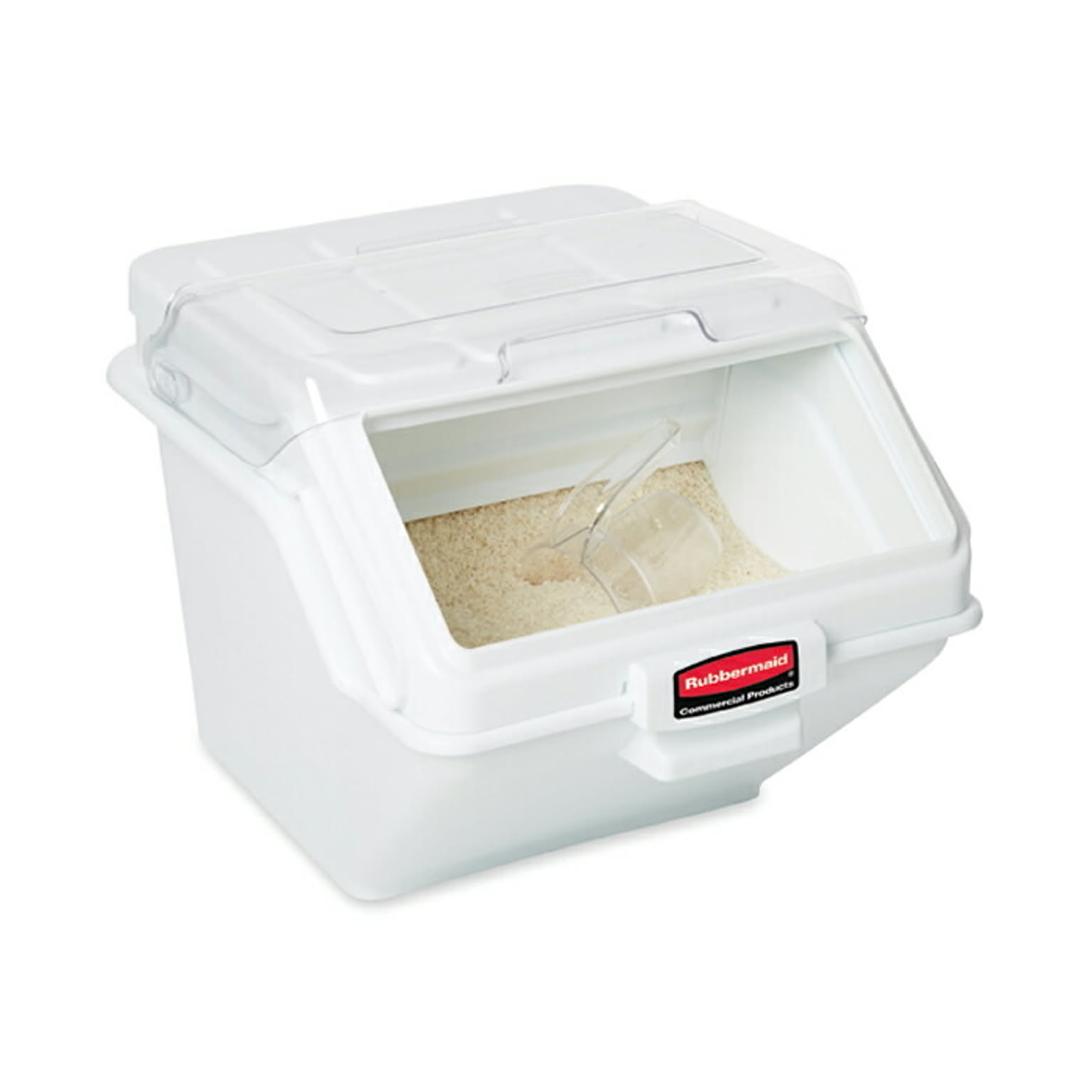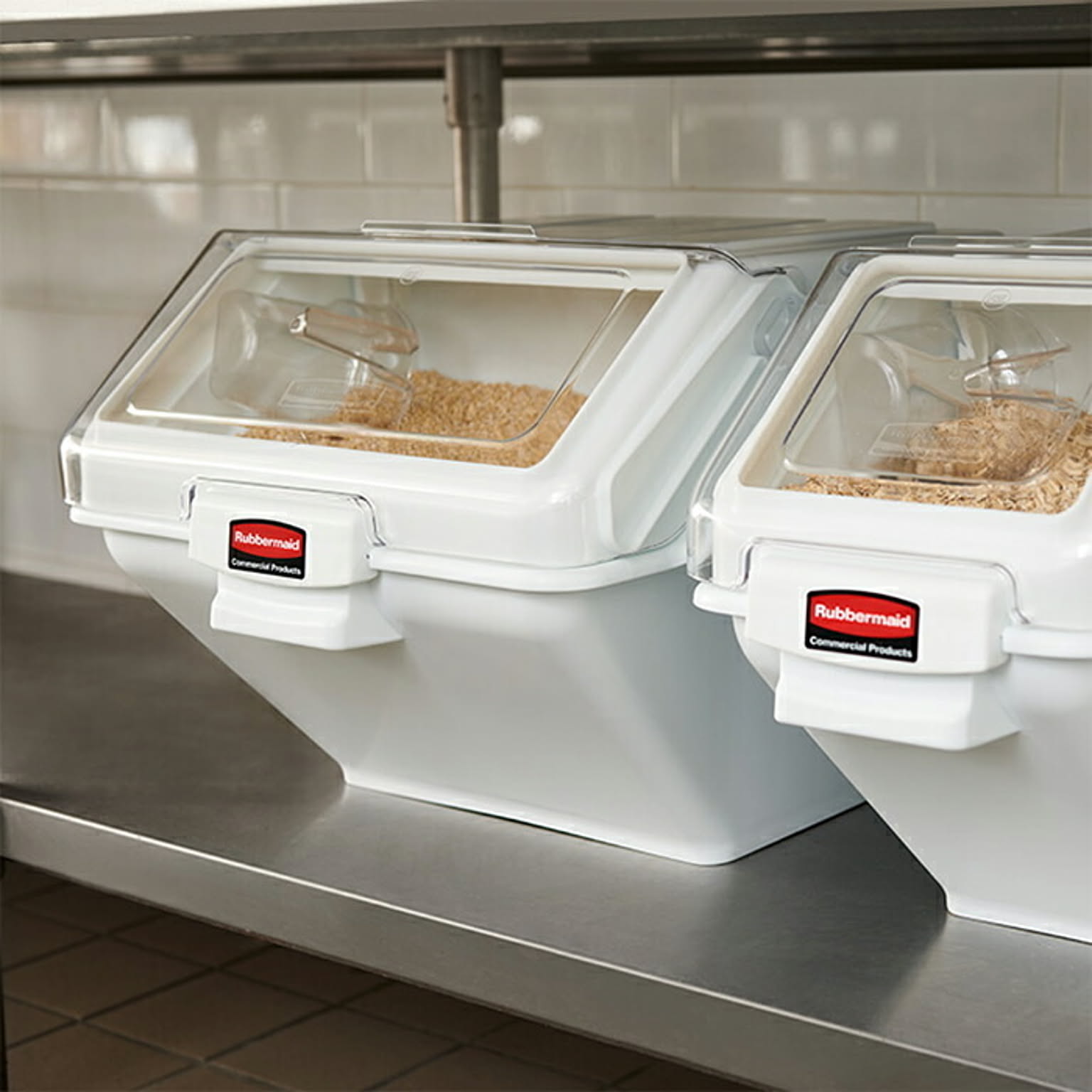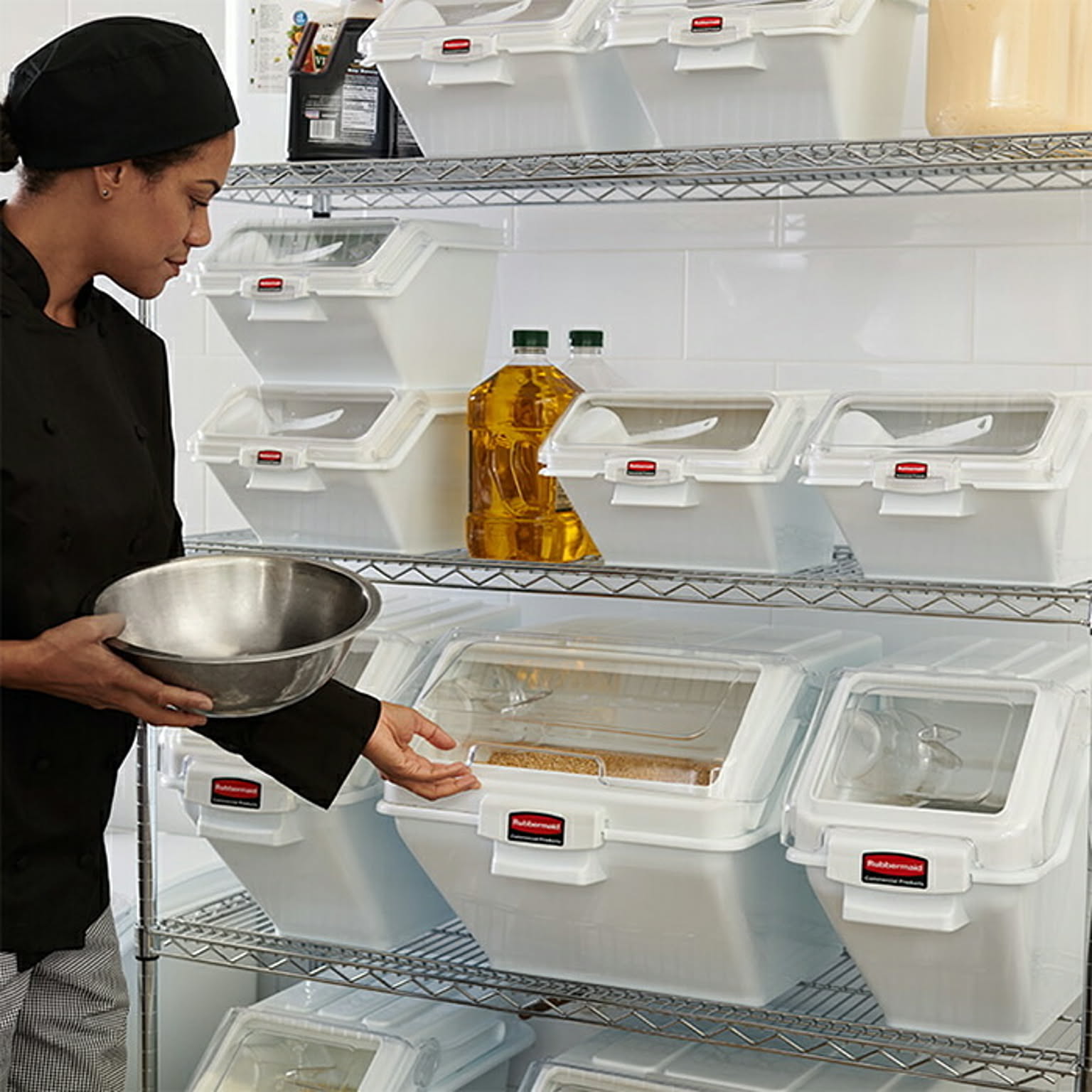片手で簡単に開閉できる設計のラバーメイド イングリディエントビン。積み重ねた状態でもスムーズに食材を取り出せる上下開閉システムを採用し、食品の鮮度を守りながら衛生的に管理できます。クリアウィンドウ付きで中身が一目で確認でき、業務用食器洗浄機にも対応。耐久性の高い構造で、飲食店や食品工場の効率的な食材管理をサポートします。