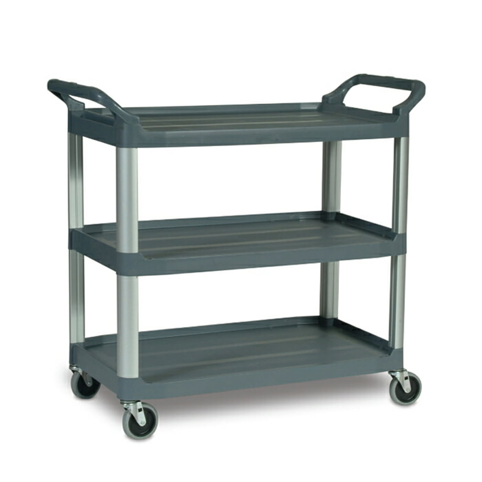 3段構造の広々とした収納スペースを備えたラバーメイド エクストラユーティリティーカート。全面開放タイプの設計により、前後どちらからでも荷物の出し入れが可能。スチール製の支柱と耐久性の高いポリプロピレン製棚を採用し、耐荷重は136.1kg。滑らかな自在キャスターでスムーズな移動ができ、厨房、清掃、物流、オフィスなど幅広い現場で活躍。