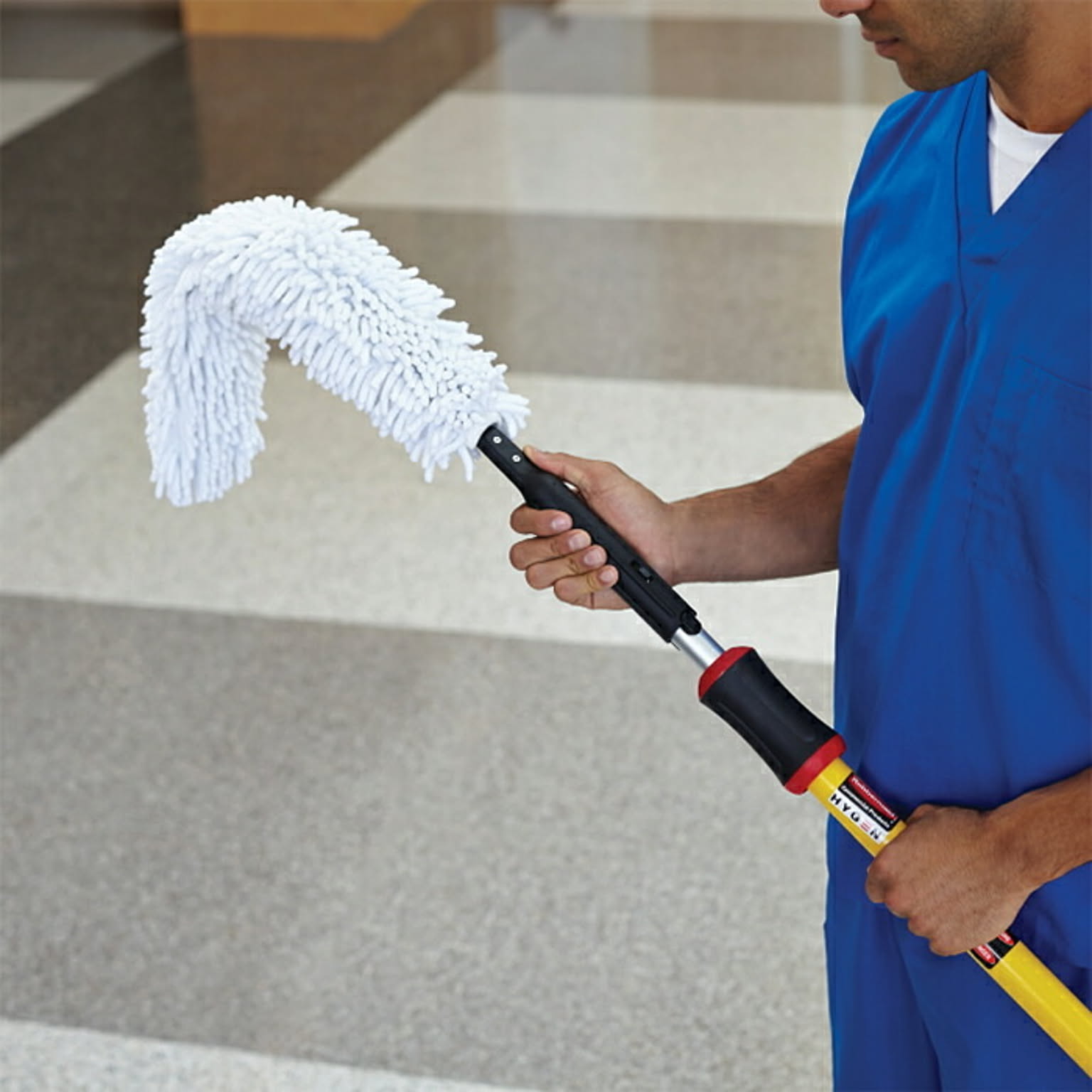 高所の除塵作業に適したハイグレードなダスター。パッド部分が自由に変形し、カーブや隙間にもフィット。耐久性のある素材を使用し、93度までの温水洗浄が可能で、漂白剤を使わずに衛生的に管理できる。