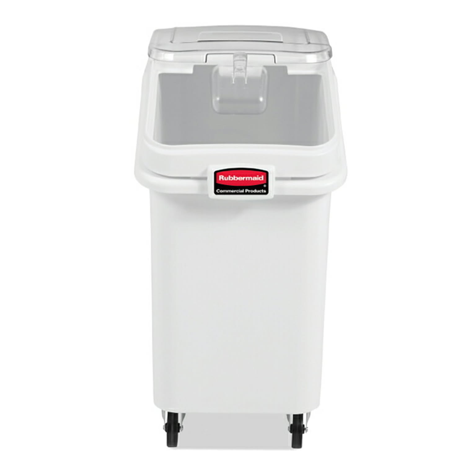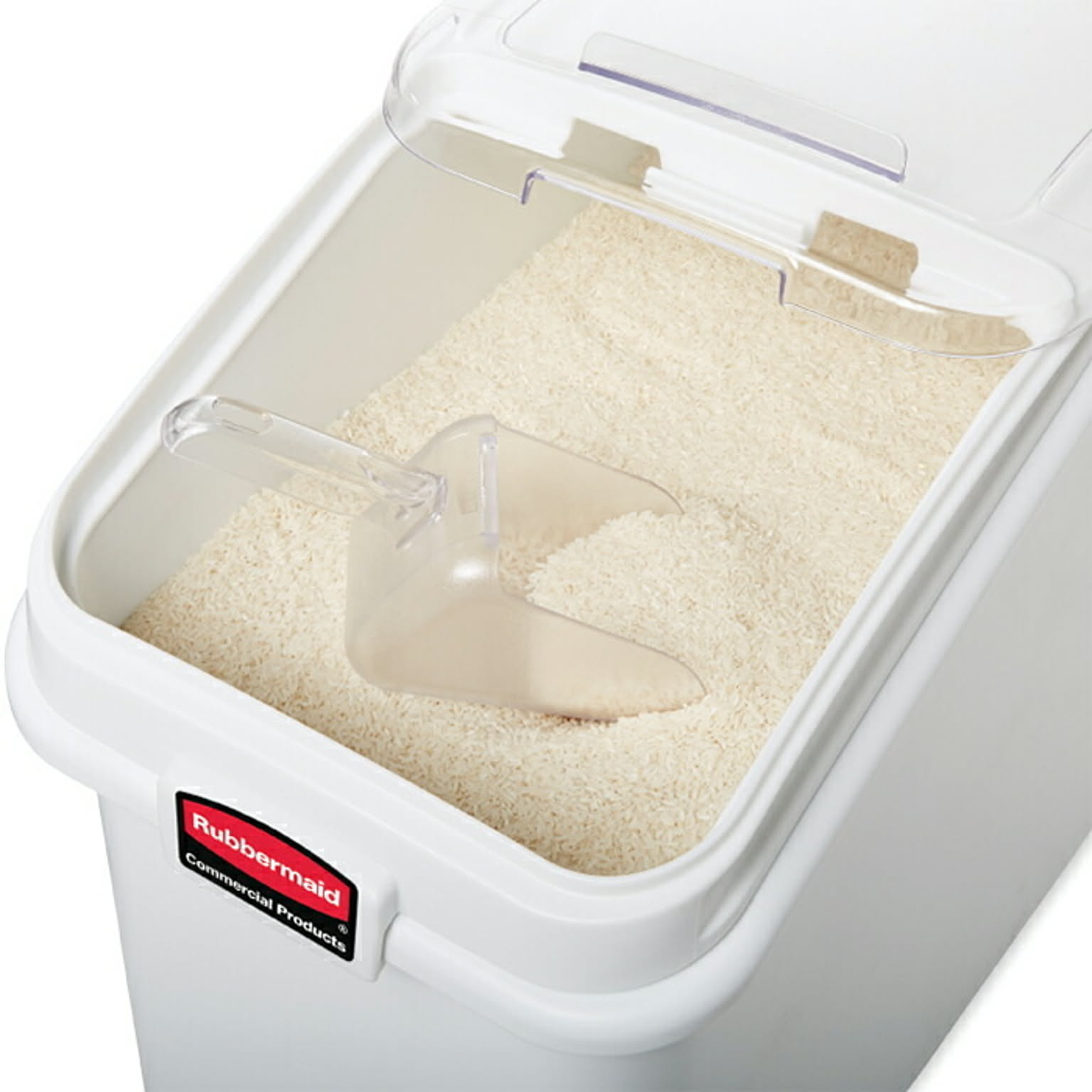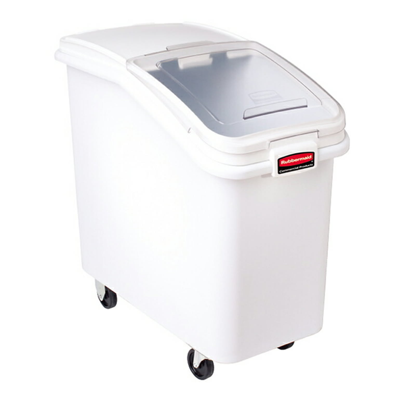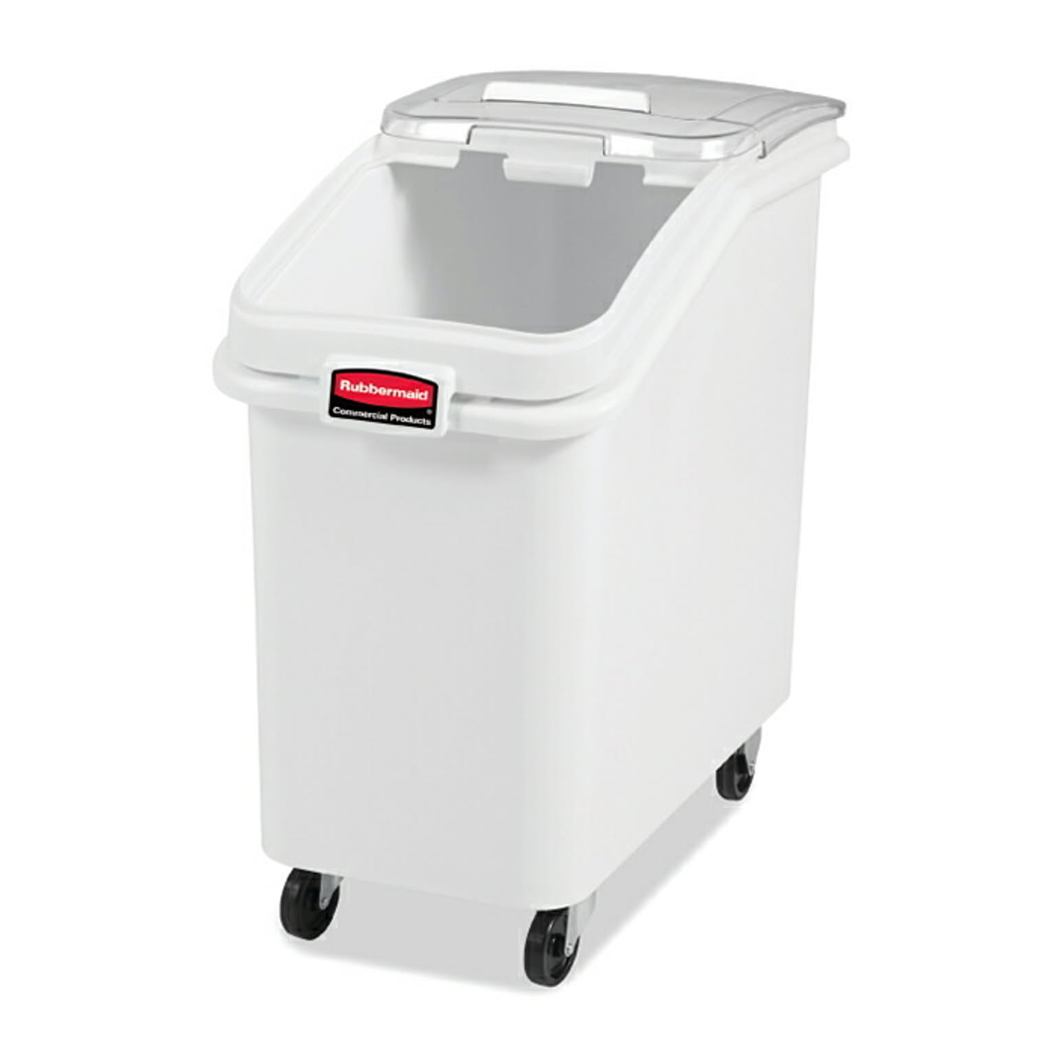 キャスター付きで移動が簡単なラバーメイドのイングリディエントビン。スライド開閉のフタと付属スクープで、食材を素早く取り出せる設計です。透明フタで収納物を一目で確認でき、業務用キッチンでの作業効率を向上させます。