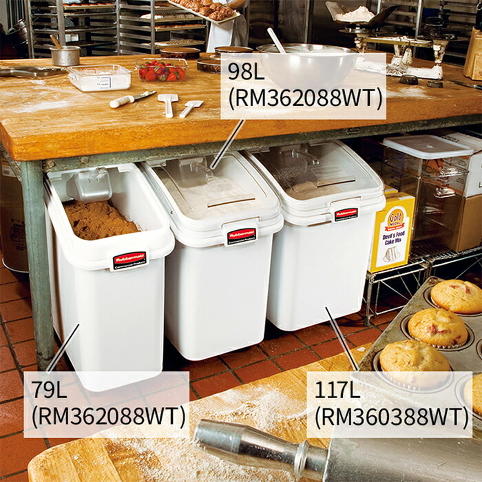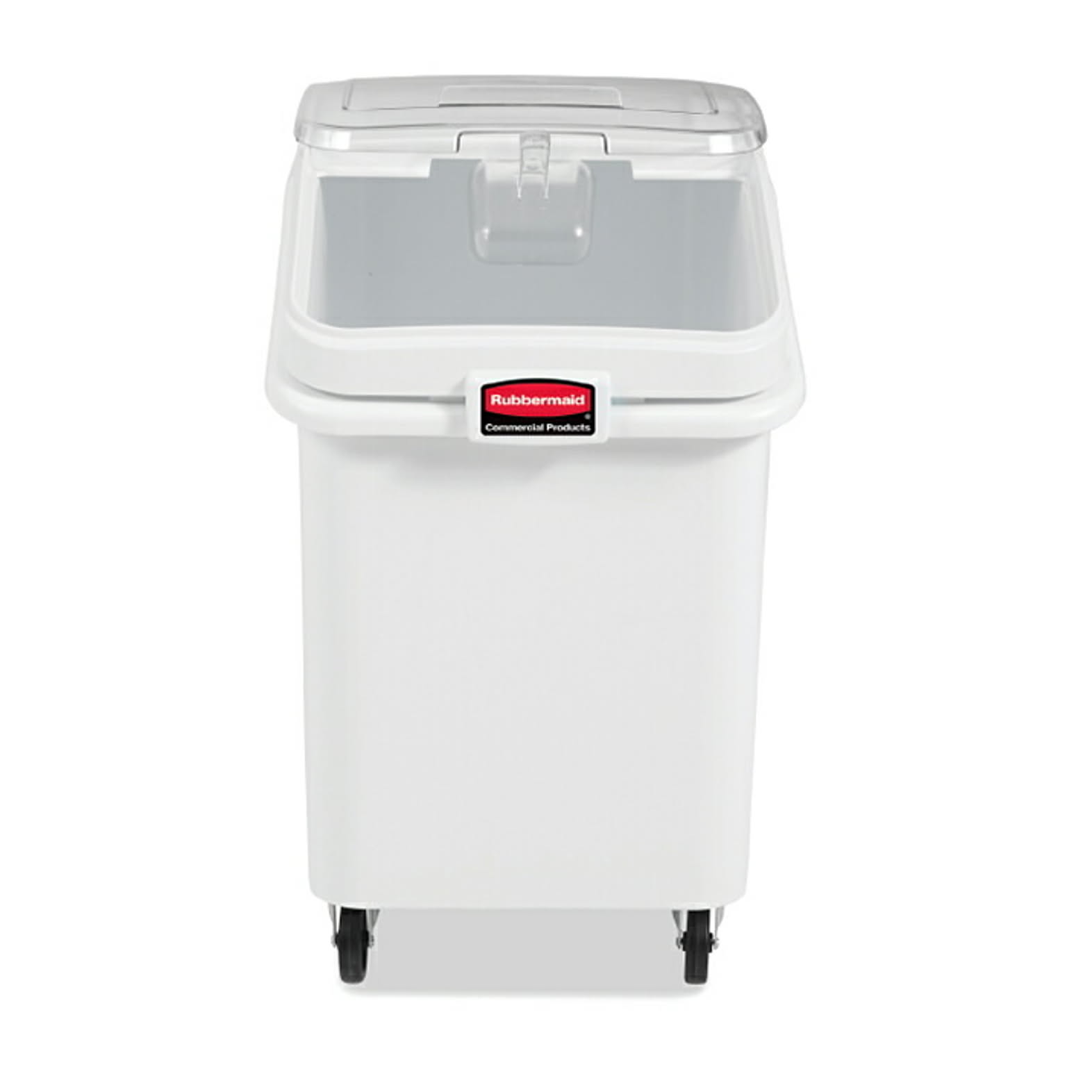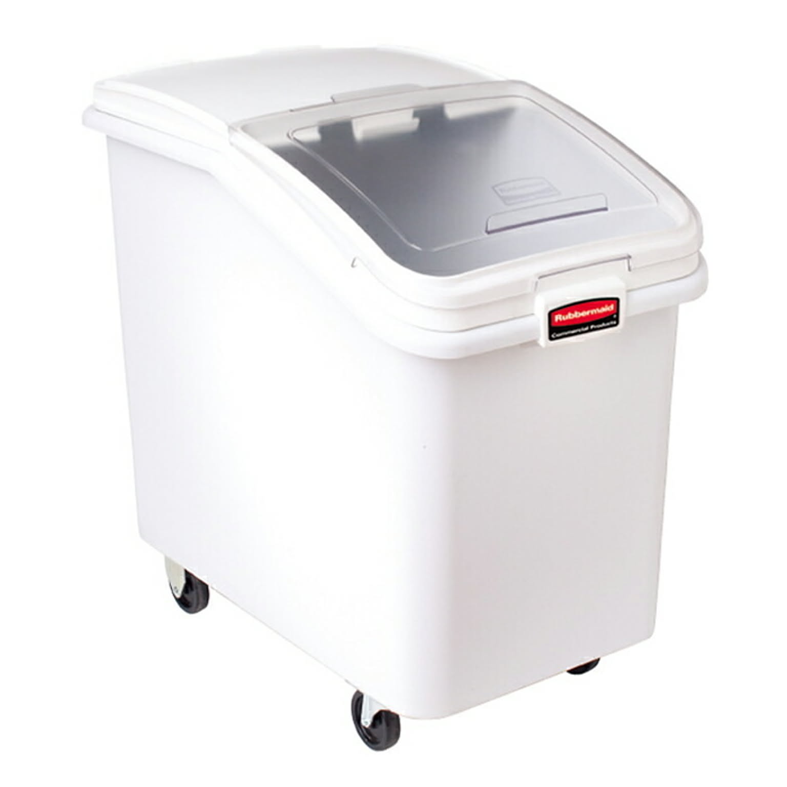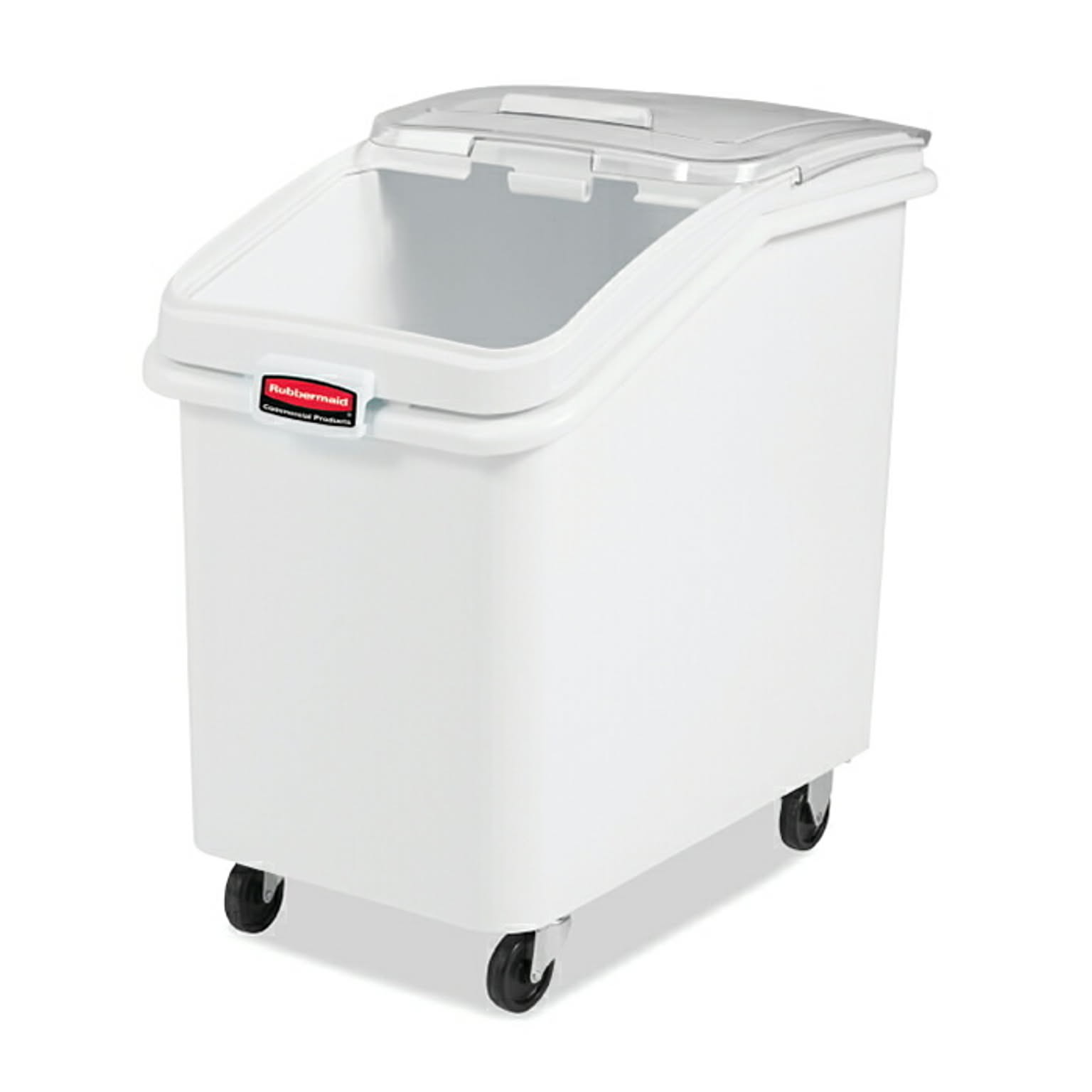 キャスター付きで移動が簡単なラバーメイドのイングリディエントビン。スライド開閉のフタと付属スクープで、食材を素早く取り出せる設計です。透明フタで収納物を一目で確認でき、業務用キッチンでの作業効率を向上させます。
