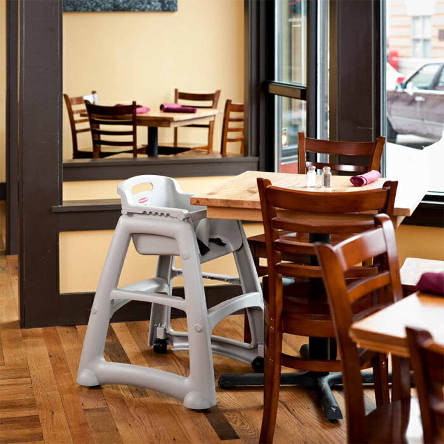マイクロバン加工を施した抗菌仕様のベビーチェアは、木製と比較して手入れが簡単で衛生的。T字バーと3点式安全ベルトを備え、お子様の安全を確保。スタッキング可能な設計で、省スペース収納が可能。トレイは片手で着脱でき、装着しない場合はテーブルにぴったり寄せて家族と一緒に食事を楽しめる。