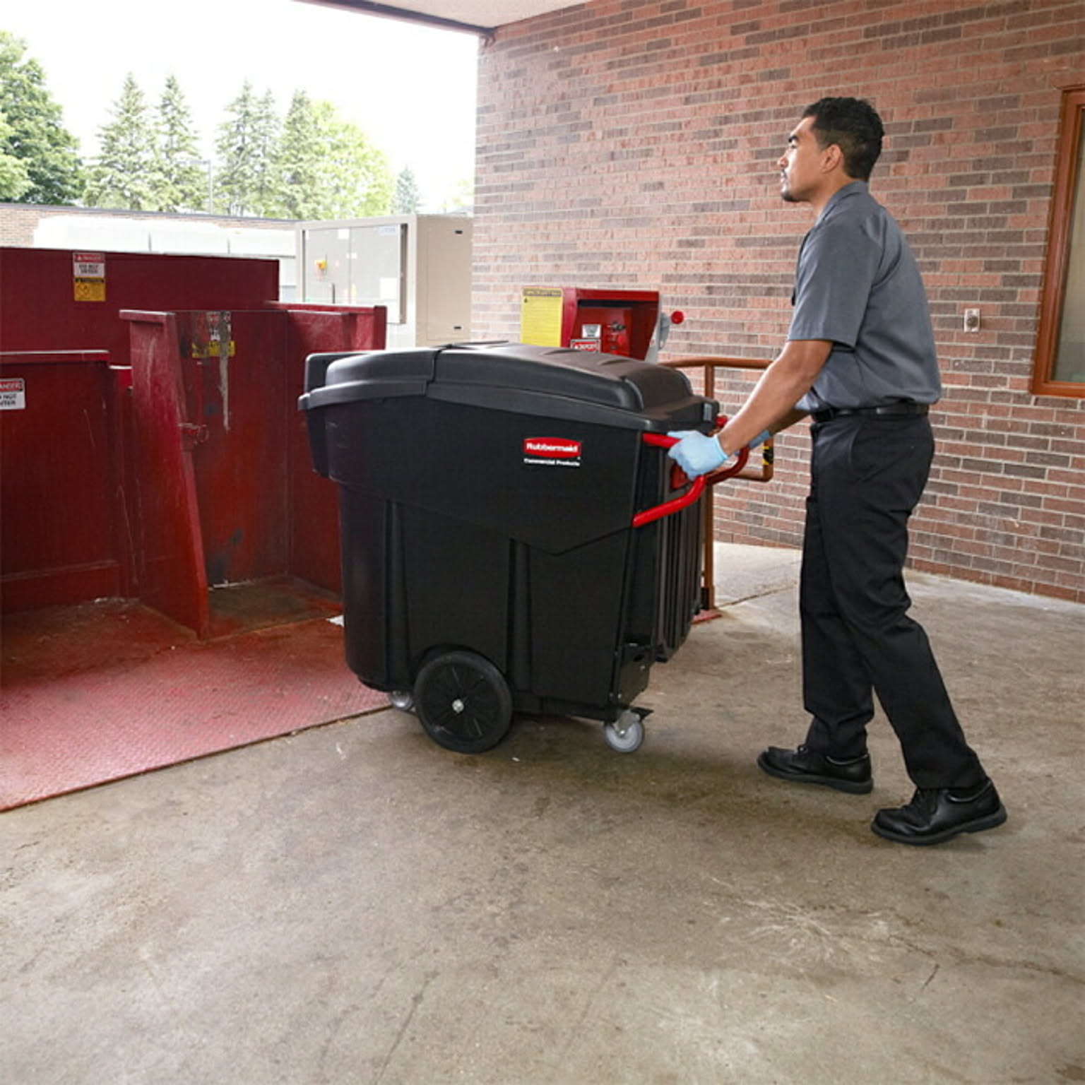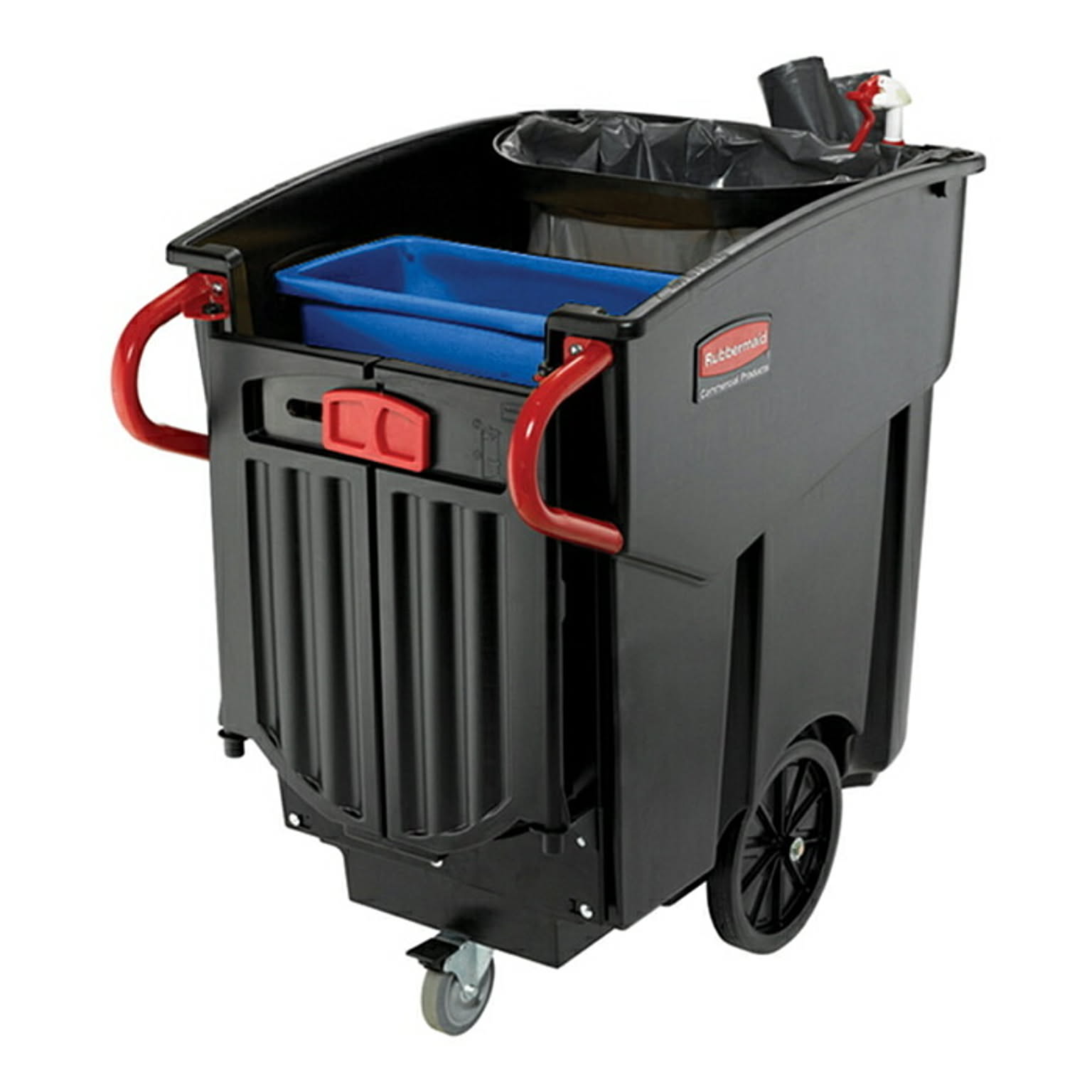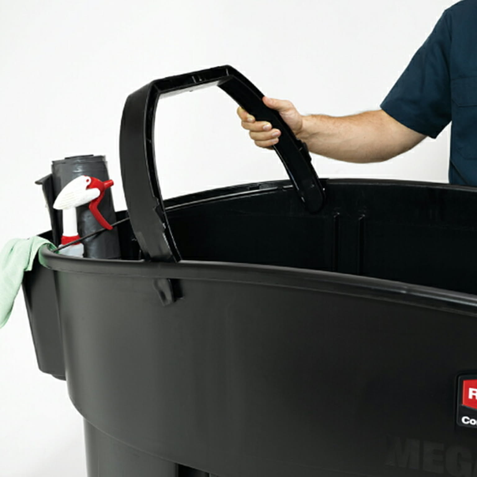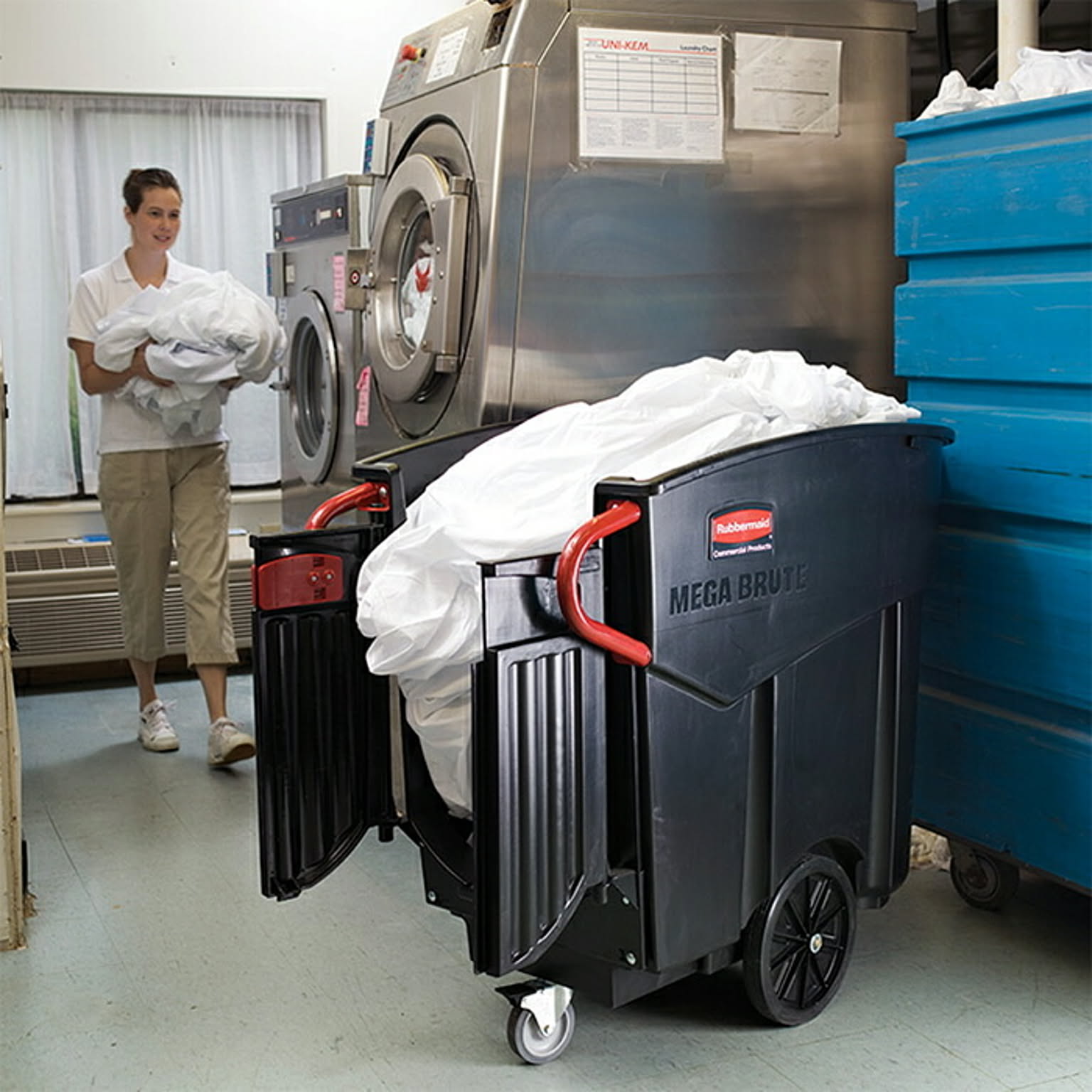 メガブルートモービルコレクターは、454Lの大容量で大量のゴミやリネンの収集に最適。スムーズに移動できる設計で、標準的なドア(91cm幅)を通過し、エレベーターの乗降も容易。背面ドア付きで重い荷物の取り出しもスムーズに行える。