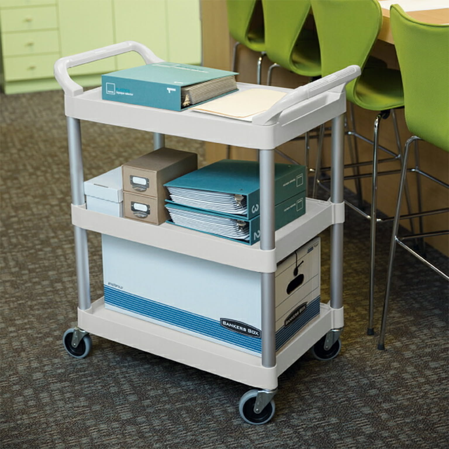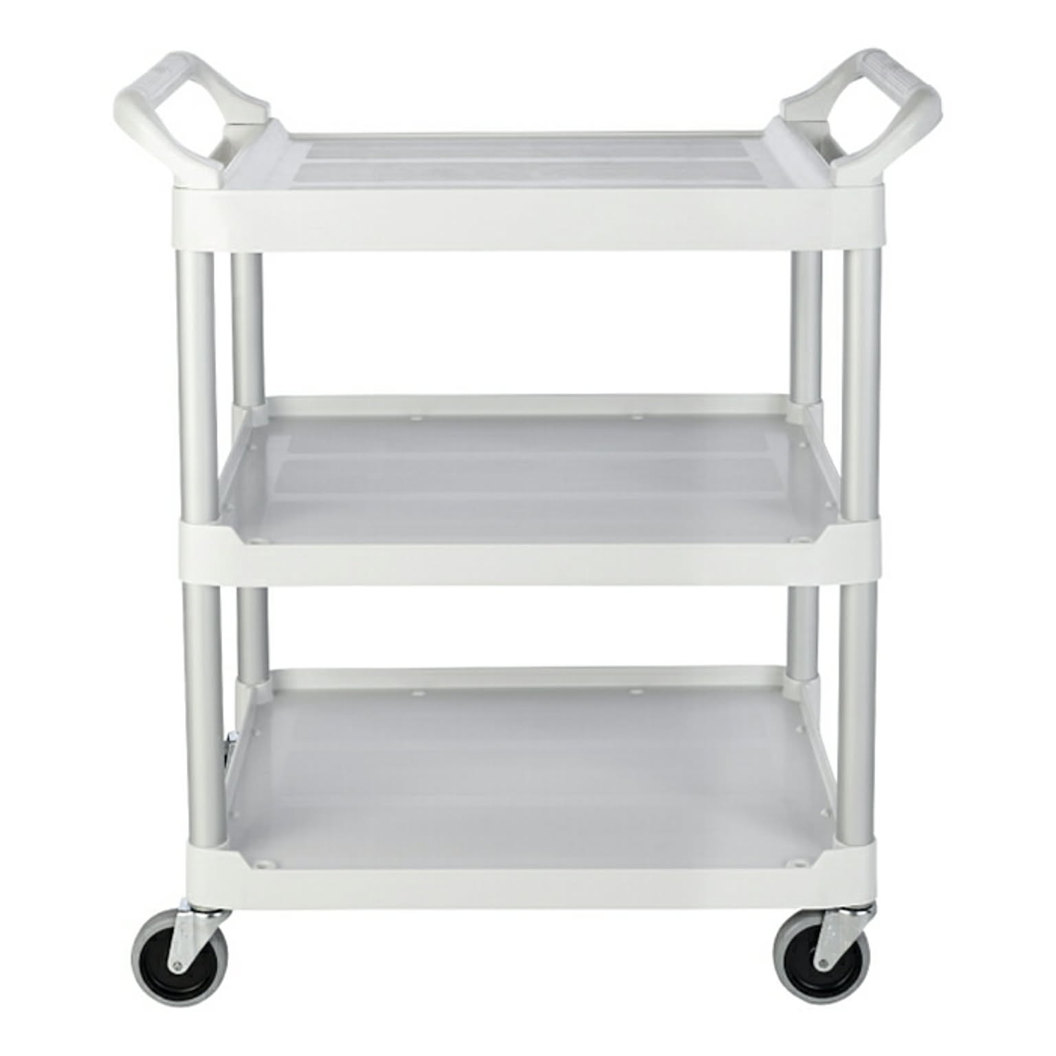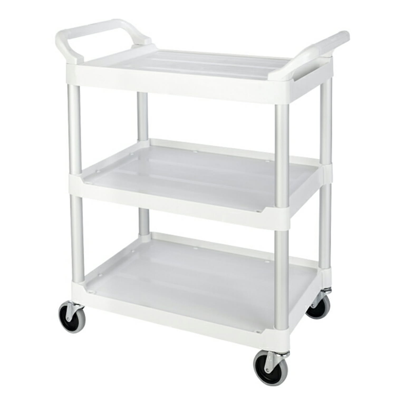 滑らかな樹脂製の3段カートで、倉庫、オフィス、医療施設など幅広い用途に対応。直径102mmの自在キャスターがスムーズな移動を実現し、両側に設置されたハンドルで操作性も向上。最大耐荷重約90kgの頑丈な設計。