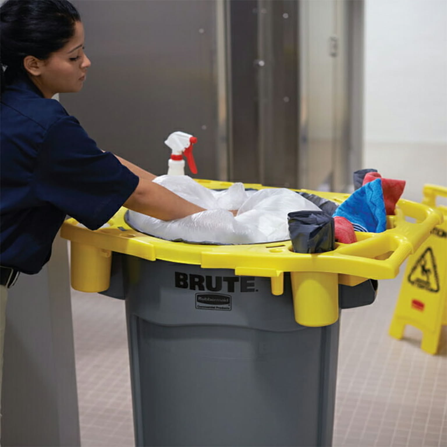44ガロン(166.5L)BRUTE(R)コンテナの上部にしっかり固定できるリムキャディ。スプレーボトルやゴミ袋などの清掃用具を手元に置きながら作業できるため、効率が向上。持ち手付きで移動もスムーズに。