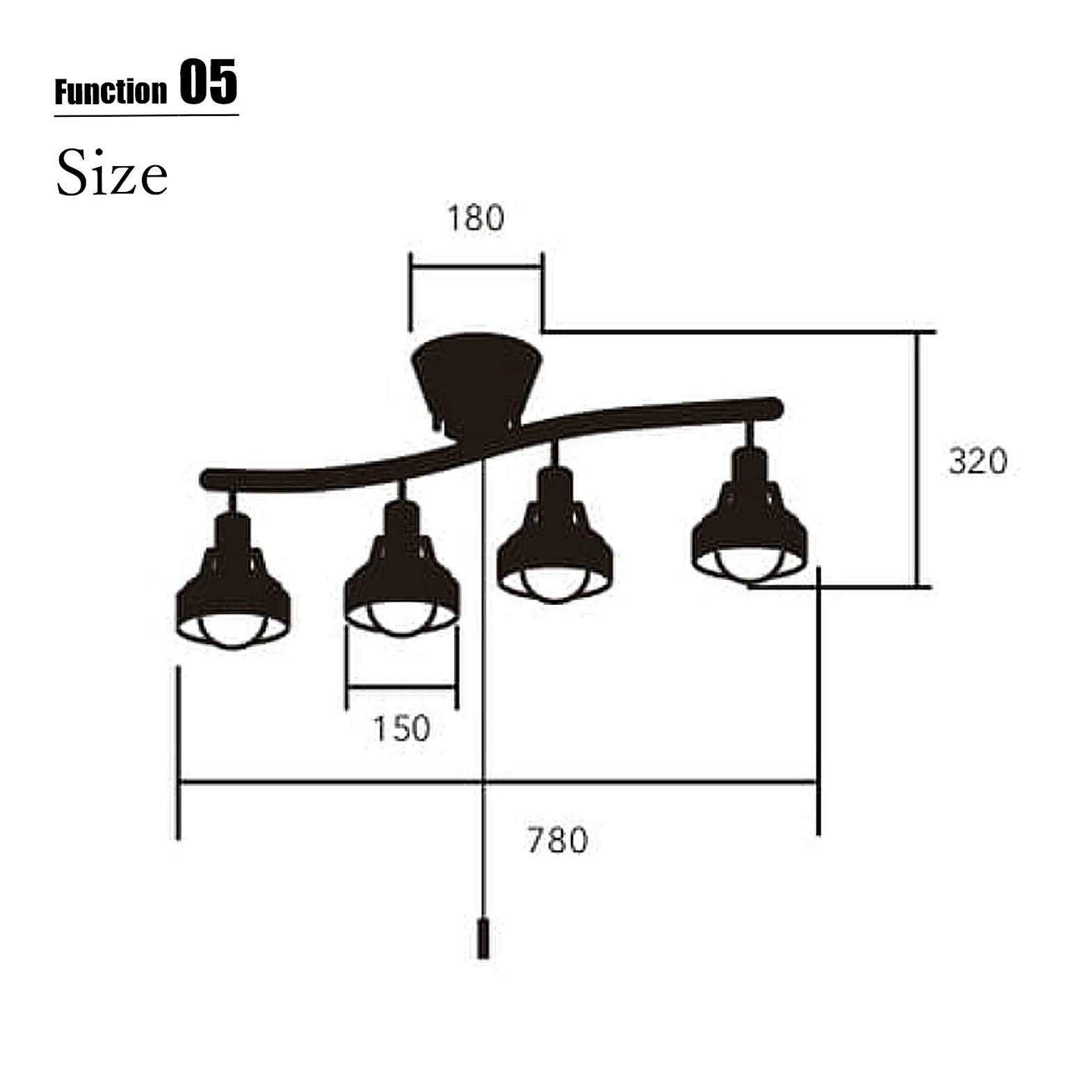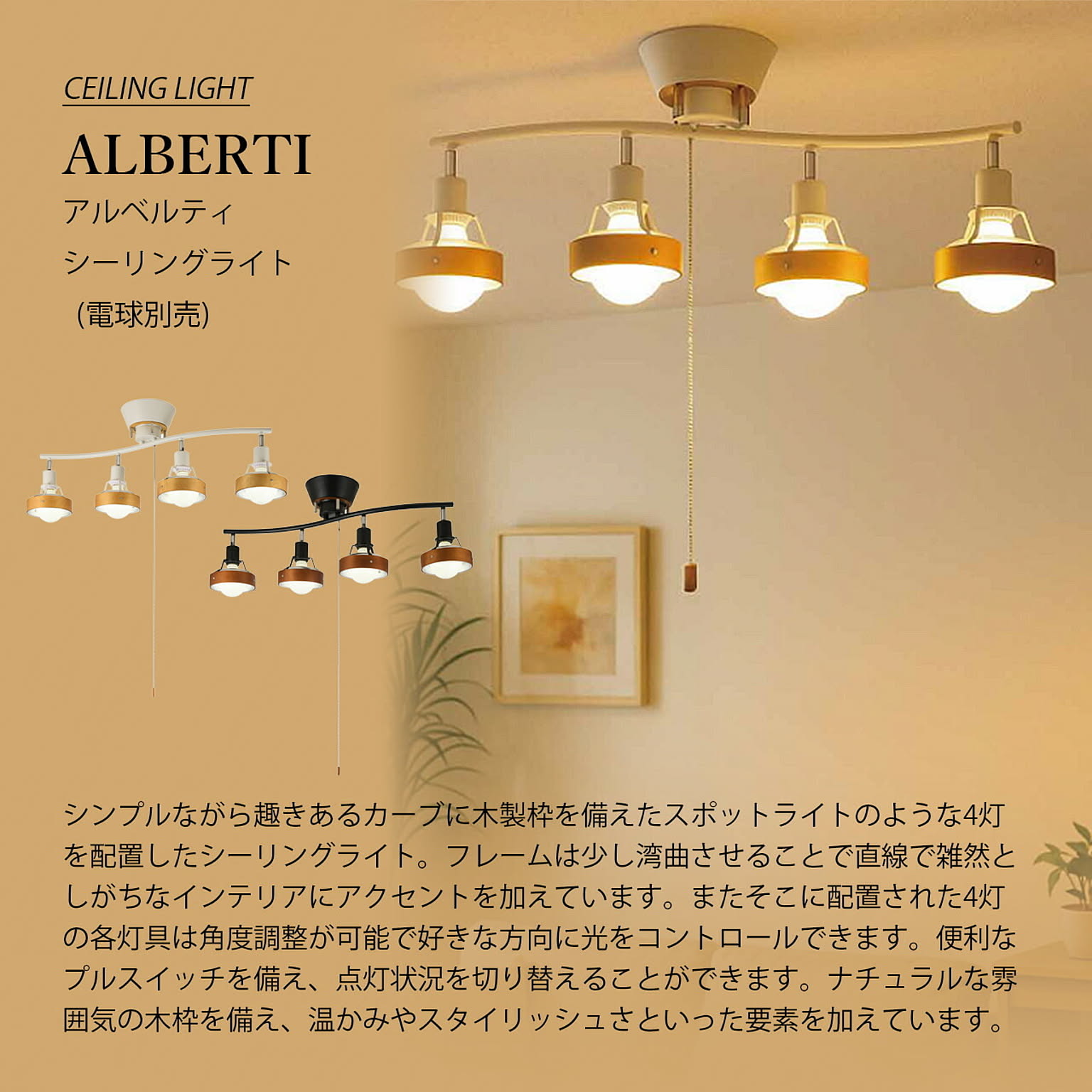 シンプルながら趣きあるカーブに木製枠を備えたスポットライトのような4灯を配置したシーリングライト。フレームは少し湾曲させることで直線で雑然としがちなインテリアにアクセントを加えています。またそこに配置された4灯の各灯具は角度調整が可能で好きな方向に光をコントロールできます。便利なプルスイッチを備え、点灯状況を切り替えることができます。ナチュラルな雰囲気の木枠を備え、温かみやスタイリッシュさといった要素を加えています。