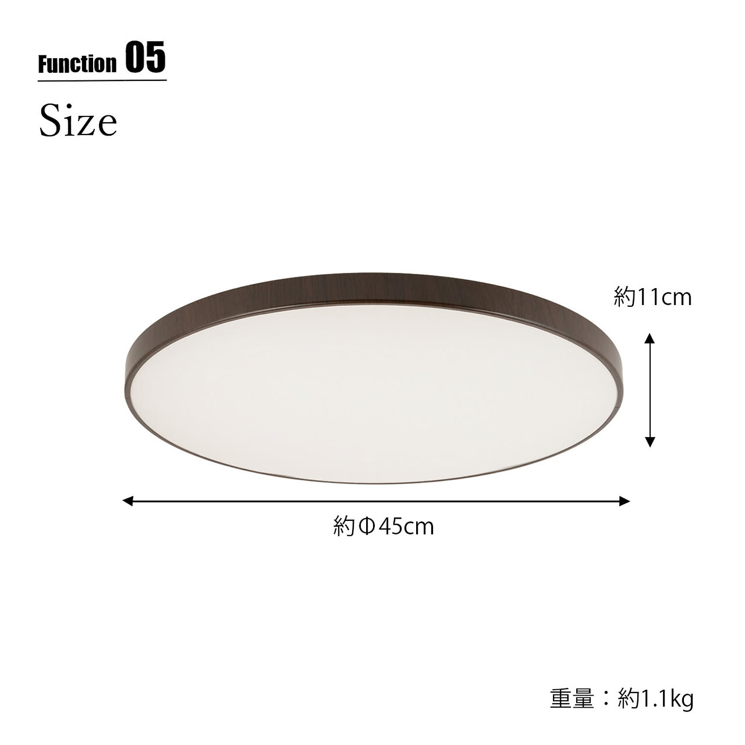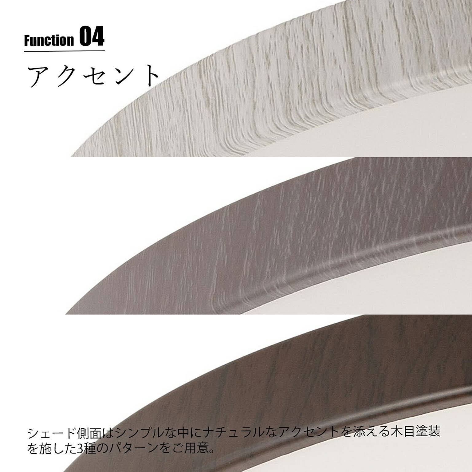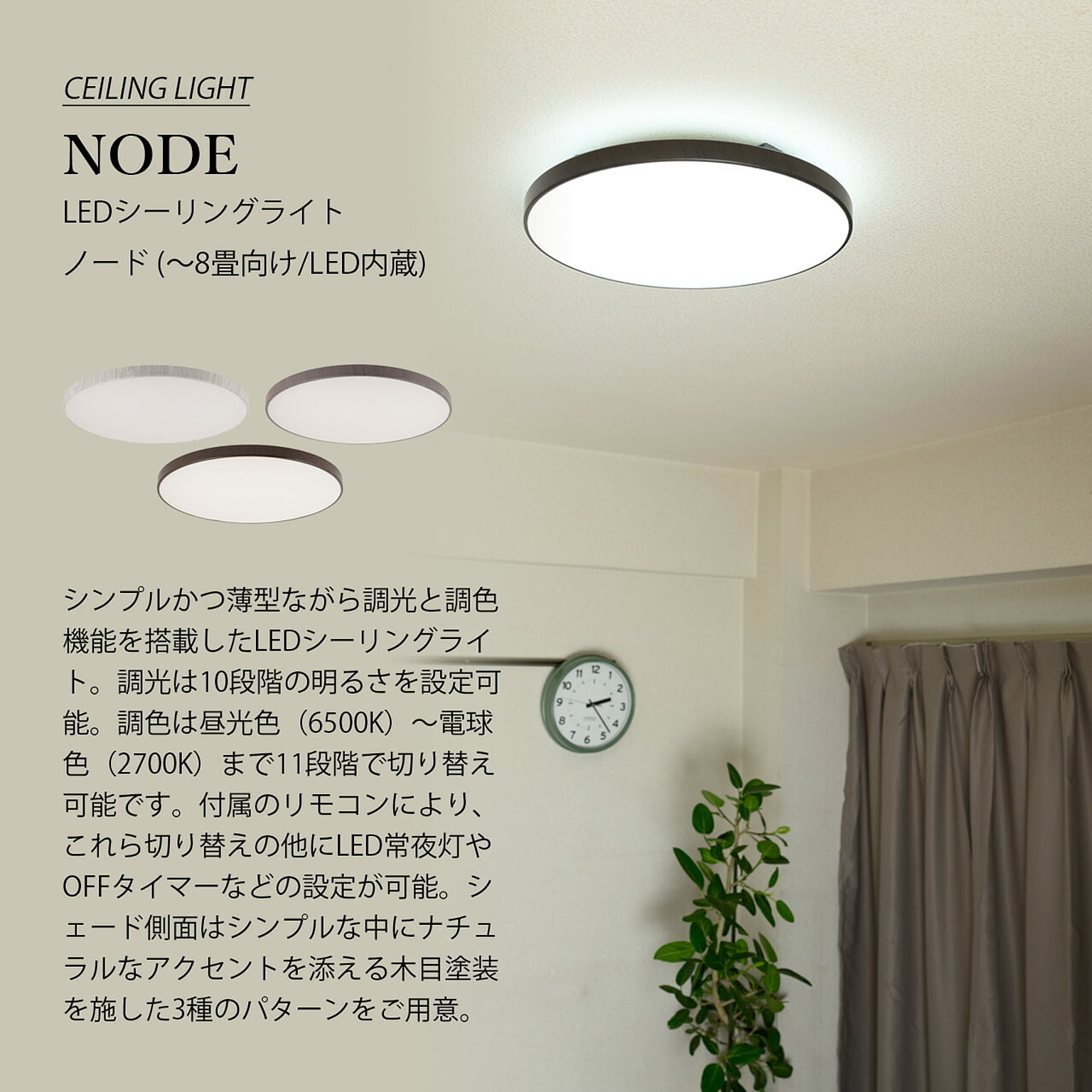 シンプルかつ薄型ながら調光と調色機能を搭載したLEDシーリングライト。調光は10段階の明るさを設定可能。調色は昼光色(6500K)〜電球色(2700K)まで11段階で切り替え可能です。付属のリモコンにより、これら切り替えの他にLED常夜灯やOFFタイマーなどの設定が可能。シェード側面はシンプルな中にナチュラルなアクセントを添える木目塗装を施した3種のパターンをご用意。