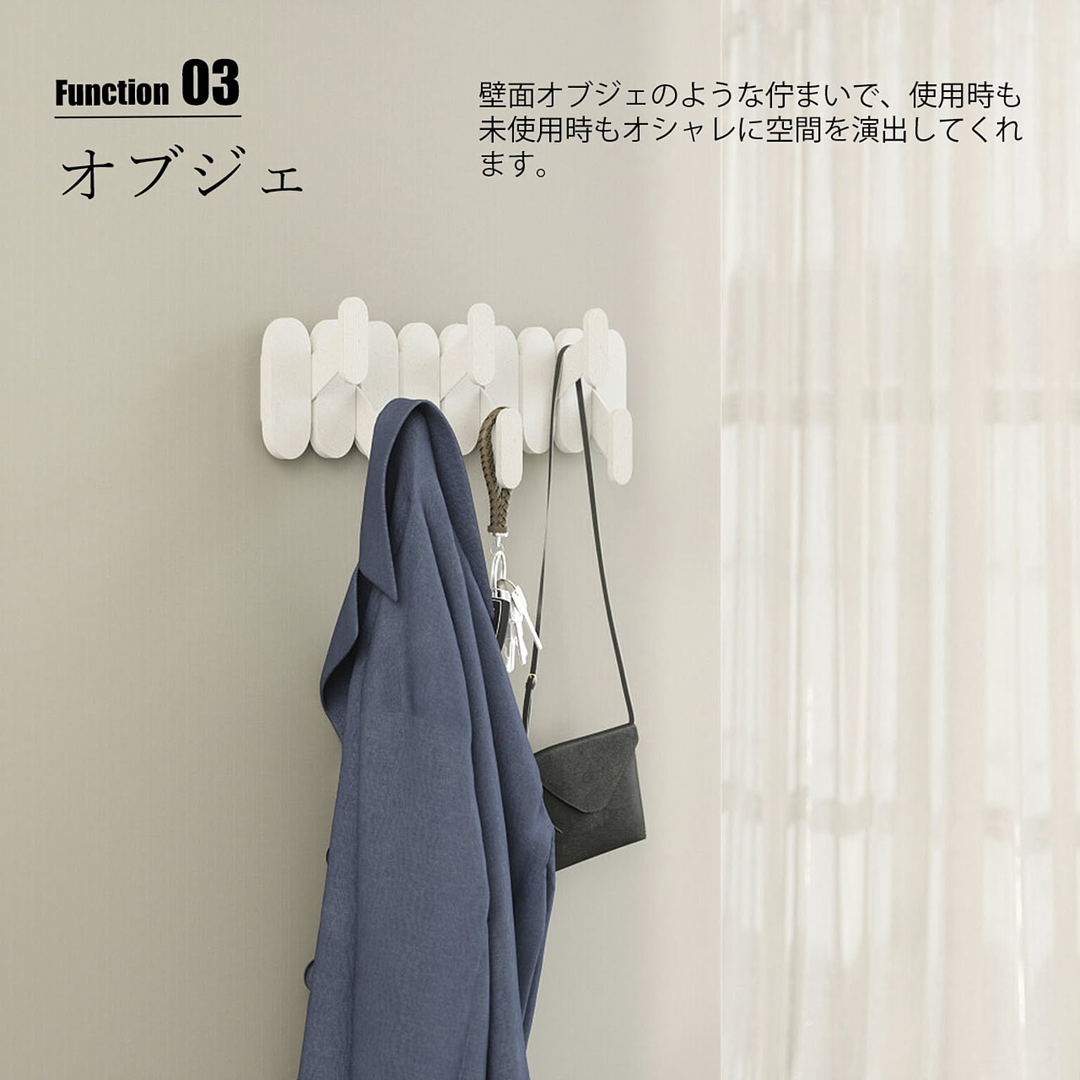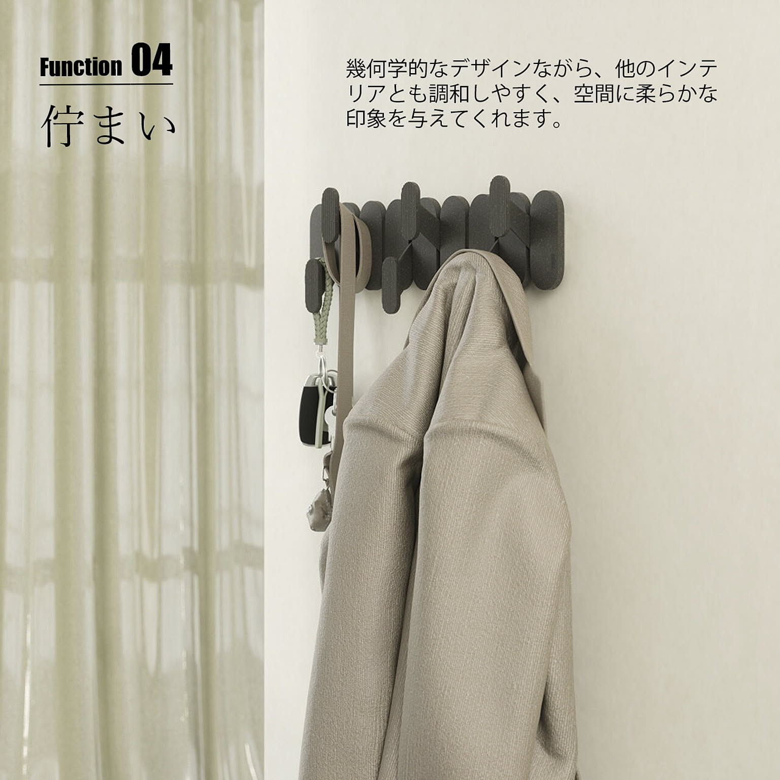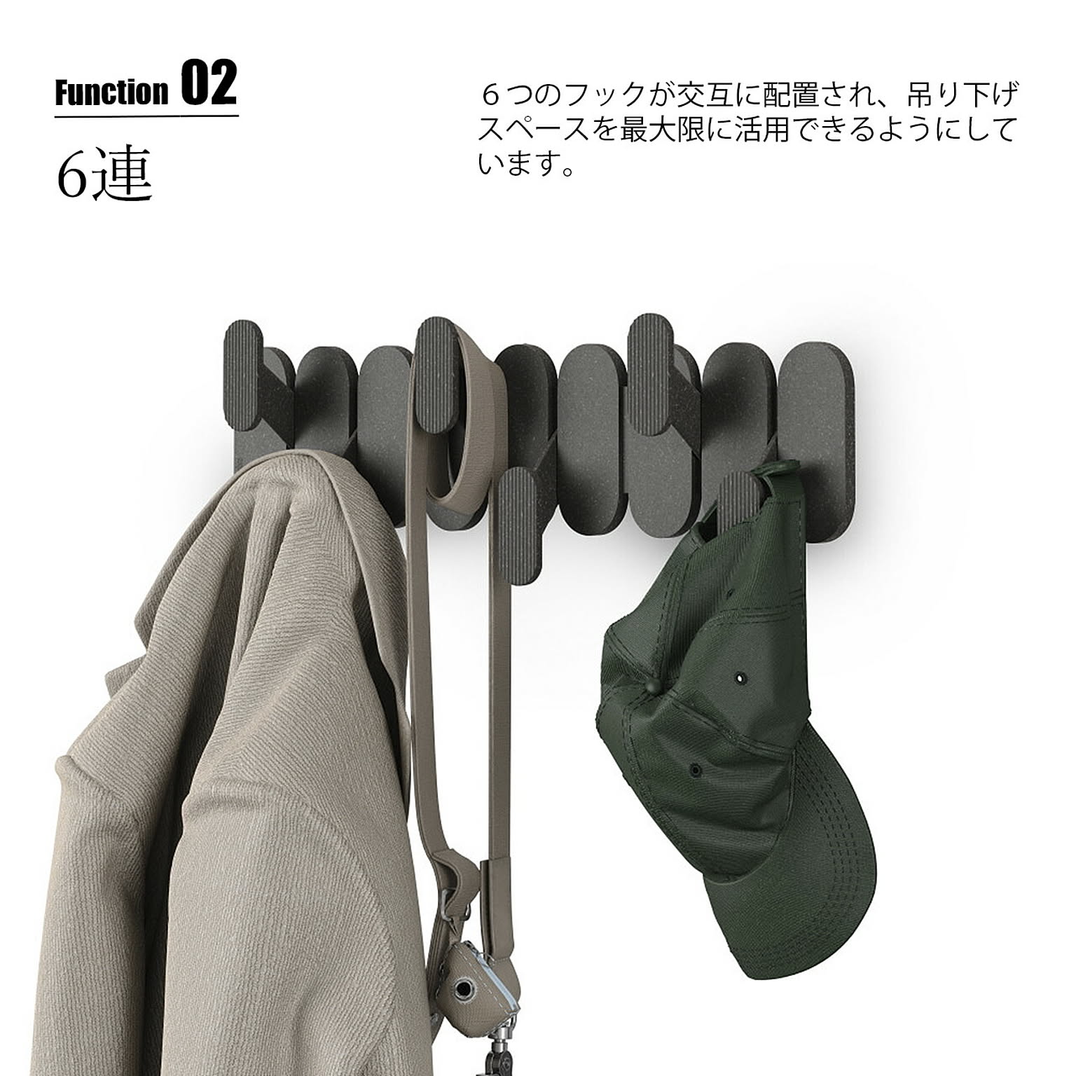 モダンなスタイルと日常的な機能性を、洗練された壁掛けデザインに融合させました。6つのフックが交互に配置され、吊り下げスペースを最大限に活用しながら、壁に印象的でグラフィカルな雰囲気を演出します。耐荷重は各フックあたり約2.3kgでコートやバッグ、タオルなど様々な引っ掛け収納に対応します。