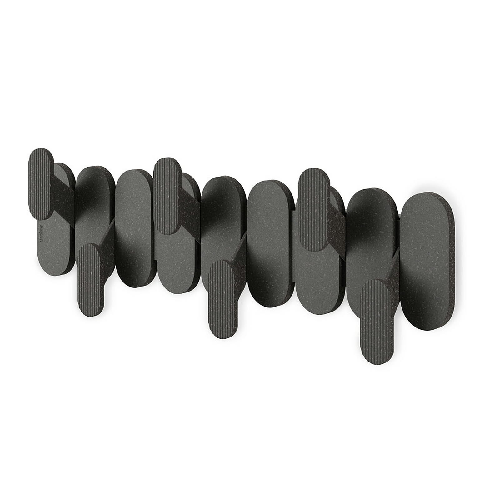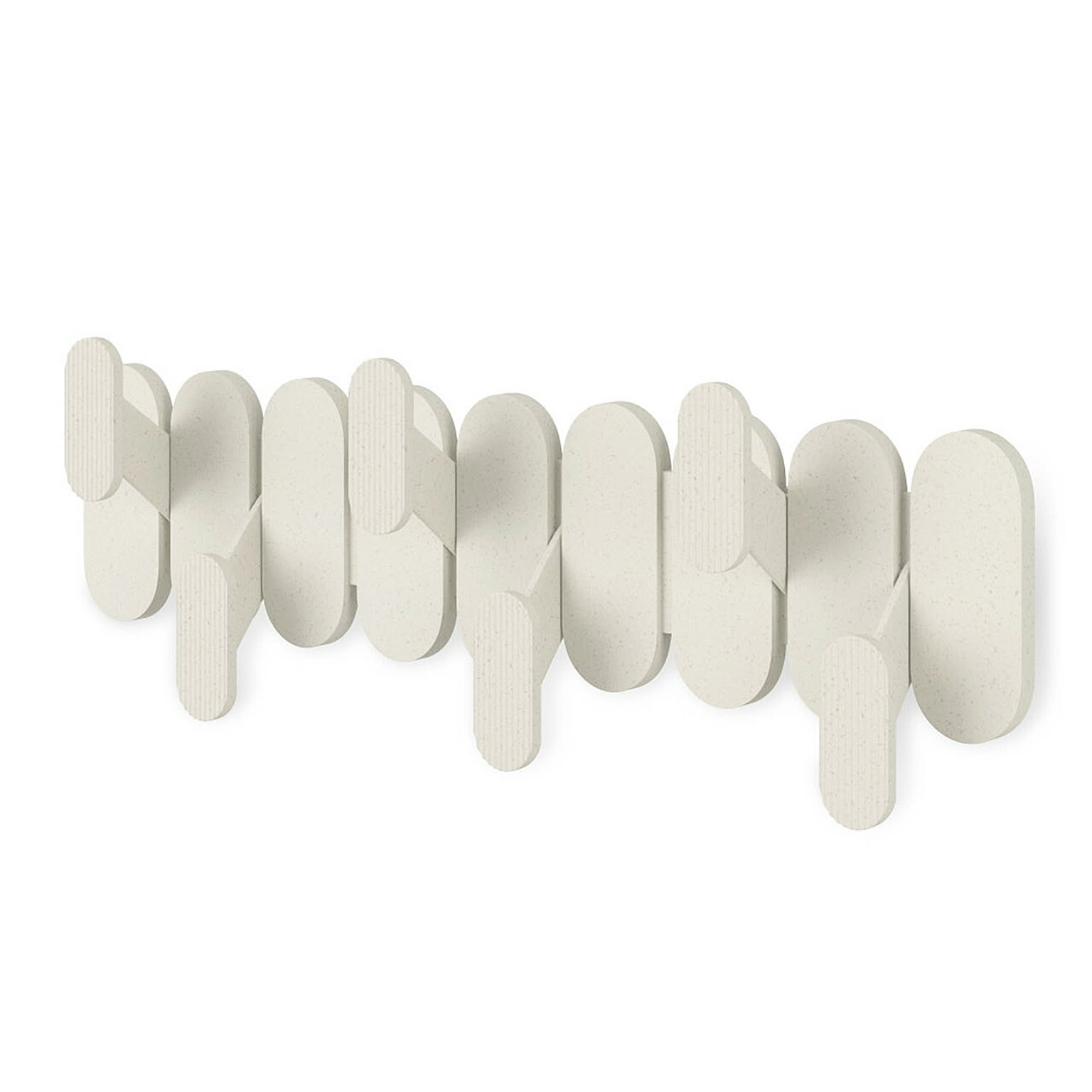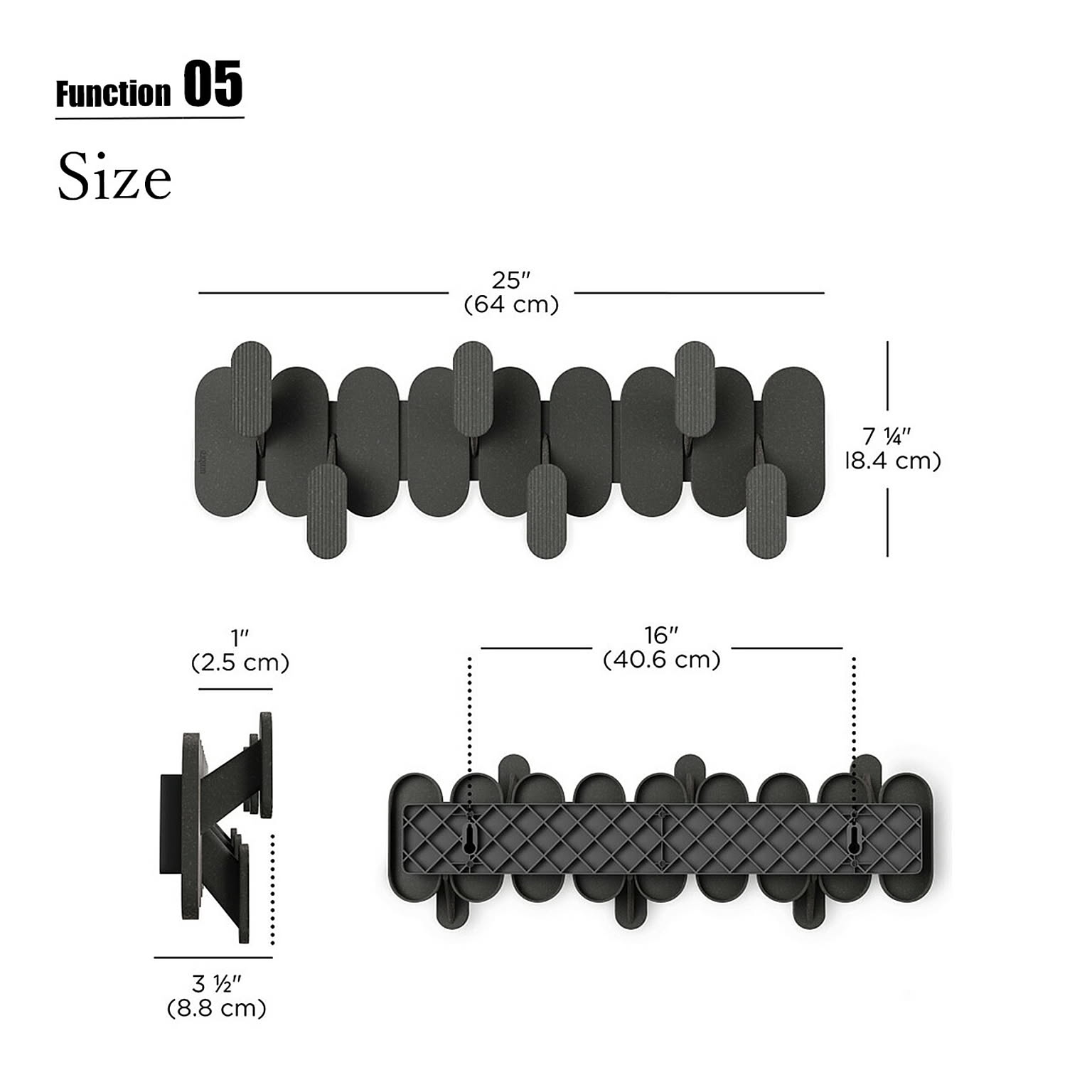モダンなスタイルと日常的な機能性を、洗練された壁掛けデザインに融合させました。6つのフックが交互に配置され、吊り下げスペースを最大限に活用しながら、壁に印象的でグラフィカルな雰囲気を演出します。耐荷重は各フックあたり約2.3kgでコートやバッグ、タオルなど様々な引っ掛け収納に対応します。