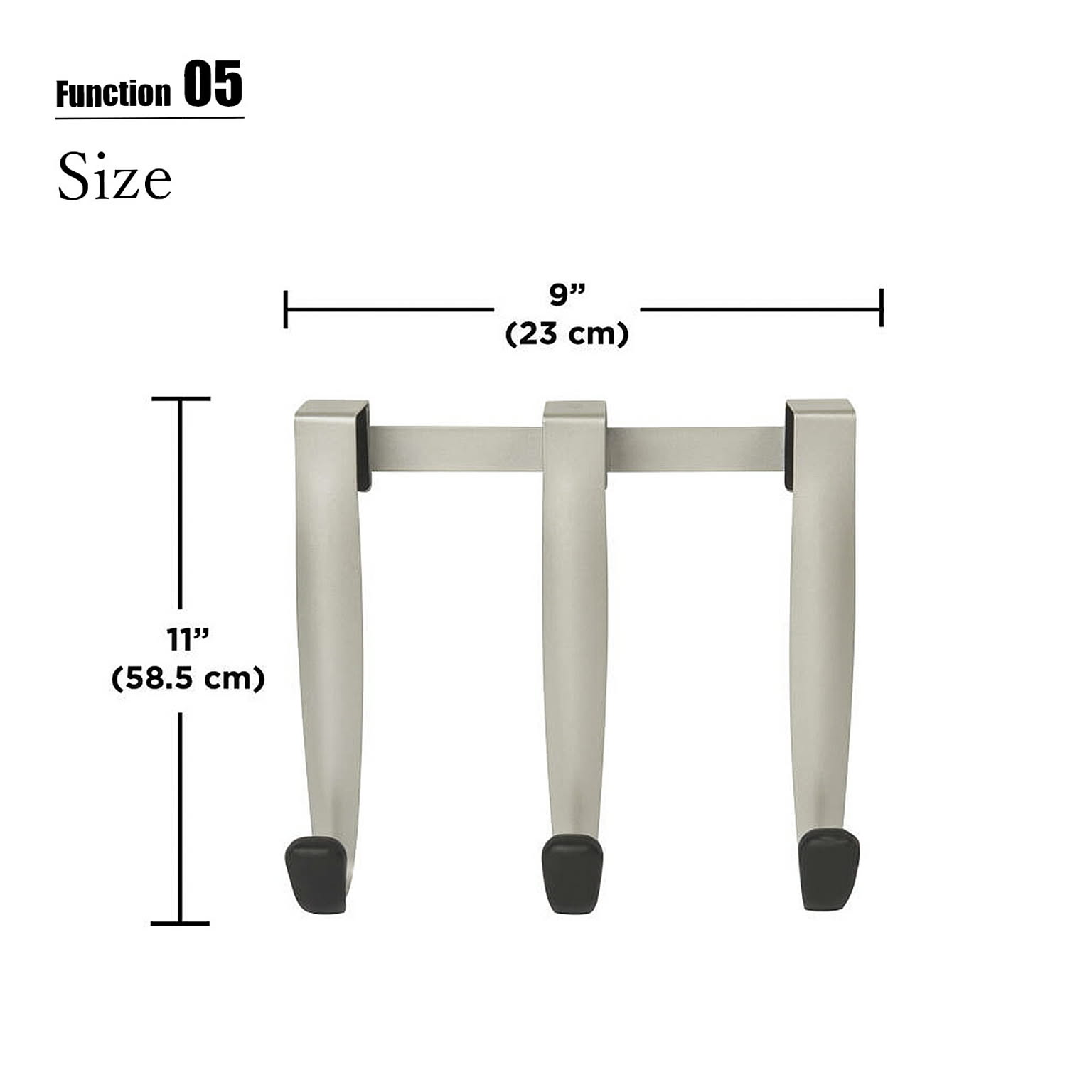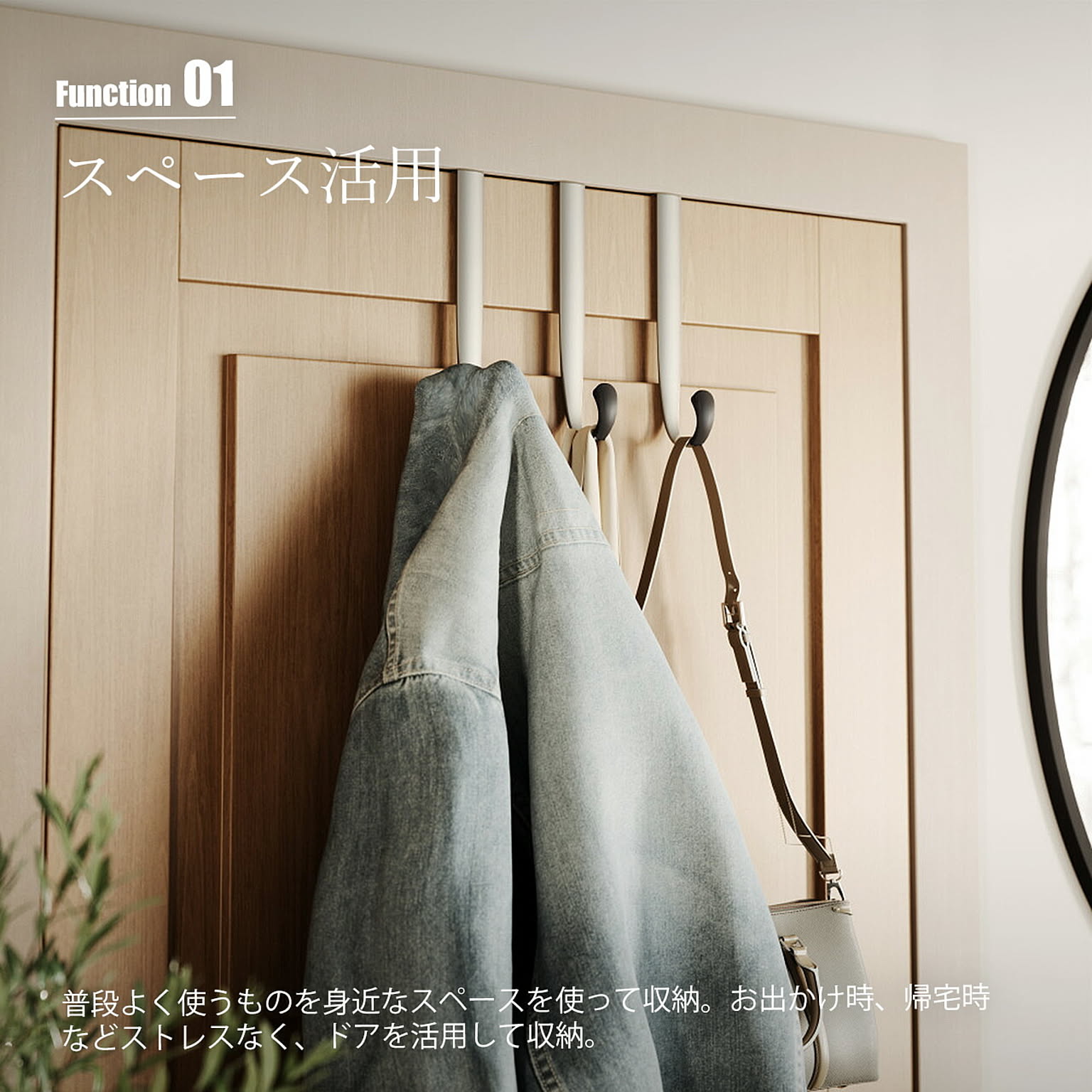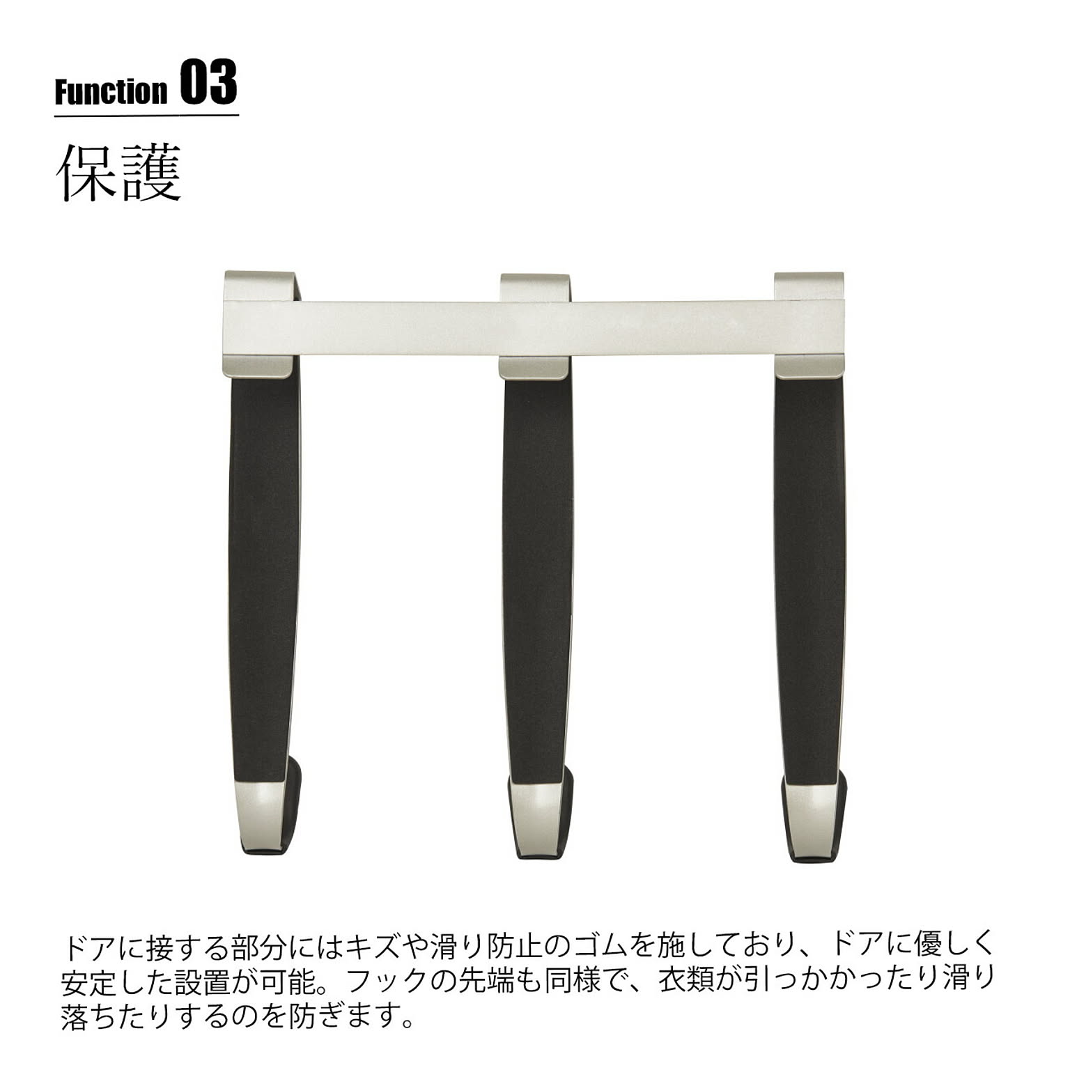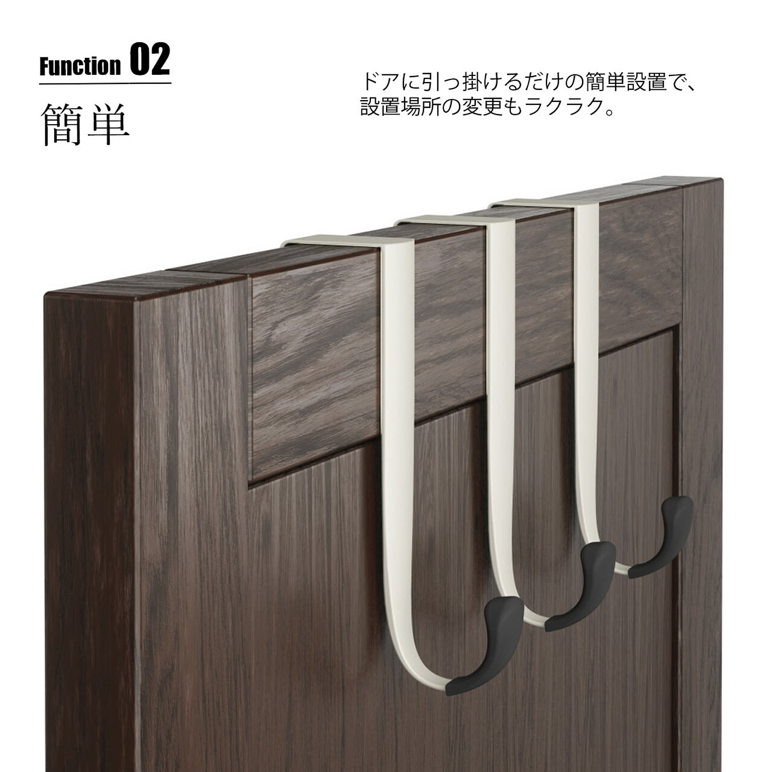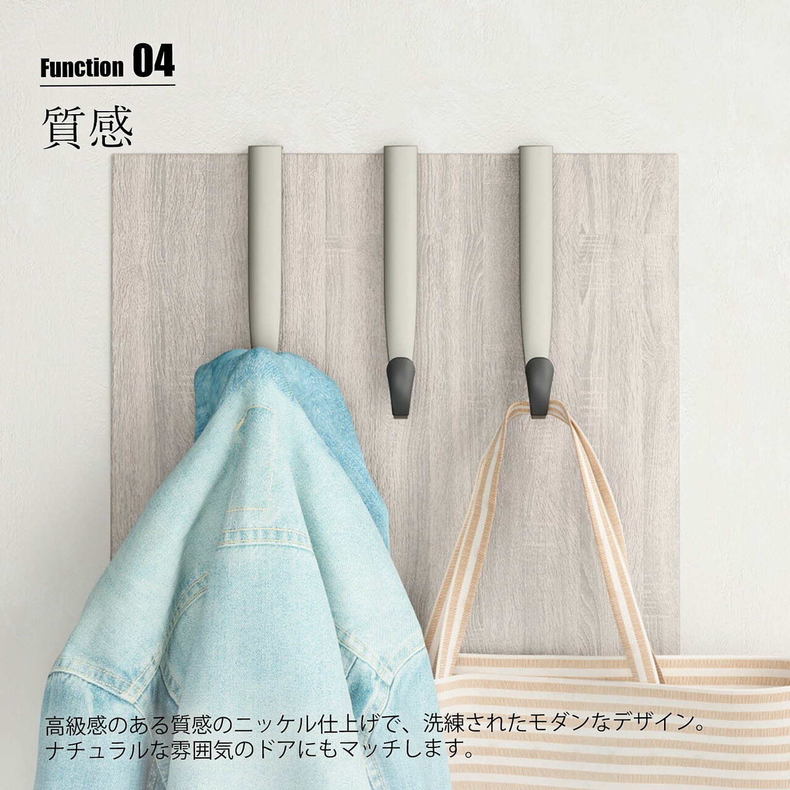 洗練されたモダンなデザイン、質感のあるニッケル仕上げのドア掛けフック。ドアに接する部分にはキズや滑り防止のゴムを施しており、ドアに優しく安定した設置が可能。フックの先端も同様で、衣類が引っかかったり滑り落ちたりするのを防ぎます。各フックの耐荷重は最大約2.3kgで様々なものを引っ掛け収納できます。ドアに引っ掛けるだけの簡単設置で、設置場所の変更もラクラク。
