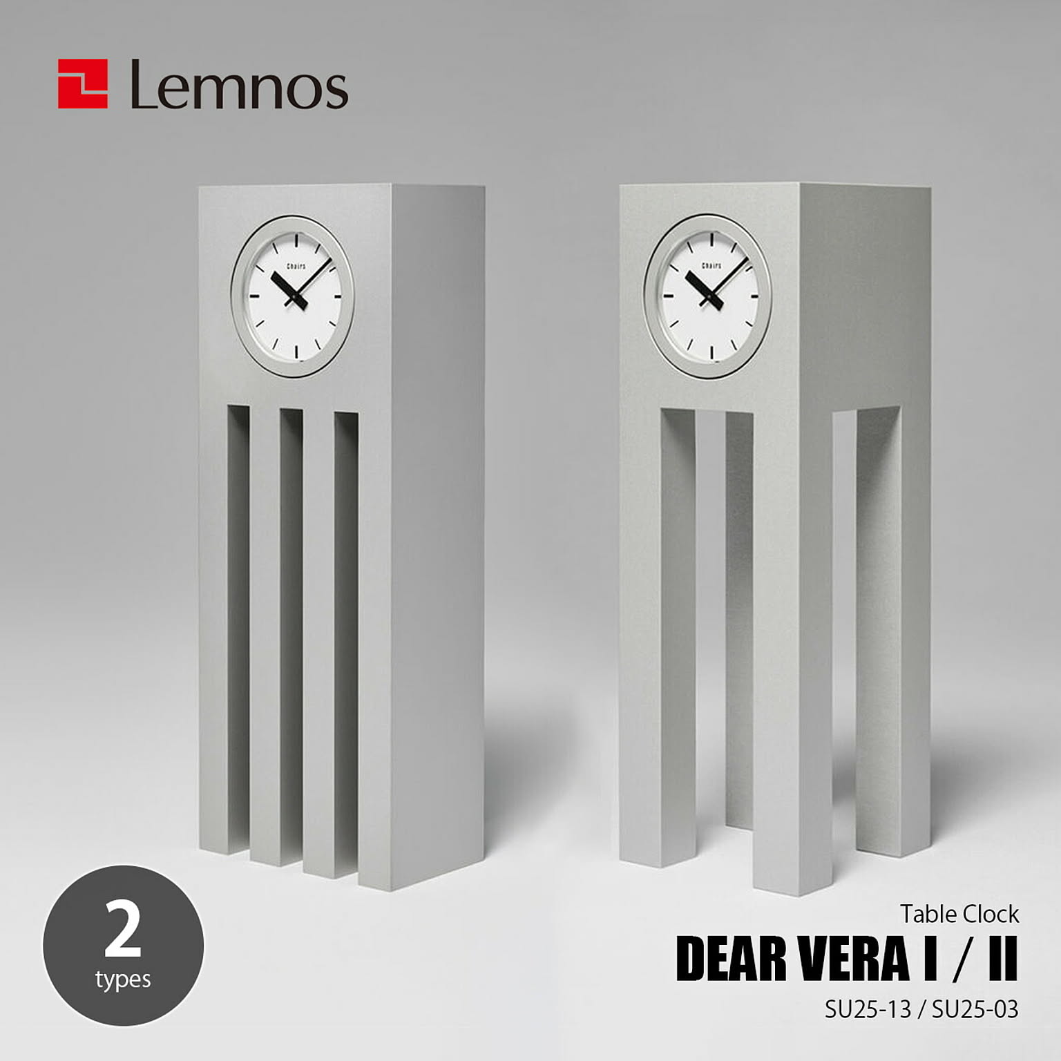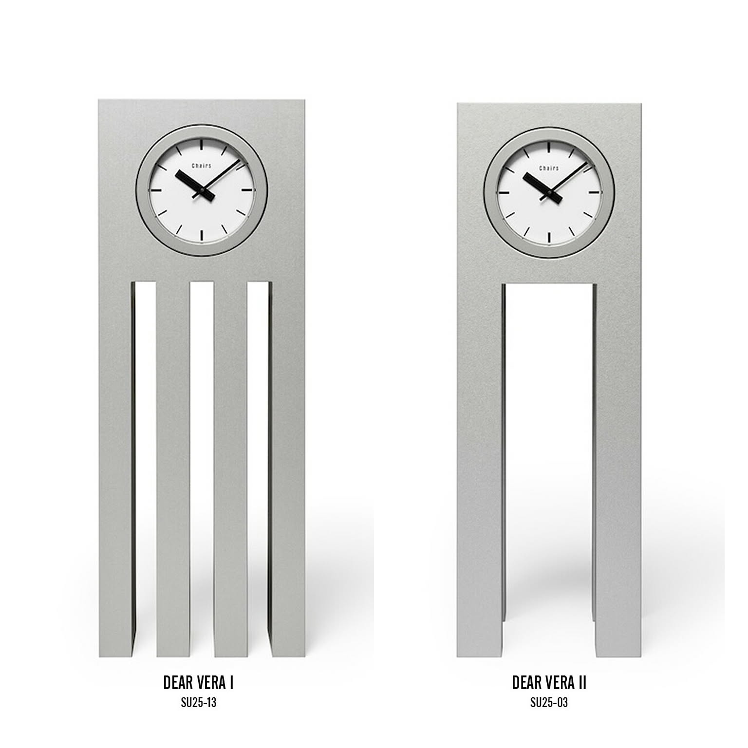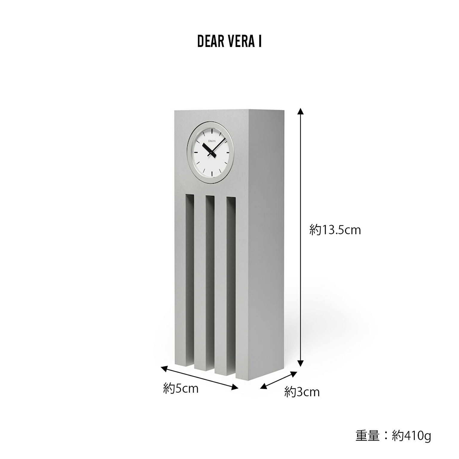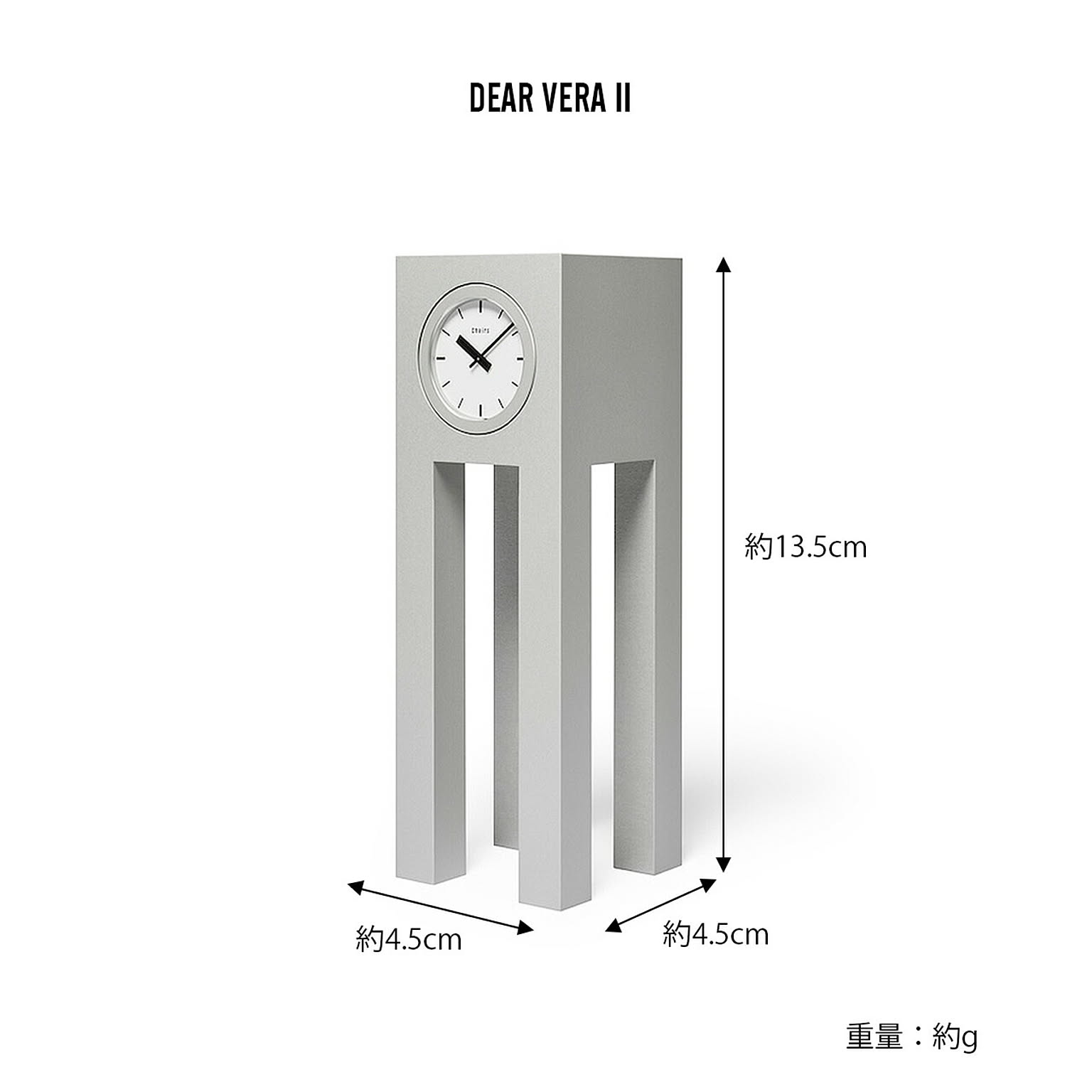 日本を代表するデザイナーで多岐にわたる活動を行った内田繁氏。20世紀を代表する建築家の一人であるアルド・ロッシ氏がデザイナーズホテルの先駆けとして1989年に手掛けた「ホテル イル・パラッツォ」の建築にディレクションとインテリアデザインで関わり、このホテルのためのホールクロック「DEAR MORRIS」をデザイン。その同時期に同じ流れをくむフォルムを持つ卓上時計としてデザインされたのが「DEAR VERA」。Veraはロッシのお嬢さんの名前でロッシに対する内田の敬意が込められている。一見シンプルに見えるDEAR VERAは、アルミ製の本体にウォッチムーブメントを組み込んだ、特殊な構造により実現したデザイン。細部にわたりオリジナルを丁寧に再現し復刻しました。