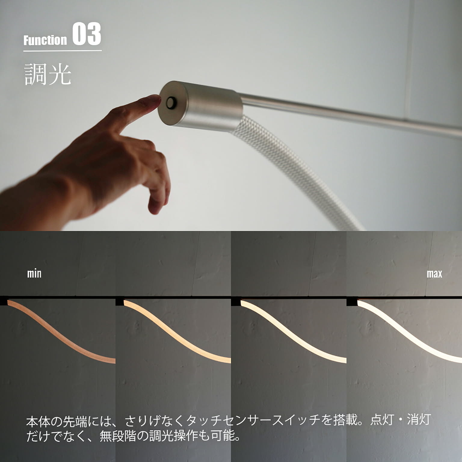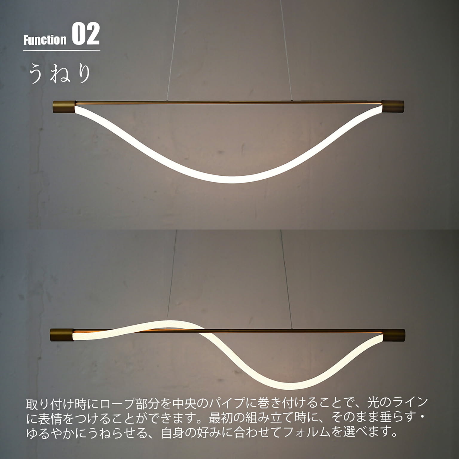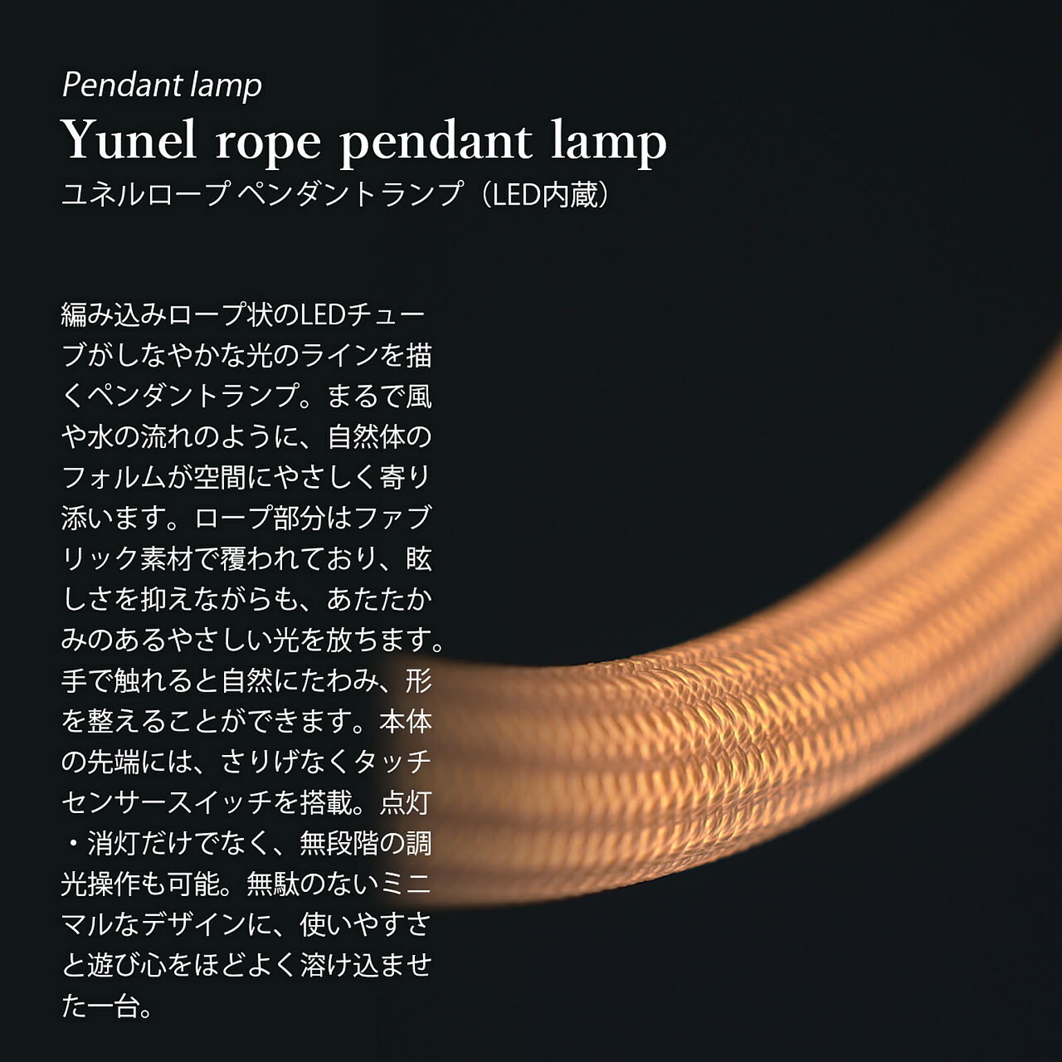 編み込みロープ状のLEDチューブがしなやかな光のラインを描くペンダントランプ。まるで風や水の流れのように、自然体のフォルムが空間にやさしく寄り添います。ロープ部分はファブリック素材で覆われており、眩しさを抑えながらも、あたたかみのあるやさしい光を放ちます。手で触れると自然にたわみ、形を整えることができます。本体の先端には、さりげなくタッチセンサースイッチを搭載。点灯・消灯だけでなく、無段階の調光操作も可能。無駄のないミニマルなデザインに、使いやすさと遊び心をほどよく溶け込ませた一台。