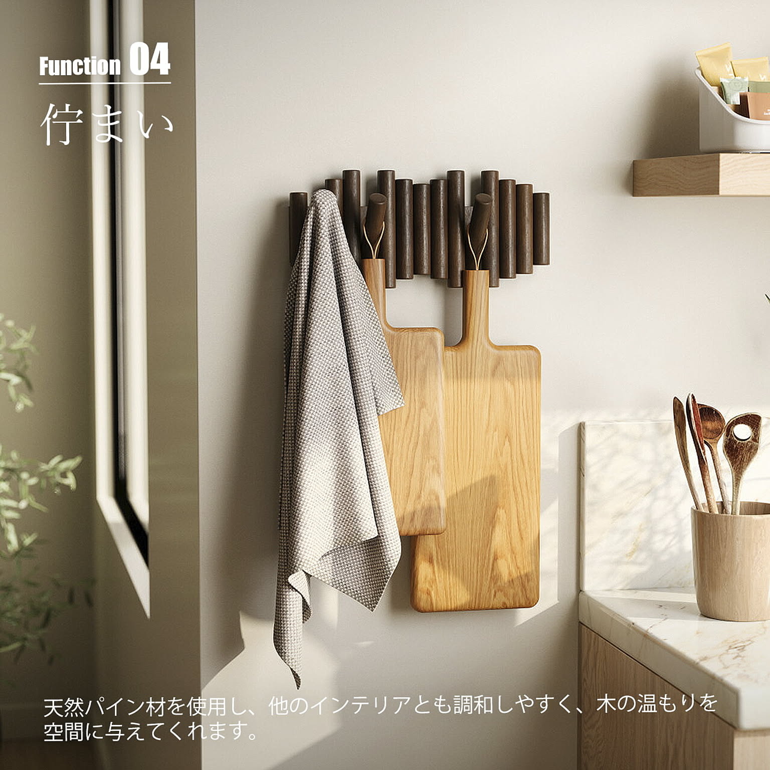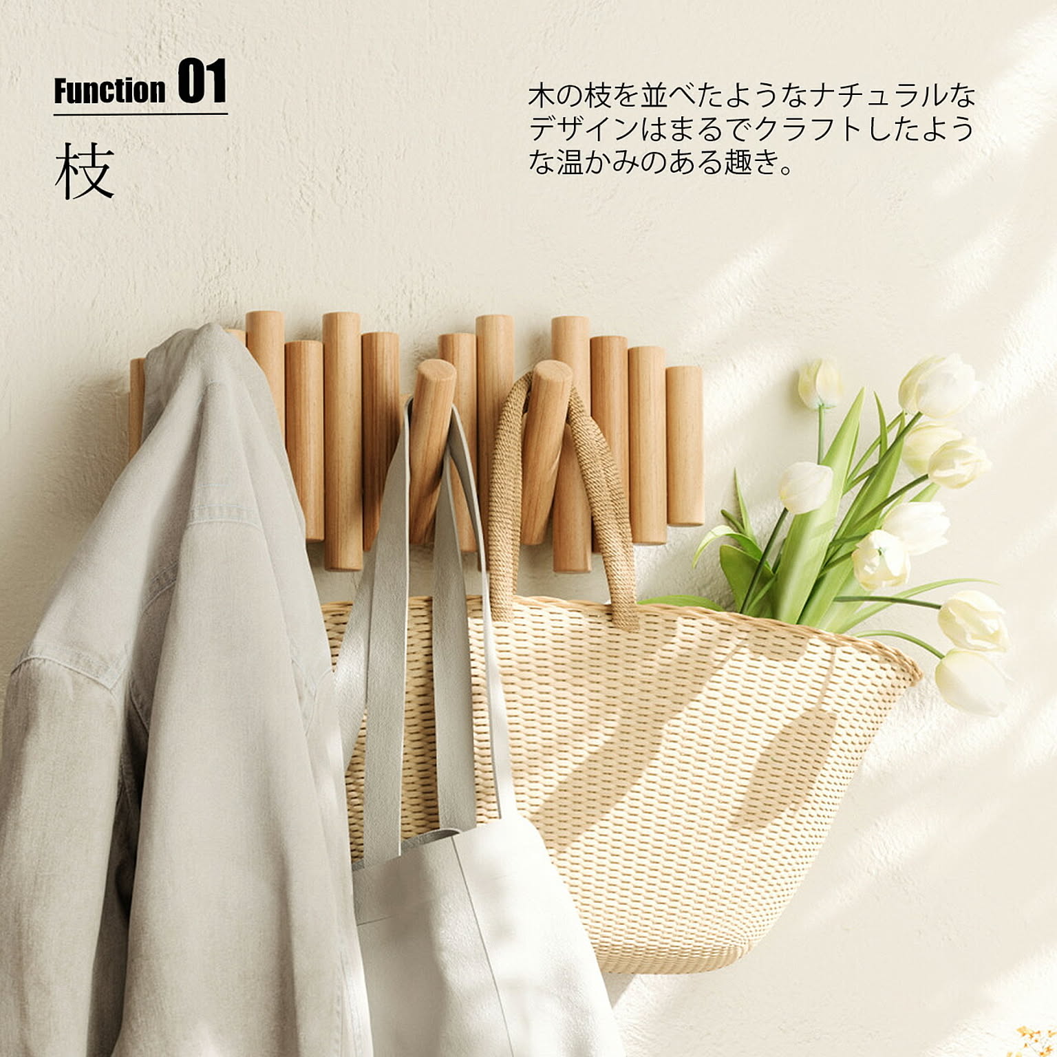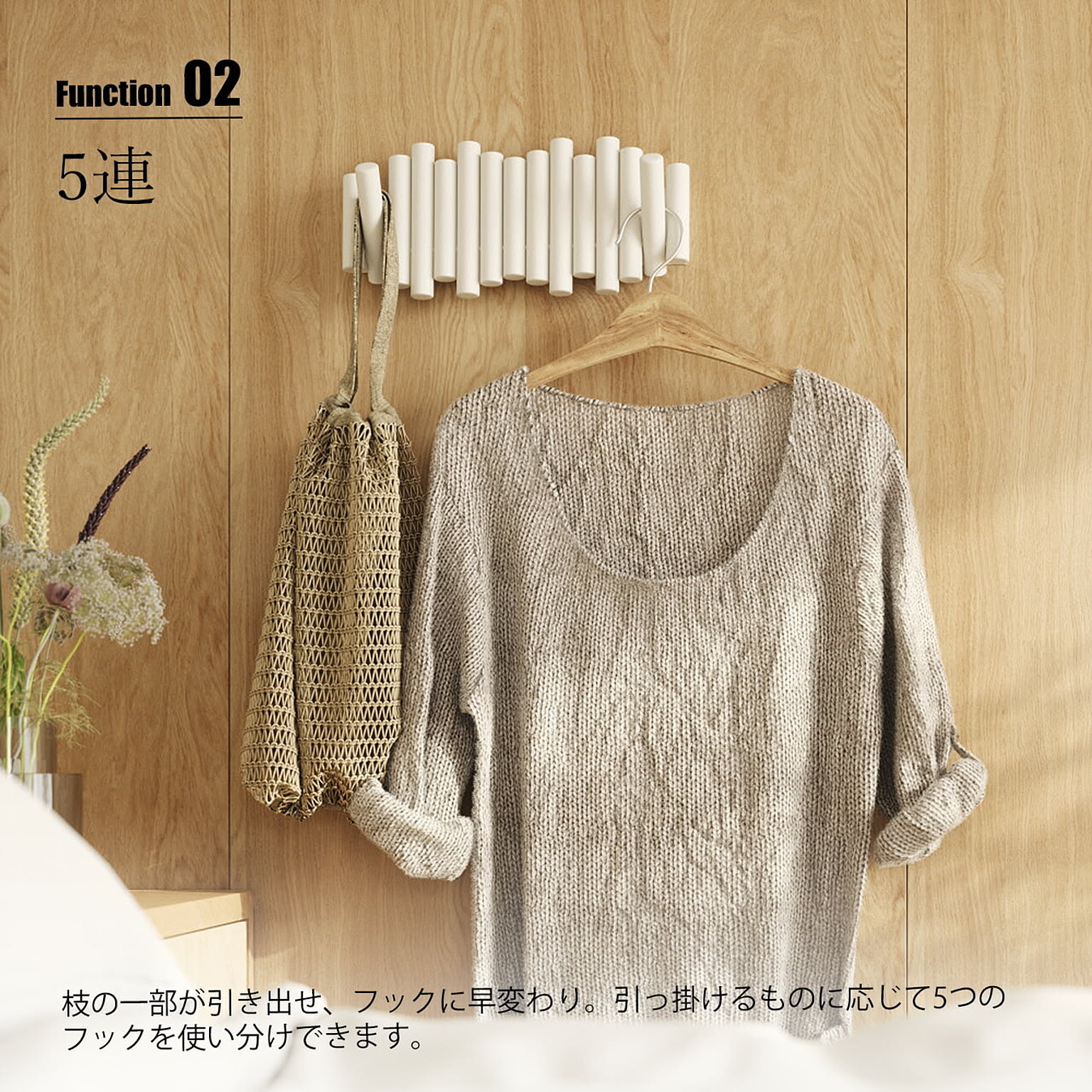 木の枝を並べたようなナチュラルなデザインの5連ウォールフック。使用するときには枝の一部がフリップしてフックになり、使用しない時は収納できるギミックのような楽しさがあります。壁面オブジェのような佇まいで、使用時も未使用時もオシャレに空間を演出してくれます。天然パイン材を使用し、他のインテリアとも調和しやすく、木の温もりを空間に与えてくれます。