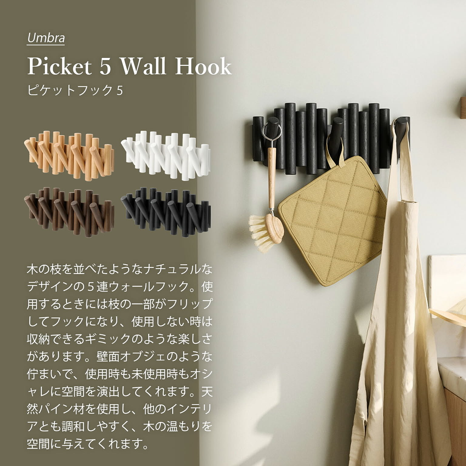 Umbra アンブラ Picket 5 Wall Hook ピケットフック 5 / 5連フック ハンガーフック 壁面収納 コートハンガー バッグハンガー インテリア 収納 天然木