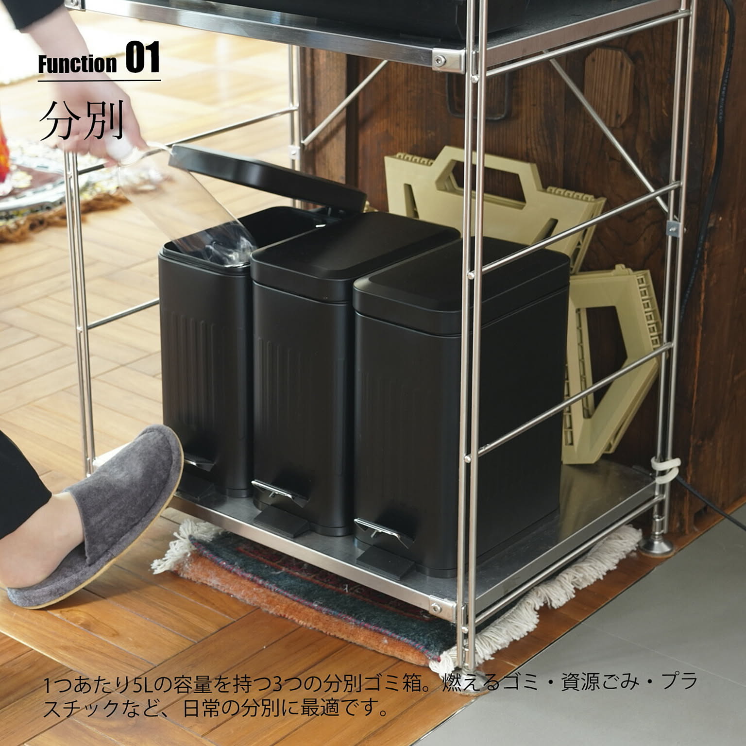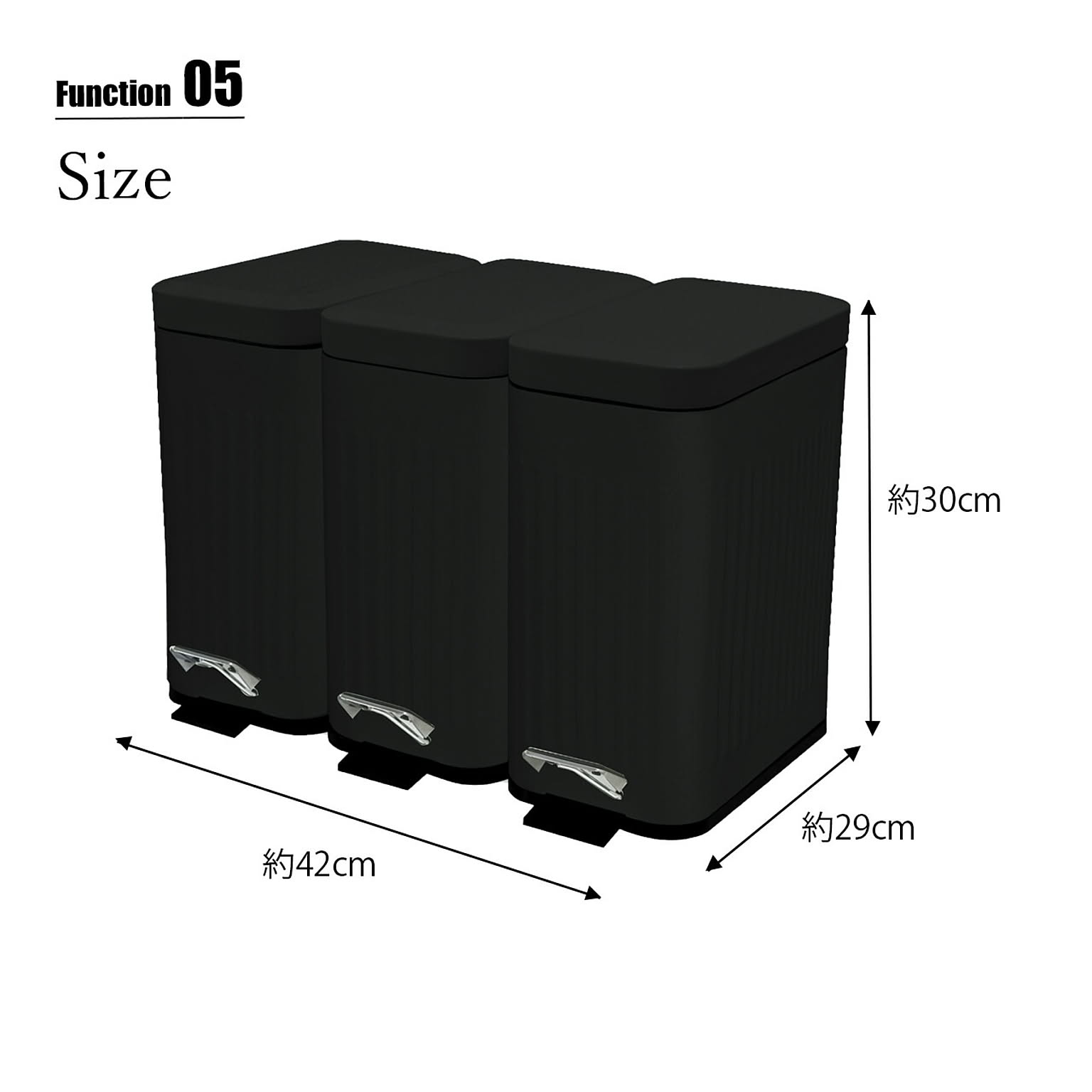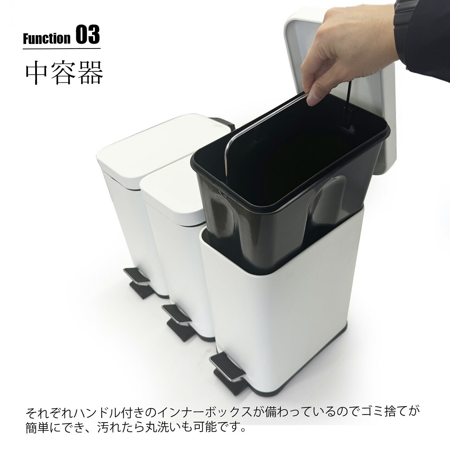 省スペースながら機能性に優れた、1つあたり5Lの容量を持つ3つの分別ゴミ箱。燃えるゴミ・資源ごみ・プラスチックなど、日常の分別に最適です。フタはゆっくりと静かに閉まる仕様で、開閉時の音を軽減。キッチンやオフィスなど、静かな空間でも快適にご使用いただけます。それぞれインナーボックスを備え、取り外し可能で、お手入れやゴミの入れ替えも簡単。マットなモノトーンカラー展開で、どんなインテリアにも自然に馴染みます。