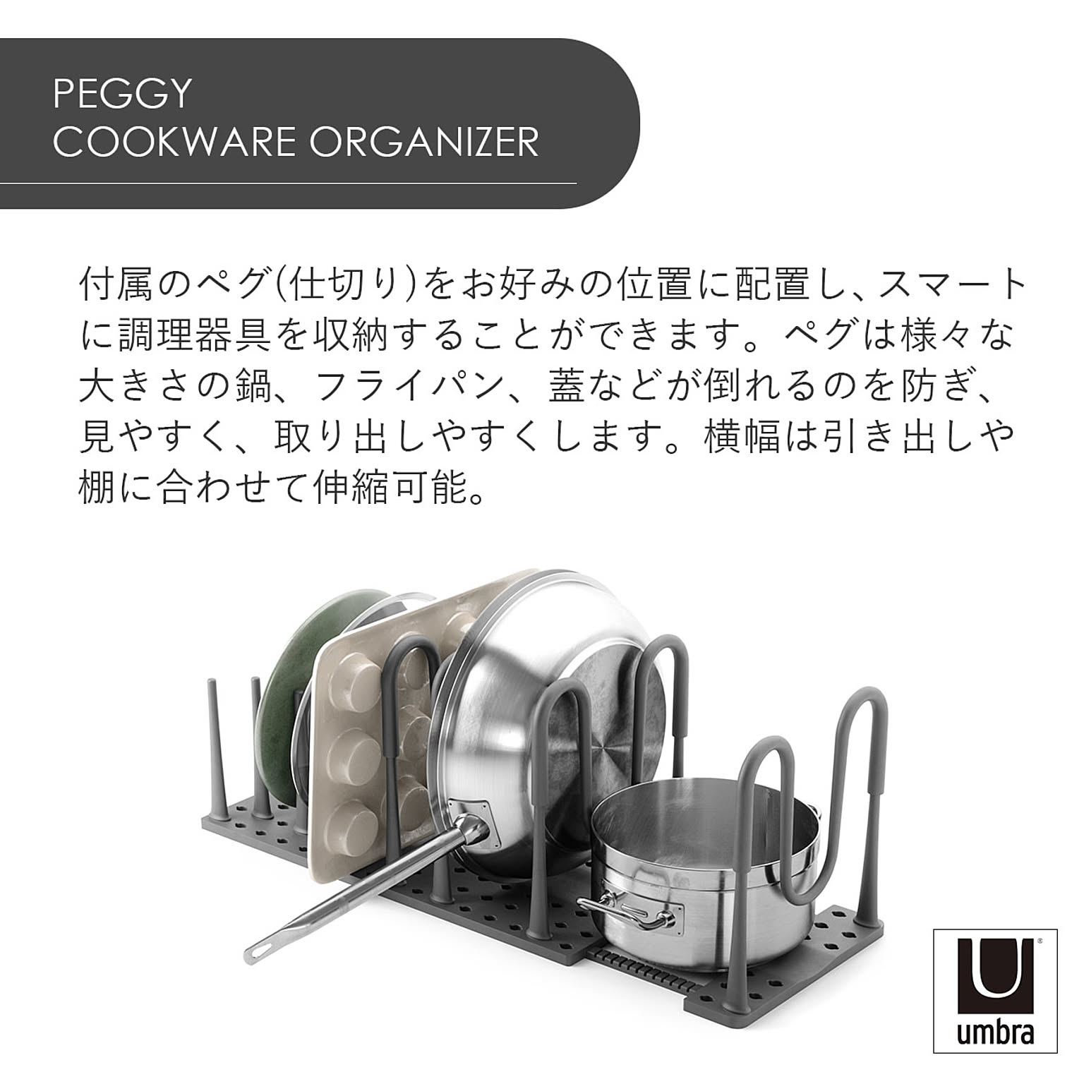 付属のペグ(仕切り)をお好みの位置に配置し、スマートに調理器具を収納することができます。ペグは様々な大きさの鍋、フライパン、蓋などが倒れるのを防ぎ、見やすく取り出しやすくします。横幅は引き出しや棚に合わせて伸縮可能。