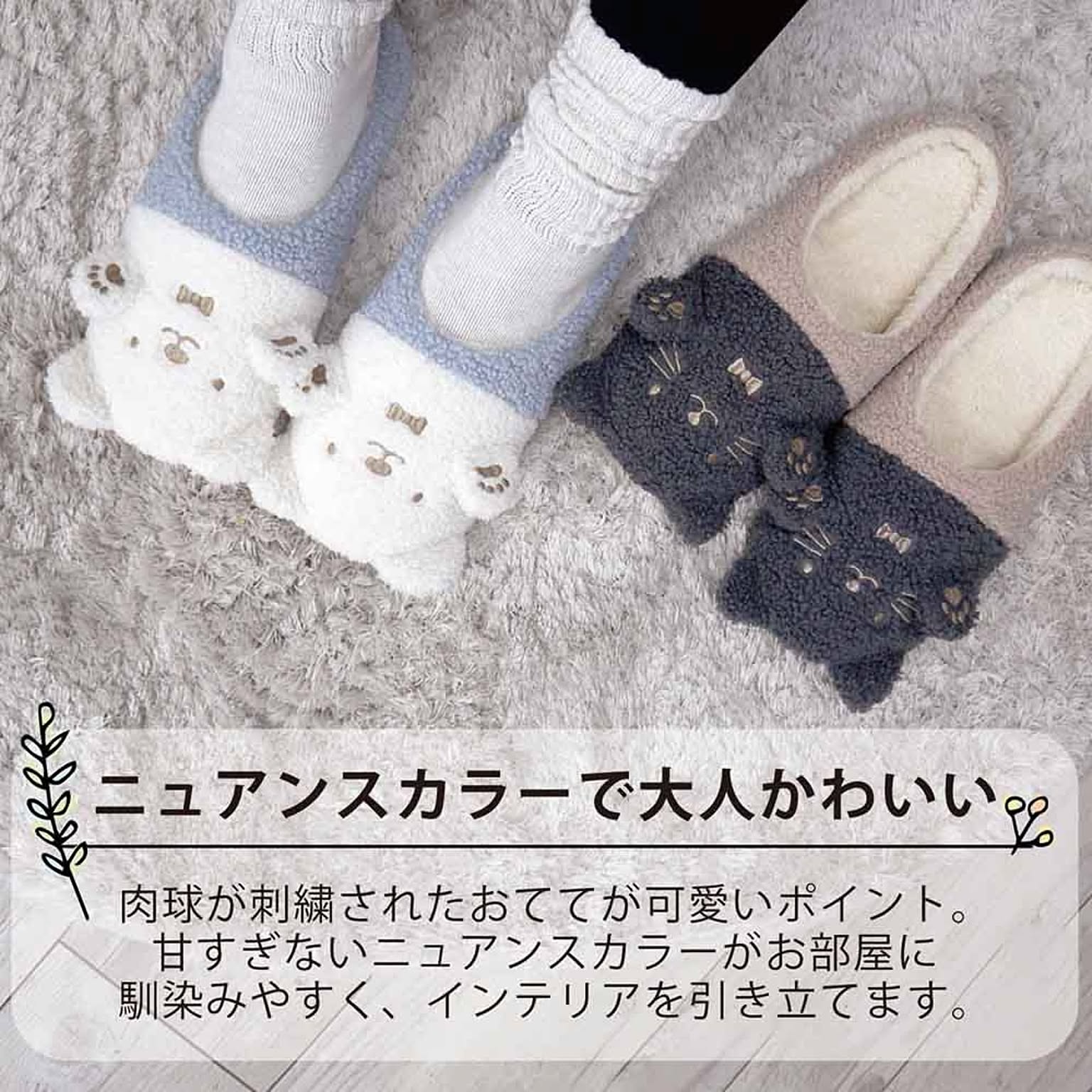 寒い季節にぴったり、くまさんの形がかわいいふんわりもこもこスリッパです。 くまさんの表情や肉球はすべてゴールドの刺繍糸で大人っぽさも演出。 立体的なデザインで足元も軽やかに履いて楽しいスリッパです。 ●商品サイズ(cm) 幅約26×奥行約30×高さ約8 ●商品重量 約0.1kg ●材質 インソール:ファーボア 底材:スエード ●フリーサイズ 適用サイズ〜25cm ※洗濯不可