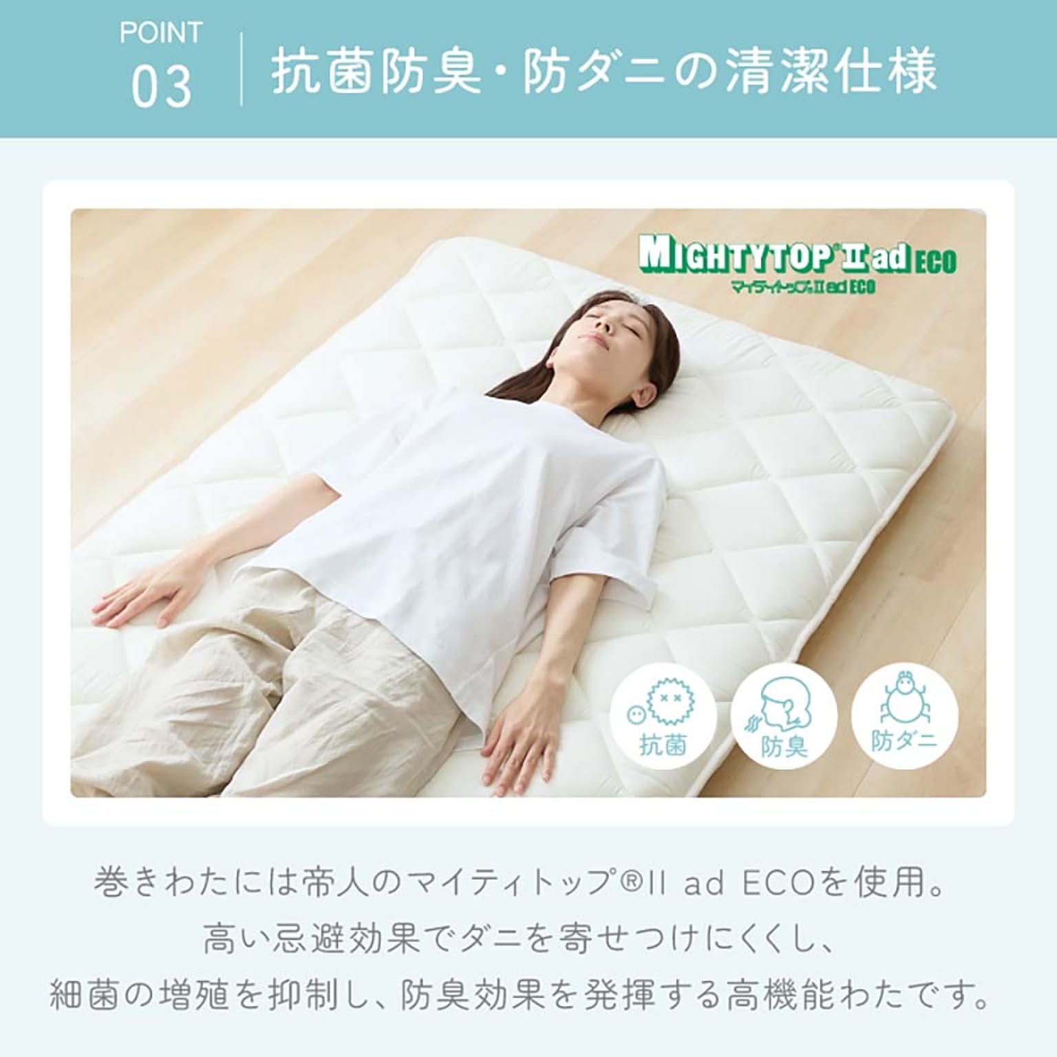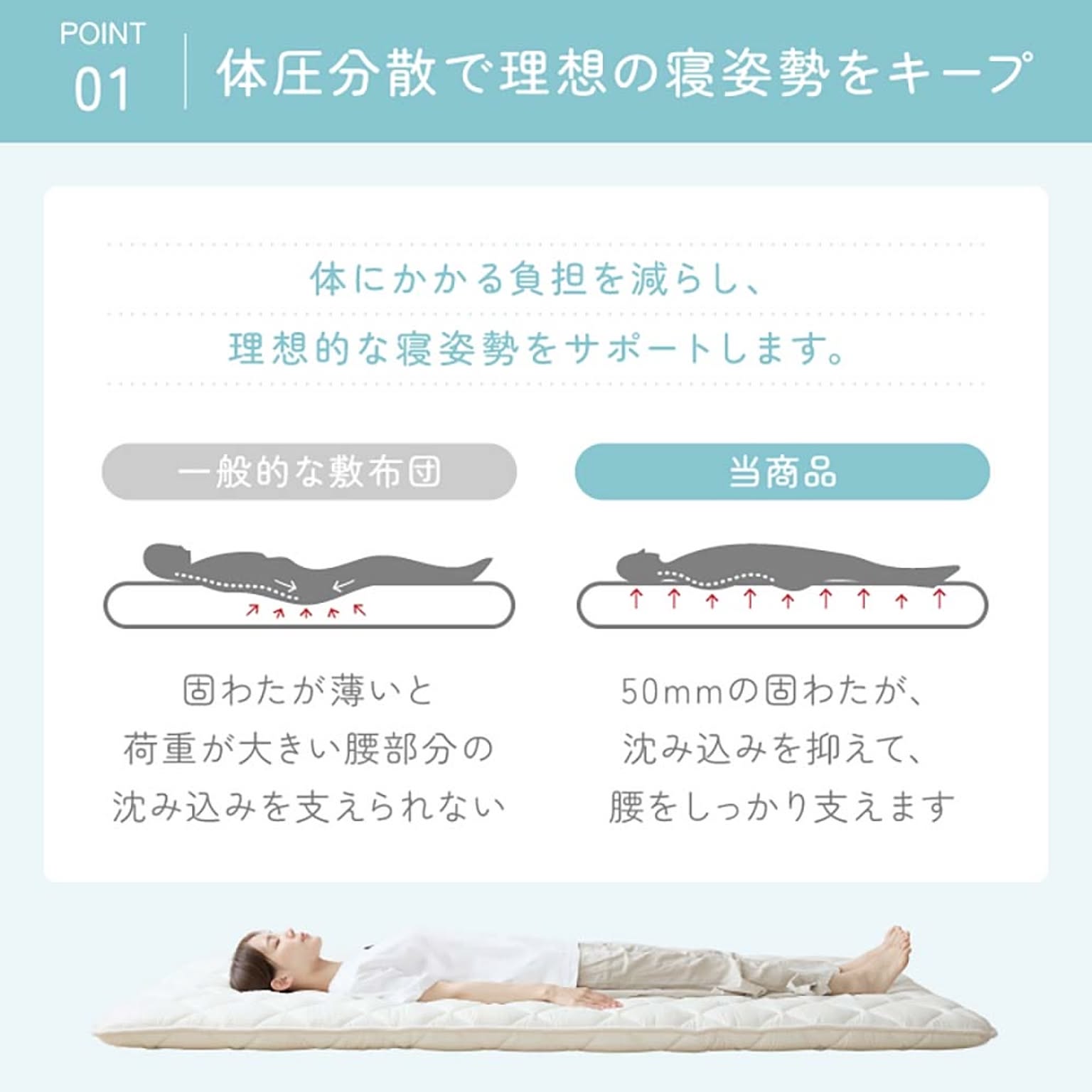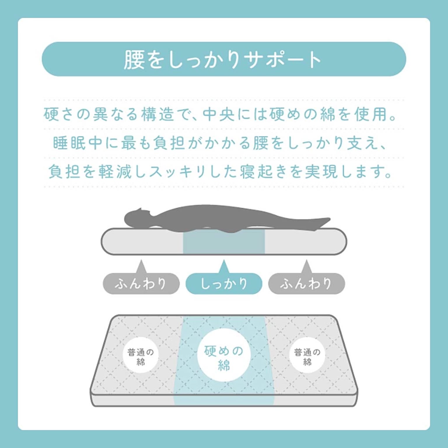 腰部部分を固めに設計して沈み込みを防ぎます。 それにより寝姿勢をサポートします。 ※お手入れは陰干しをしてください ●商品サイズ(cm) 幅約100×奥行約210×高さ約7 ●商品重量 約4.4kg ●洗濯表示 陰干し