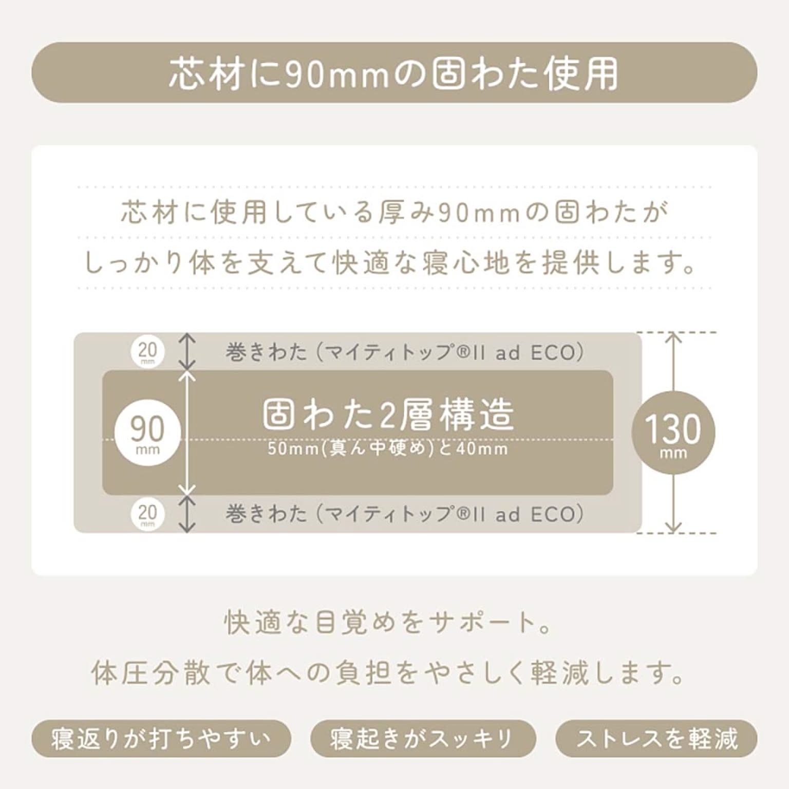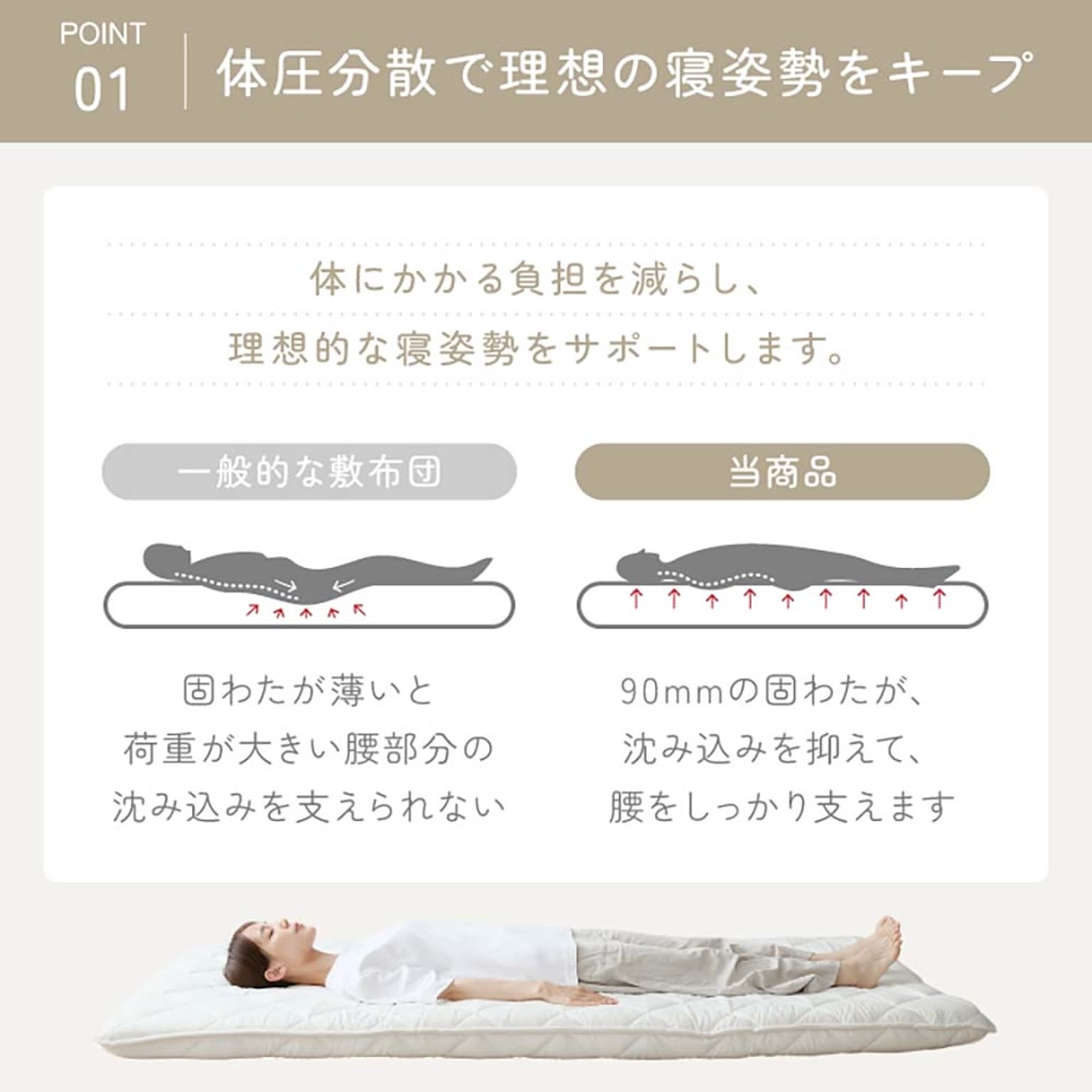 腰部部分を固めに設計して沈み込みを防ぎます。 それにより寝姿勢をサポートします。 ※お手入れは陰干しをしてください ●商品サイズ(cm) 幅約120×奥行約210×高さ約12 ●商品重量 約7kg ●洗濯表示 陰干し