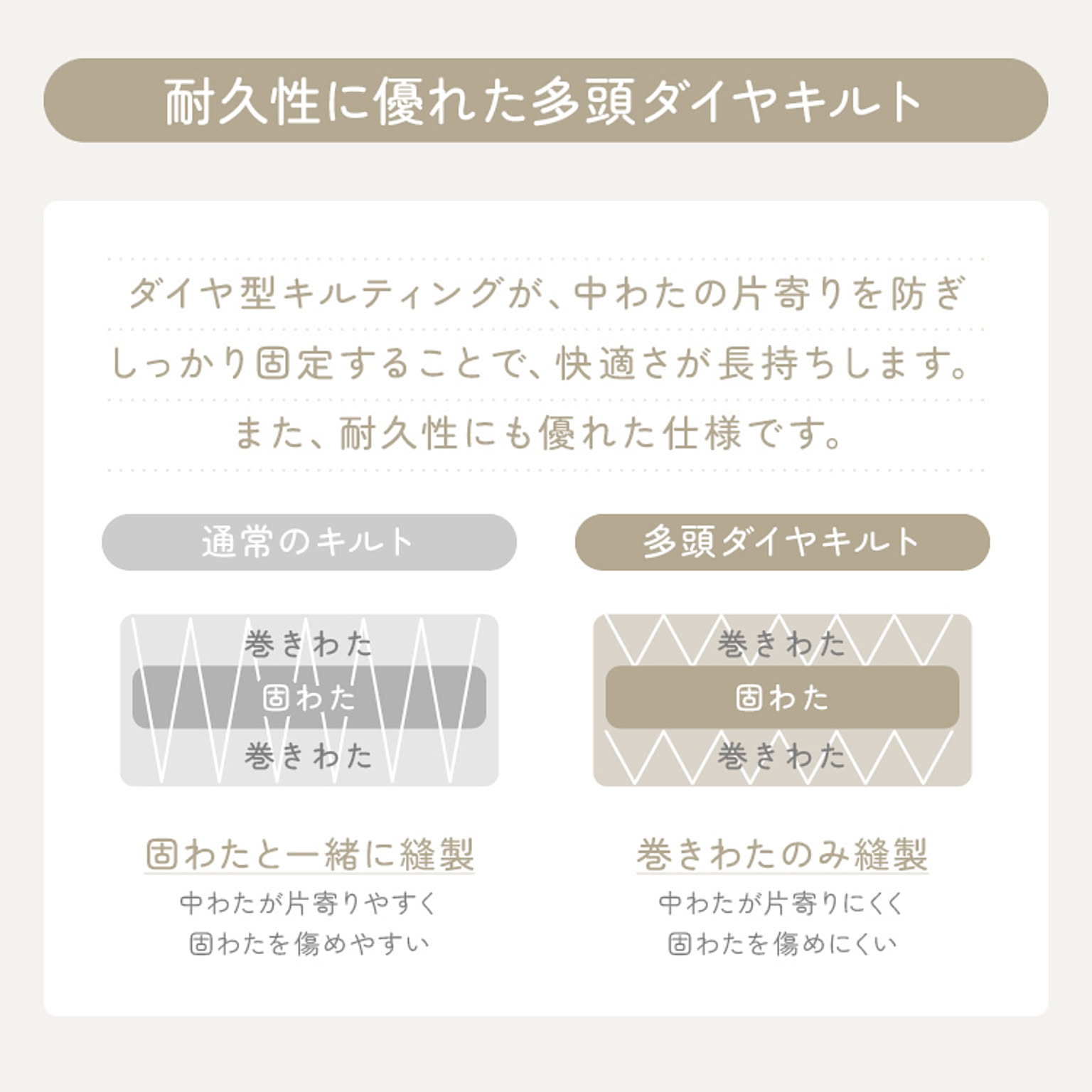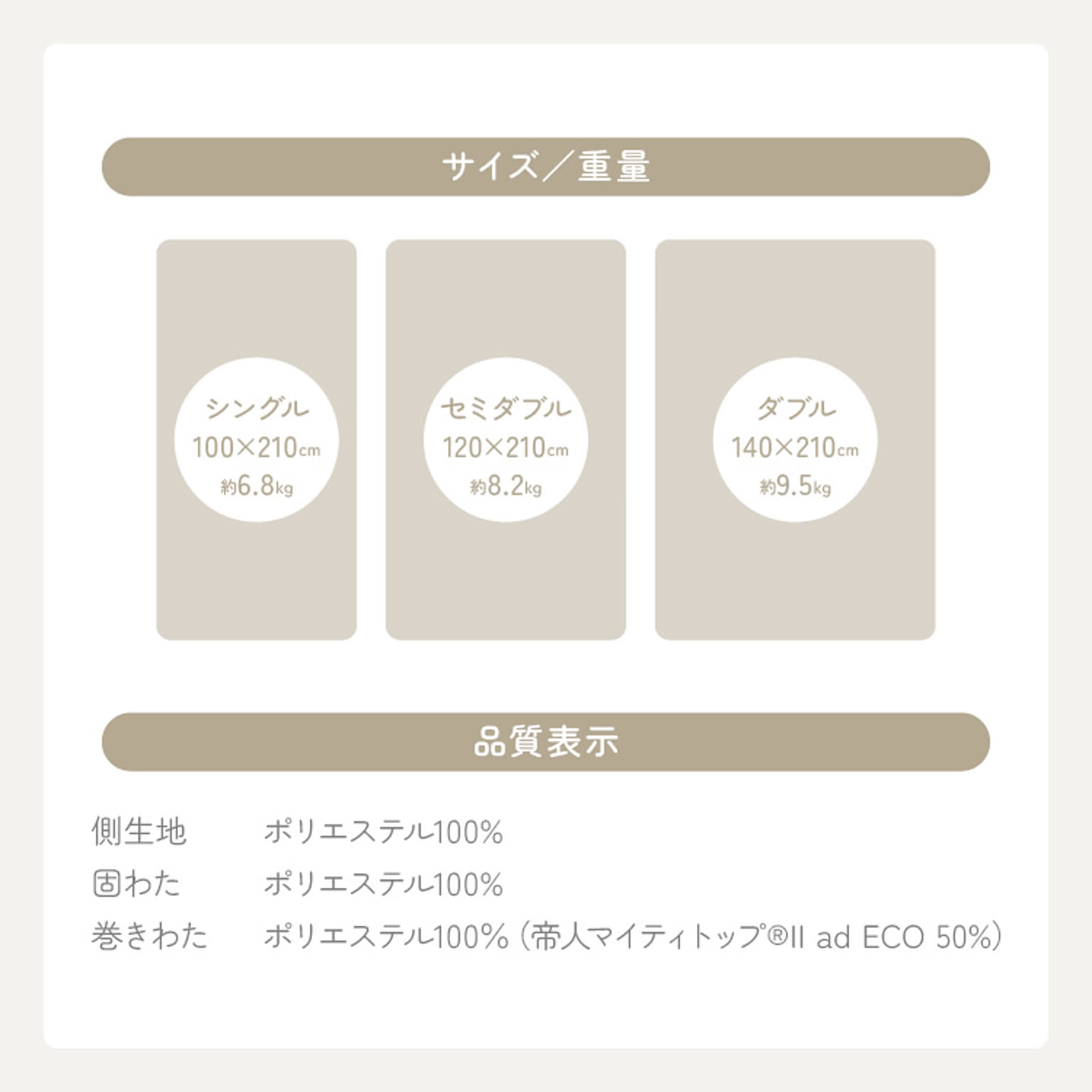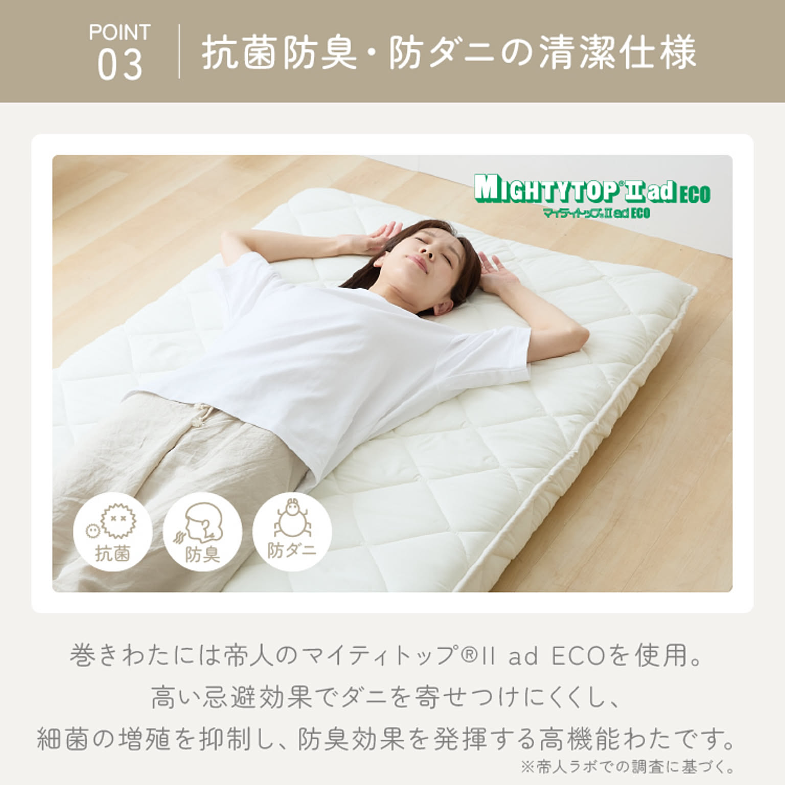 腰部部分を固めに設計して沈み込みを防ぎます。 それにより寝姿勢をサポートします。 ※お手入れは陰干しをしてください ●商品サイズ(cm) 幅約120×奥行約210×高さ約13 ●商品重量 約8.2kg ●洗濯表示 陰干し