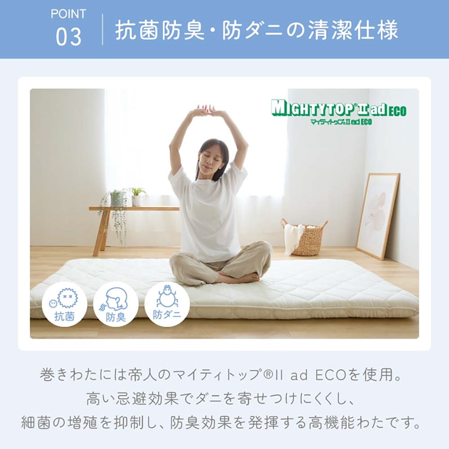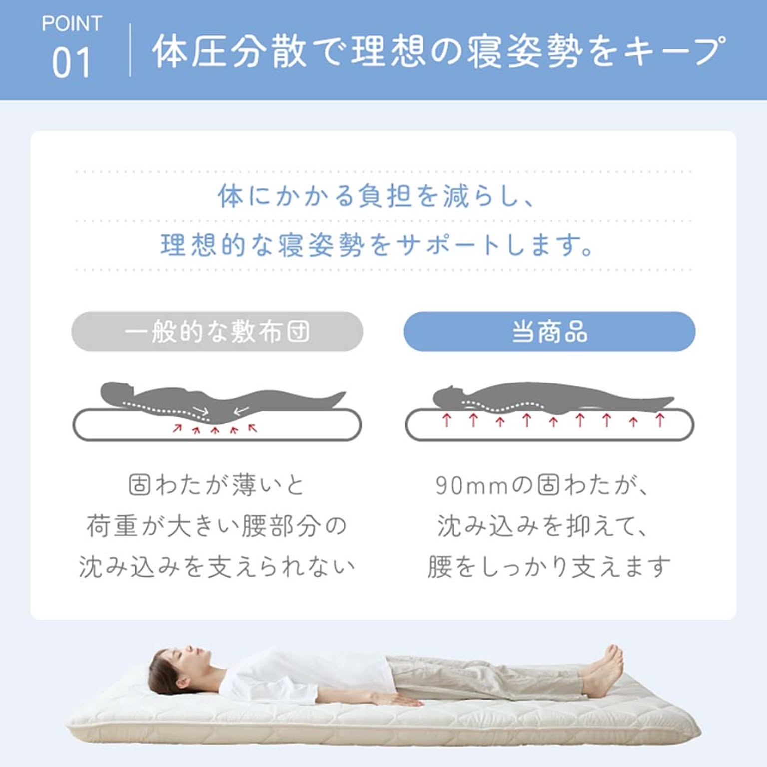 中芯を三枚重ねているのでしっかり床付き感もなく極厚仕様になります。 ※お手入れは陰干しをしてください ●商品サイズ(cm) 幅約120×奥行約210×高さ約12 ●商品重量 約7kg ●洗濯表示 陰干し