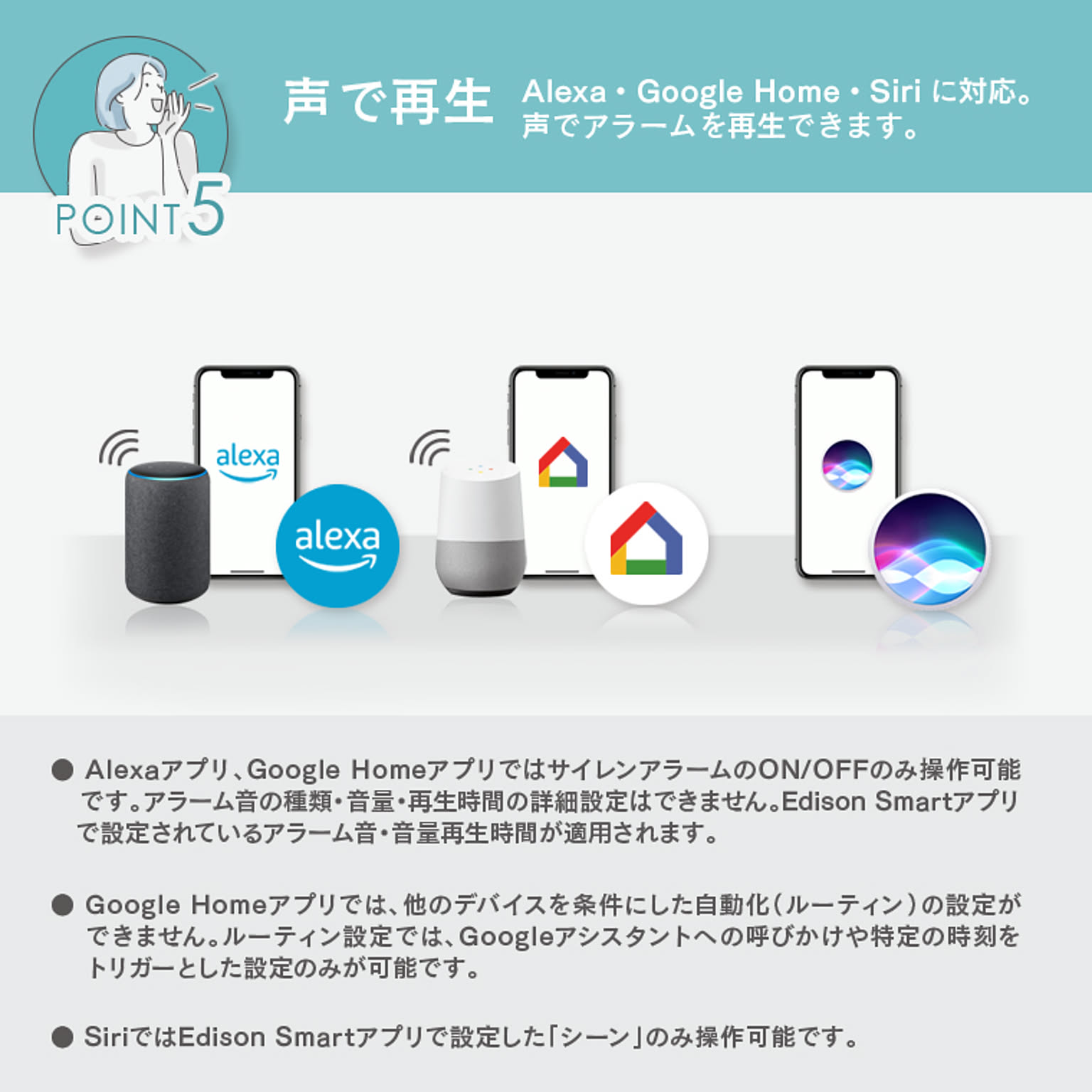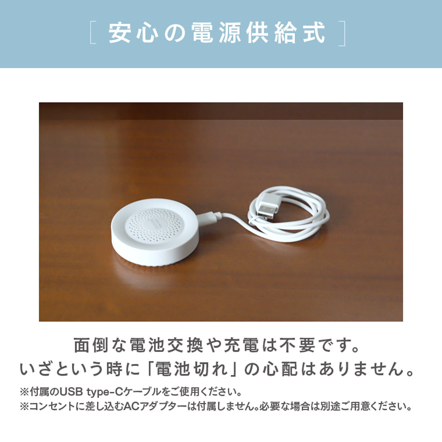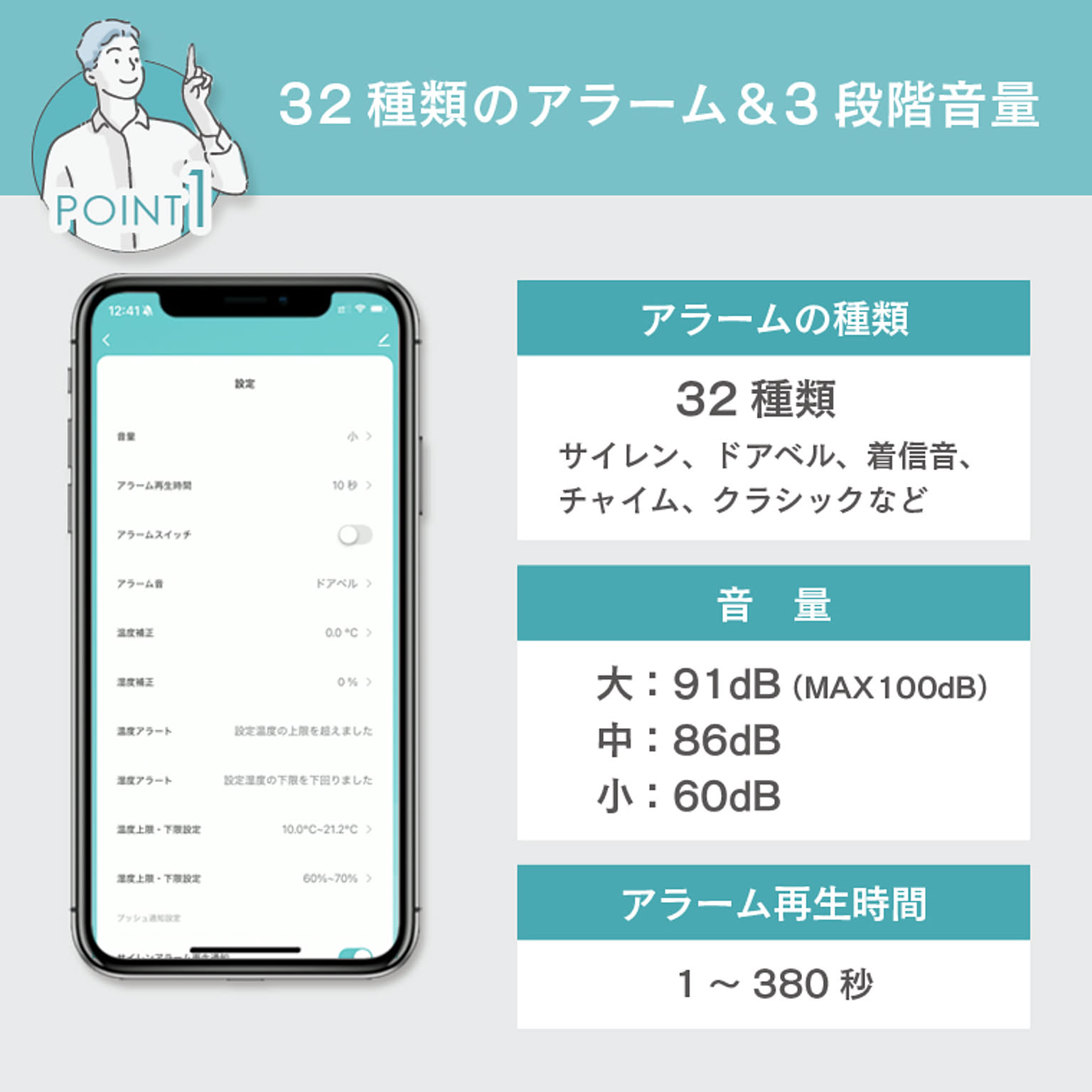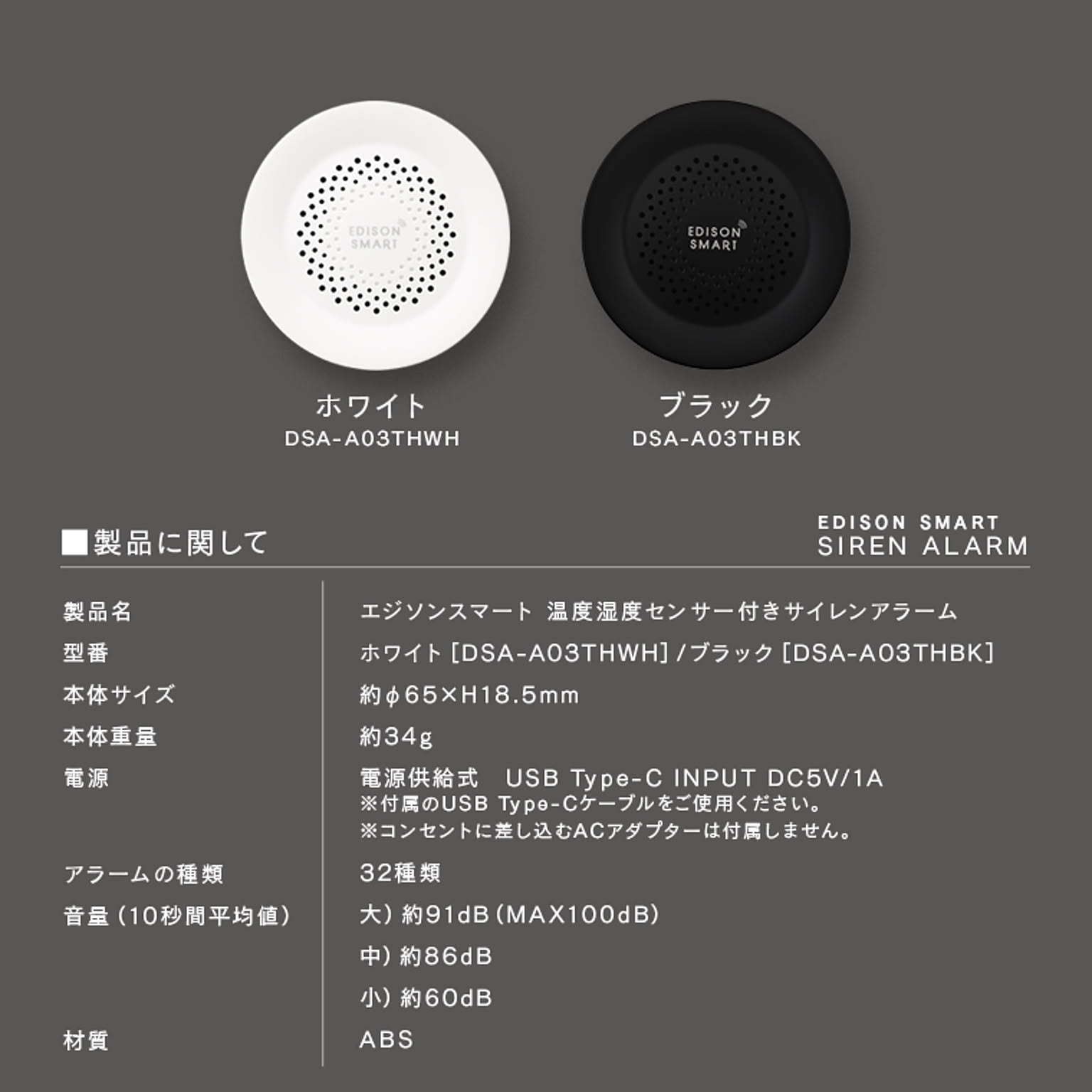 | 仕様 | ■電源・仕様 ・入力:DC5V/1A (Type-C) ・アラームの種類: 32種類 ・音量(10秒間平均値): 大)約91dB (MAX100dB) 中)約86dB 小)約60dB ・温度測定範囲:-20~60℃(測定精度: ±1℃) ・湿度測定範囲:0~100%(測定精度: ±5%) ■通信・ネットワーク ・通信方法:Wi-Fi ・使用周波数帯域:2.4GHz帯(5GHz帯では接続できません) ・準拠規格:IEEE 802.11b/g/n ・暗号化形式:WPA/WPA2 ・対応OS:iOS11.0以上/Android12.0以上 ・スマートスピーカー:Amazon Echo(Amazon Alexa)/Google Home(Google Assistant)対応 ・メーカー保証期間:1年間 ※IPv4にのみ対応(ネットワーク環境やWi-FiルーターがIPv6にしか対応していない場合はデバイス登録ができません。) 本製品は、国内電波法に基づく特定無線設備の技術基準適合証明などを受けた製品です。 |