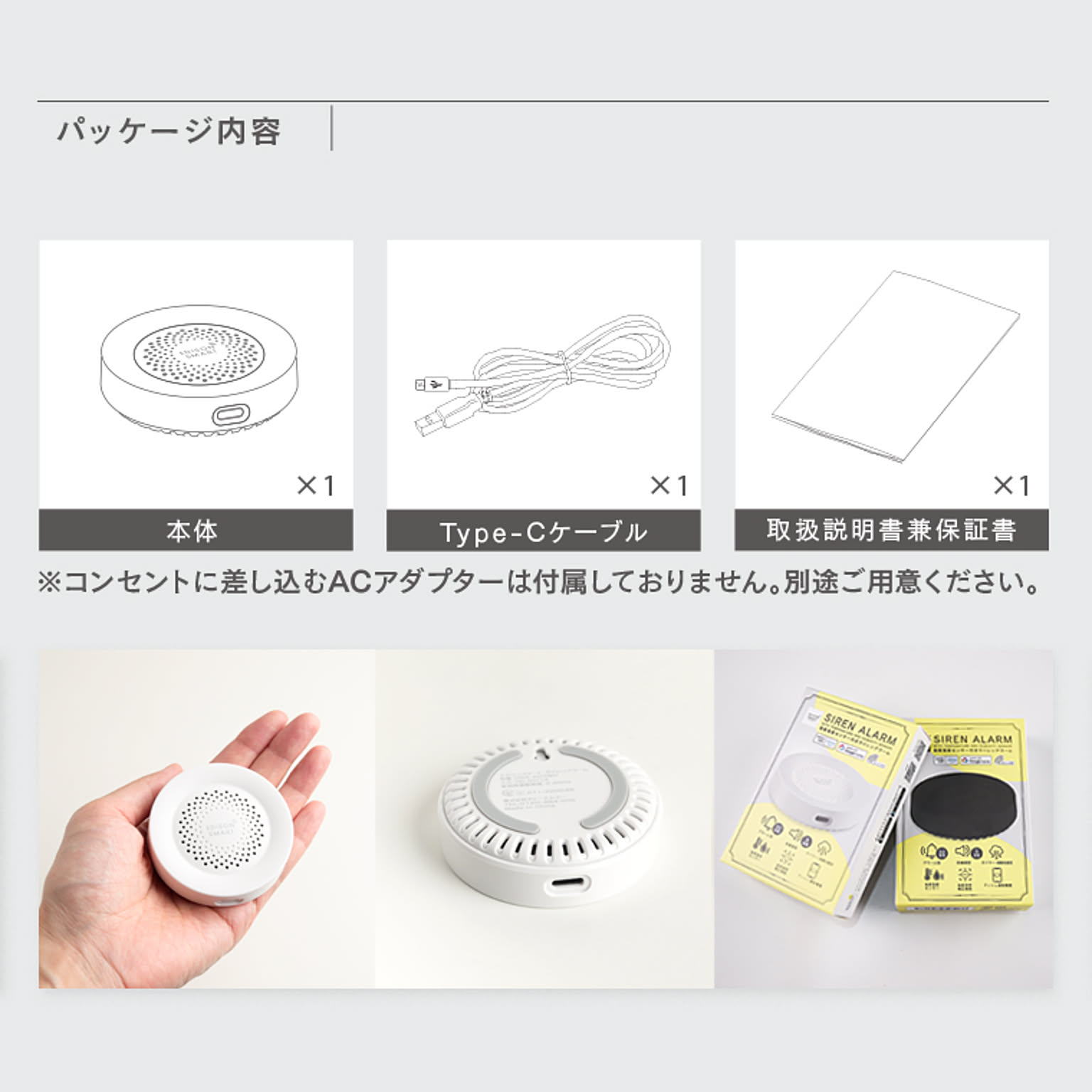 | パッケージ内容 | サイレンアラーム本体×1、Type-Cケーブル×1、取扱説明書兼保証書×1 ※コンセントに差し込むACアダプターは付属しておりません。別途ご用意ください。 |