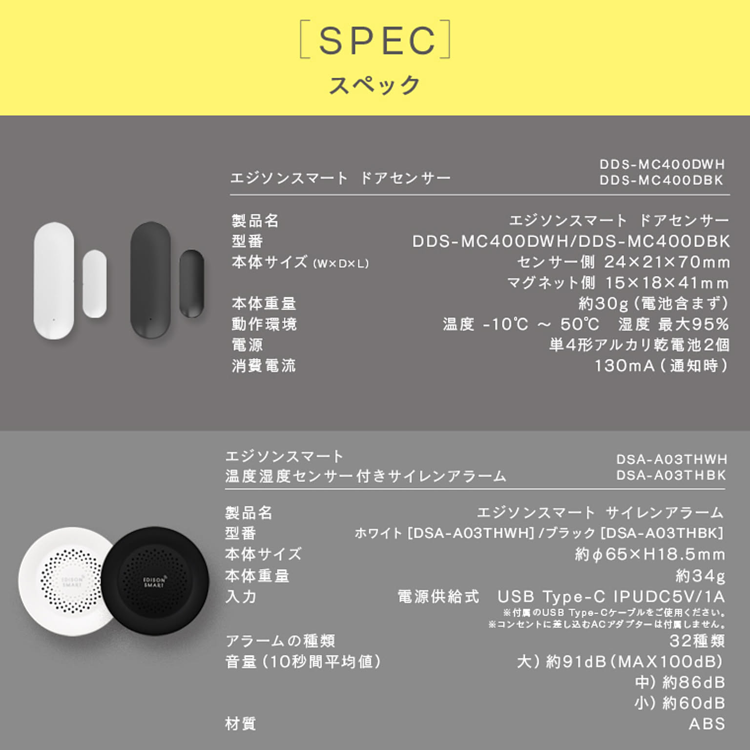 | 仕様1 | 【ドアセンサー】 ■環境・電源 ・電源:単4形アルカリ乾電池2個 ・消費電流:130mA(通知時) ・動作環境:温度-10℃~50℃、湿度最大95% 【サイレンアラーム】 ■環境・電源 ・入力:DC5V/1A (Type-C) ・アラームの種類: 32種類 ・音量(10秒間平均値): 大)約91dB (MAX100dB) 中)約86dB 小)約60dB ・温度測定範囲:-20~60℃(測定精度: ±1℃) ・湿度測定範囲:0~100%(測定精度: ±5%) |