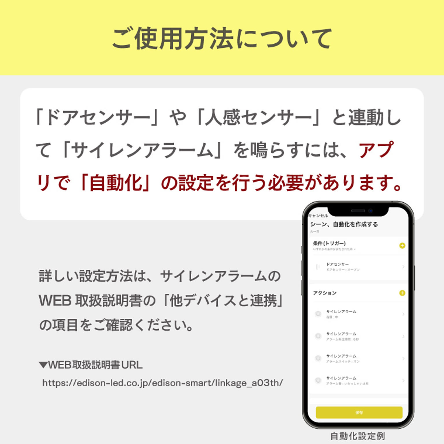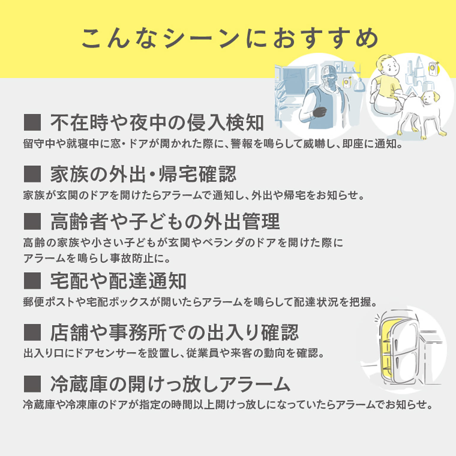 | 注意事項2 | ※ドアセンサーは鏡や鉄製品、水槽などに設置すると電波が反射し誤作動を起こす場合がございますので、ご注意ください。 ※ドアセンサーを天井や壁に取り付ける場合は必ず付属のネジ・アンカーを使用して固定してください。落下の原因となります。 ※ドアセンサーの両面テープでの設置は、水や湿気のある場所、結露が出る場所、強い振動が加わる場所などでは、粘着力が低下し落下する恐れがあります。 ※お買い上げ後の取り付け場所の移設、落下などによる故障や損傷、およびそれによって生じた人身事故、火災事故などが発生した場合、当社はいかなる責任も負いかねます。 ※本製品は防犯、事故防止、個人情報取得、医療用での使用は意図されていません。これらの使用目的によって生じた損害に対して、当社はいかなる責任も負いかねます。 その他取扱説明書をよくお読みの上ご使用ください。 |