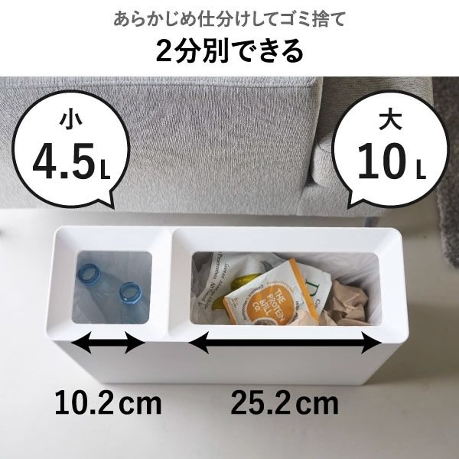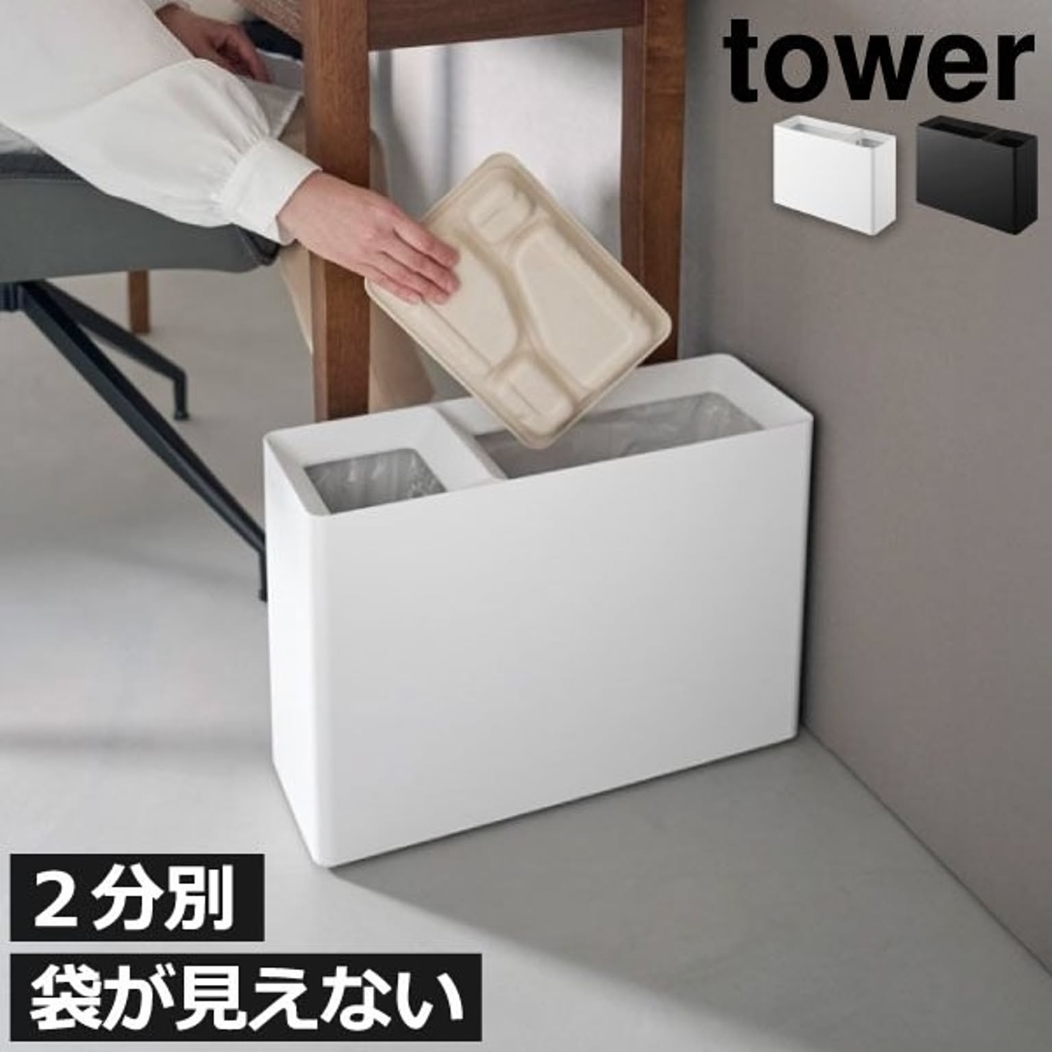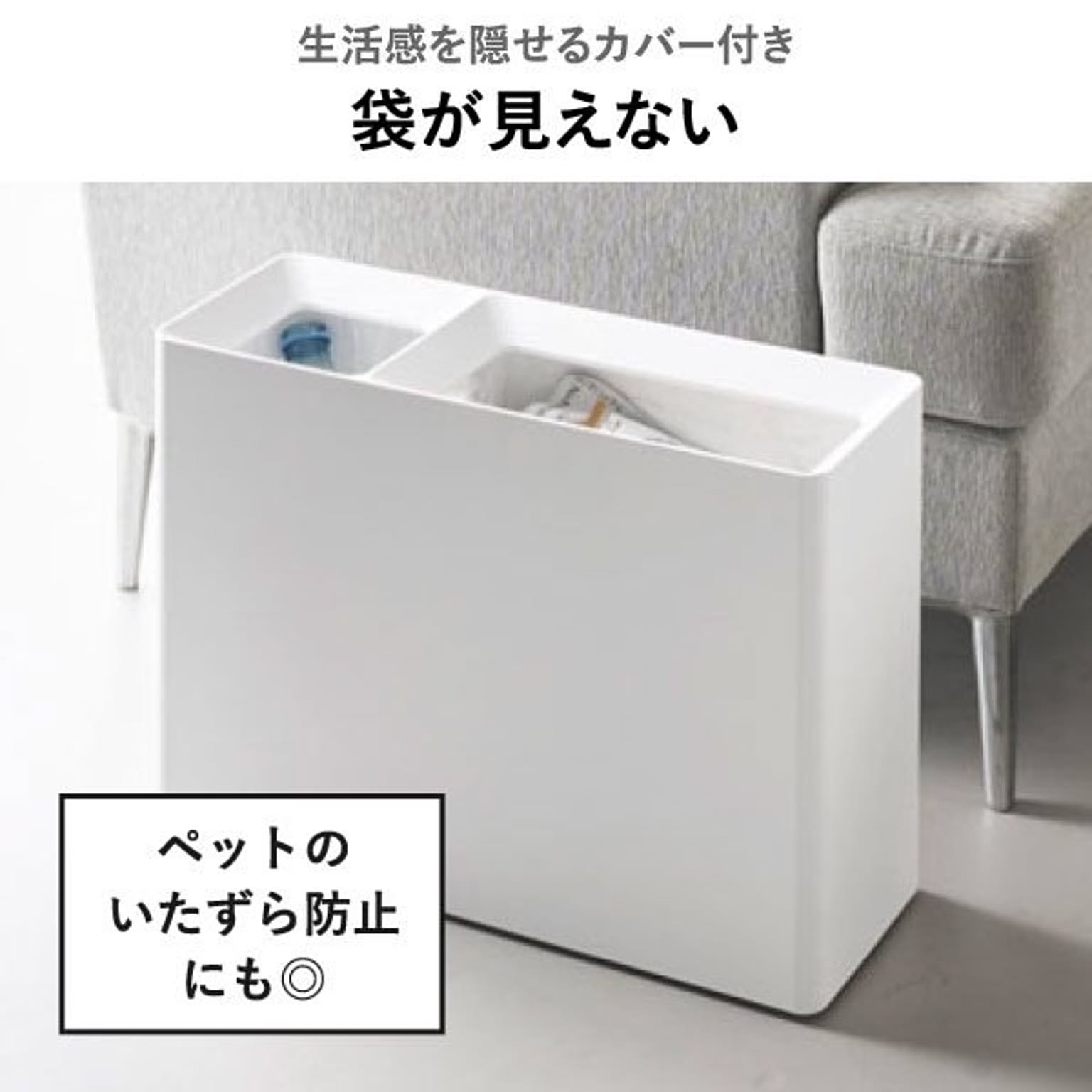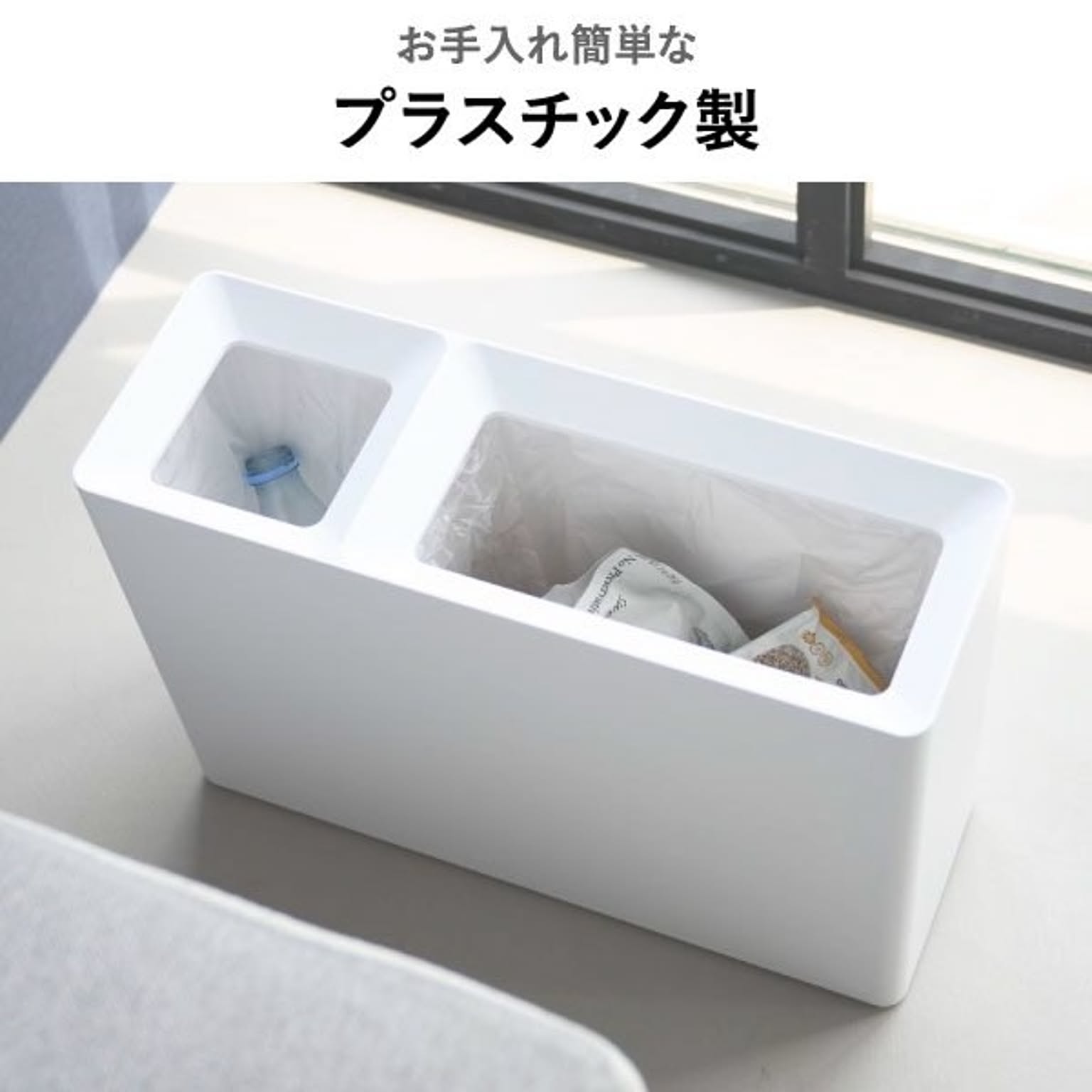 1つで2分別できるtowerシリーズのスリムでおしゃれな分別ゴミ箱です。 無駄がなくおしゃれなデザインが、リビングや寝室など、様々なインテリアに溶け込んでくれます。 分別ゴミ箱の開口部は小と大に分かれているので、分別しながらゴミ捨て可能。 小にはペットボトルや缶、大には通常の燃えるゴミ、とそれぞれ仕分けることができます。 ポリ袋をゴミ箱本体に取り付けて、上からカバーを被せるだけの簡単セット。 本体にはスリットが入っているので、楽に袋を引っ掛けることができます。 奥行きがスリムなゴミ箱だから、ソファやデスク横などのちょっとした隙間に設置可能。 分別ゴミ箱をすっぽり覆うカバーが付いているので、中の袋を隠して生活感をオフ。 フタなしタイプの分別ゴミ箱だから、捨てる動作がワンアクションで完了できます。 分別ゴミ箱にはハンドルが付いていて、ゴミを集める際もスムーズに持ち運べます。 お手入れ簡単なプラスチック製なので、いつも清潔な状態に保てます。 スタイリッシュでおしゃれなデザインのゴミ箱だから、ご家庭だけでなくホテルでも活躍。 宿泊客が容易にゴミを分別できて、ホテル側の作業効率もアップします。 スーパーやコンビニの弁当容器もストレスなく捨てることができて便利。 おしゃれな分別ゴミ箱は、ホワイトとブラックの2色からお選びいただけます。 いつもの生活に便利な分別ゴミ箱を取り入れて、よりおしゃれな空間に。