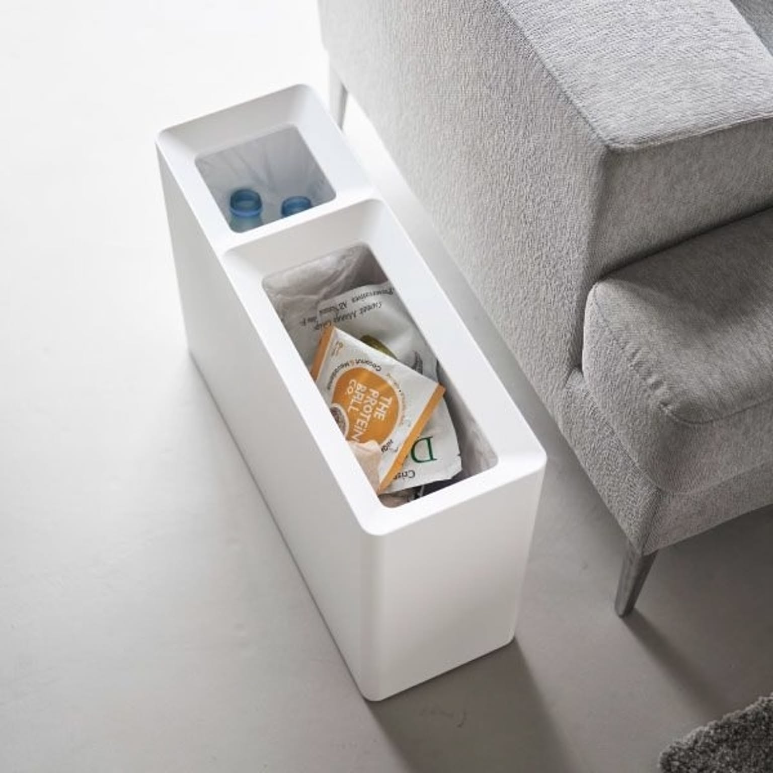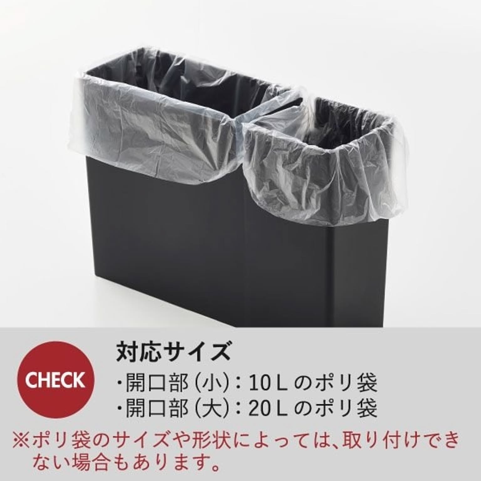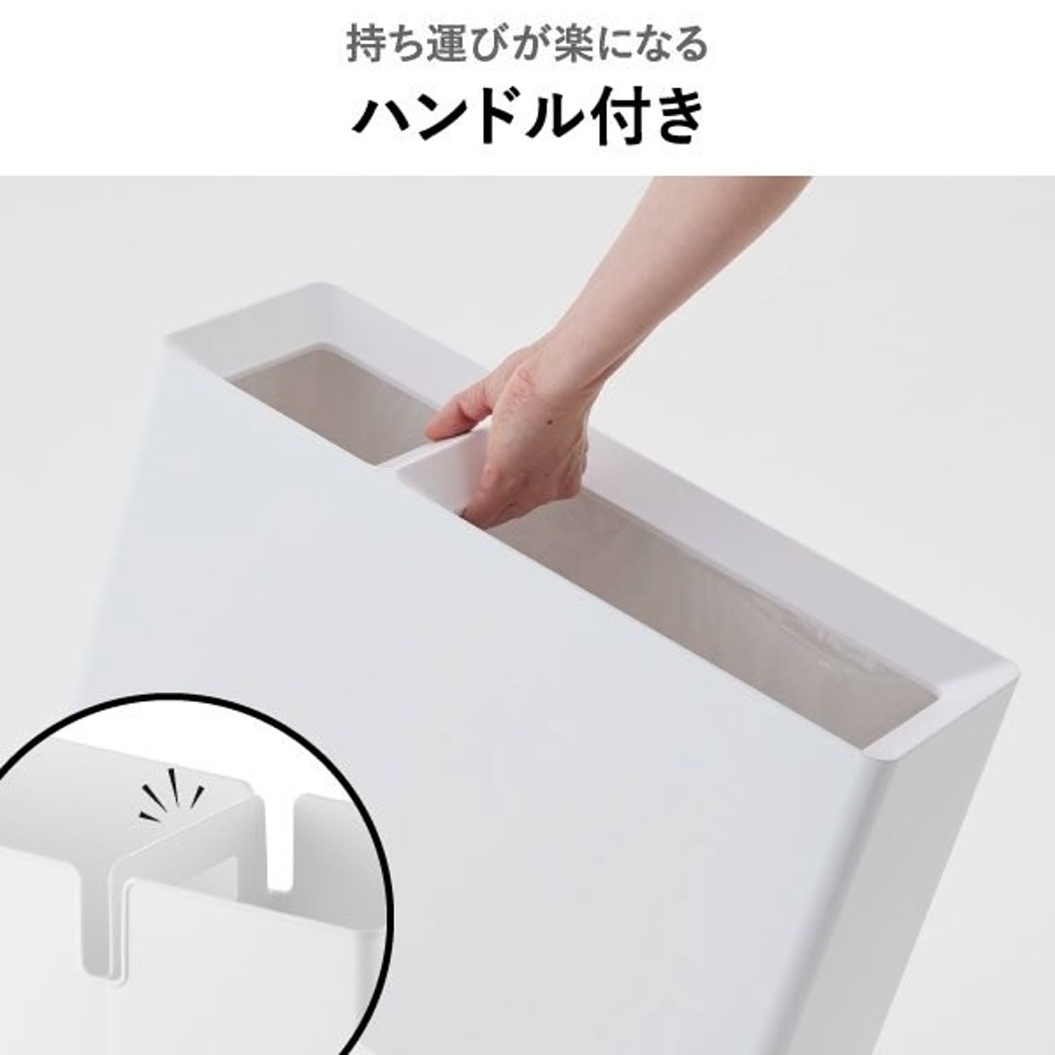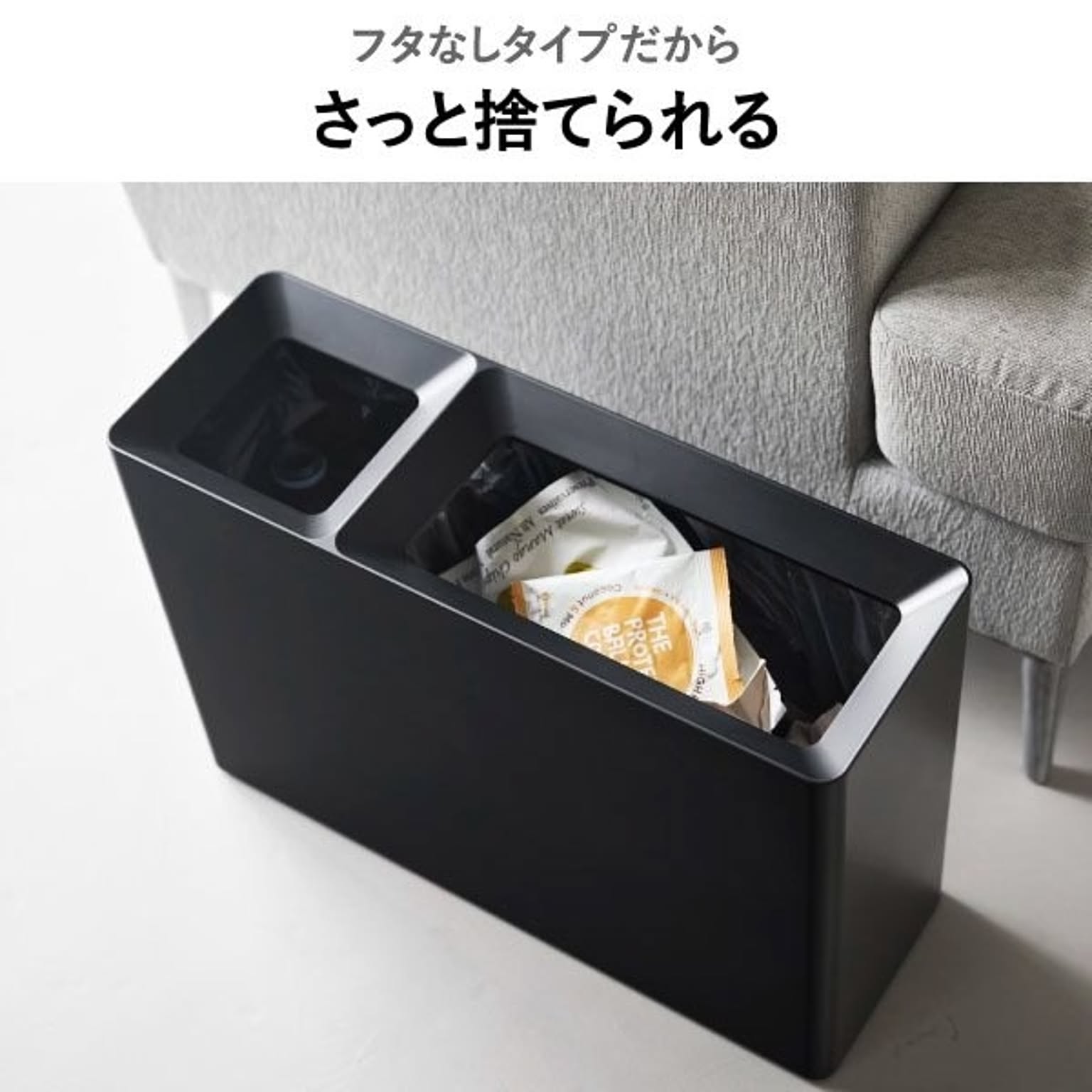 1つで2分別できるtowerシリーズのスリムでおしゃれな分別ゴミ箱です。 無駄がなくおしゃれなデザインが、リビングや寝室など、様々なインテリアに溶け込んでくれます。 分別ゴミ箱の開口部は小と大に分かれているので、分別しながらゴミ捨て可能。 小にはペットボトルや缶、大には通常の燃えるゴミ、とそれぞれ仕分けることができます。 ポリ袋をゴミ箱本体に取り付けて、上からカバーを被せるだけの簡単セット。 本体にはスリットが入っているので、楽に袋を引っ掛けることができます。 奥行きがスリムなゴミ箱だから、ソファやデスク横などのちょっとした隙間に設置可能。 分別ゴミ箱をすっぽり覆うカバーが付いているので、中の袋を隠して生活感をオフ。 フタなしタイプの分別ゴミ箱だから、捨てる動作がワンアクションで完了できます。 分別ゴミ箱にはハンドルが付いていて、ゴミを集める際もスムーズに持ち運べます。 お手入れ簡単なプラスチック製なので、いつも清潔な状態に保てます。 スタイリッシュでおしゃれなデザインのゴミ箱だから、ご家庭だけでなくホテルでも活躍。 宿泊客が容易にゴミを分別できて、ホテル側の作業効率もアップします。 スーパーやコンビニの弁当容器もストレスなく捨てることができて便利。 おしゃれな分別ゴミ箱は、ホワイトとブラックの2色からお選びいただけます。 いつもの生活に便利な分別ゴミ箱を取り入れて、よりおしゃれな空間に。