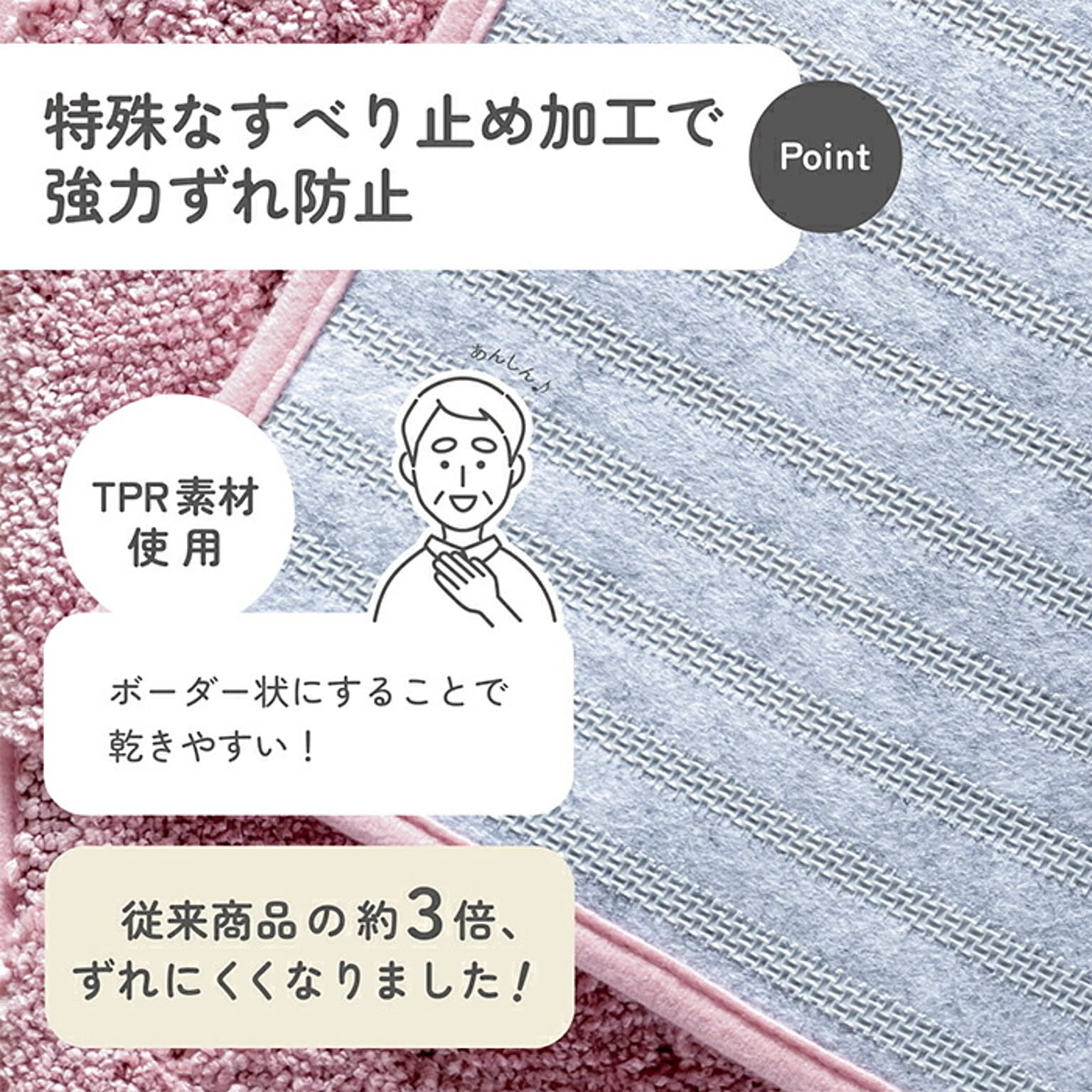 洗濯機で丸洗いができるのでお手入れが簡単に。すべり止め性能に優れたTPR素材を使用しています。抗菌基布使用でいつも清潔。