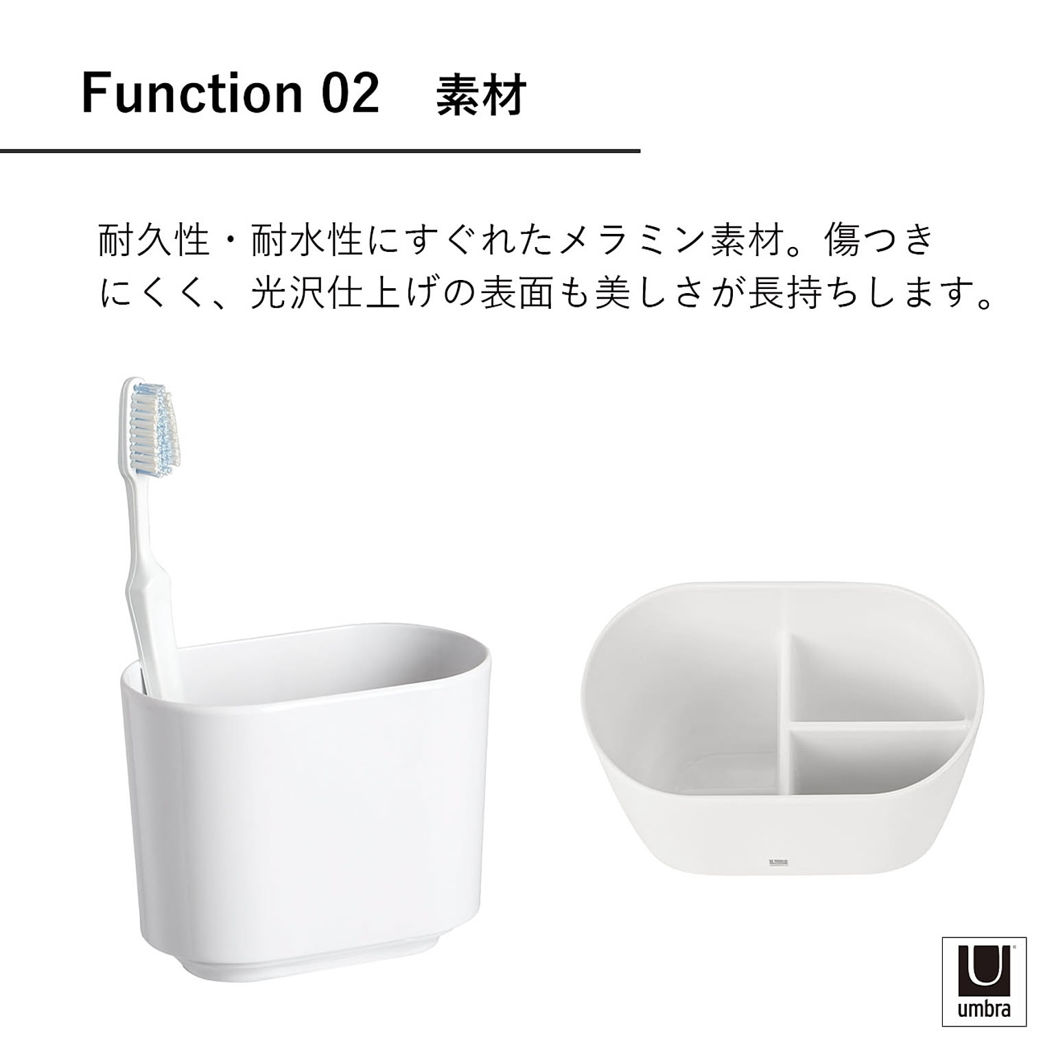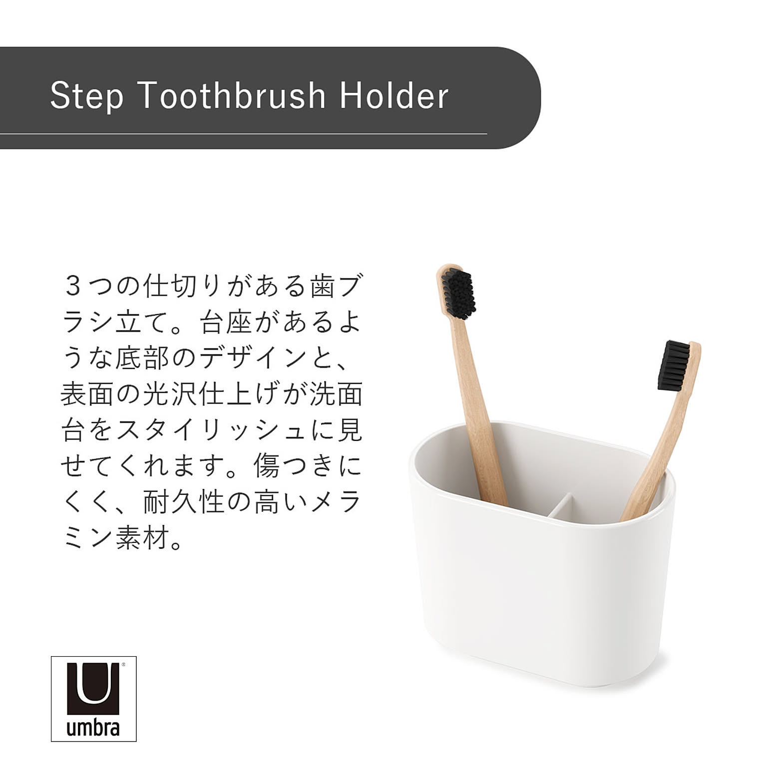 3つの仕切りがある歯ブラシ立て。台座があるような底部のデザインと、表面の光沢仕上げが洗面台をスタイリッシュに見せてくれます。傷つきにくく、耐久性の高いメラミン素材。