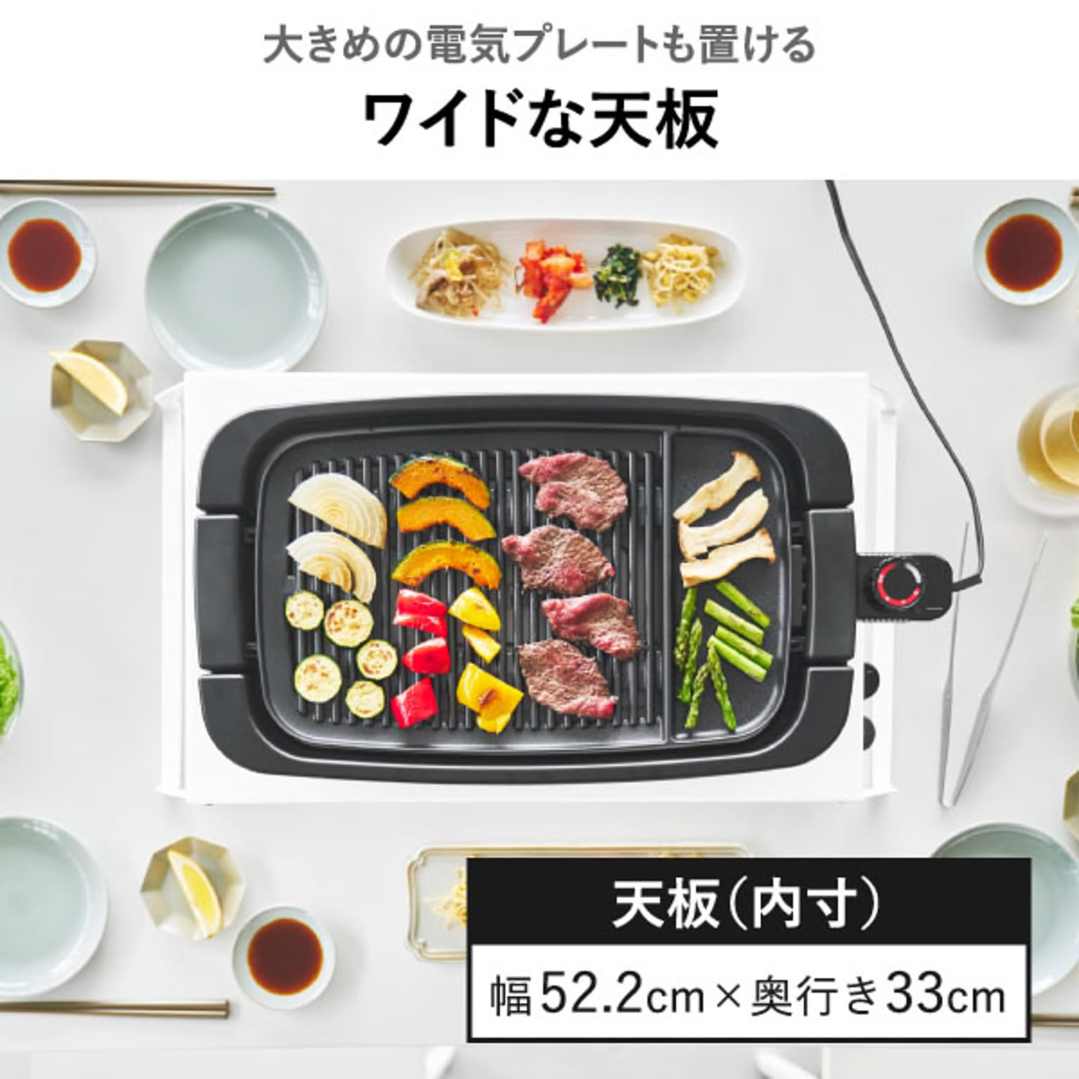 天板はワイドなので、大きめのホットプレートもゆったり載せられます。