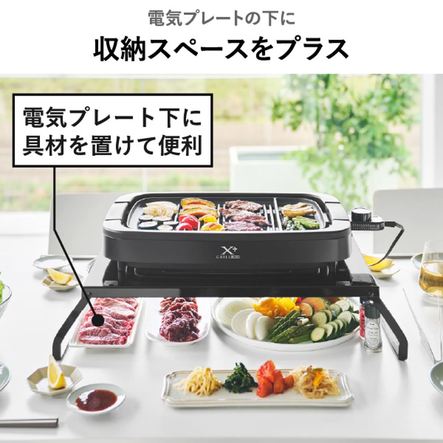 ホットプレート下に具材を収納することで、テーブルの上を広々と使えます。